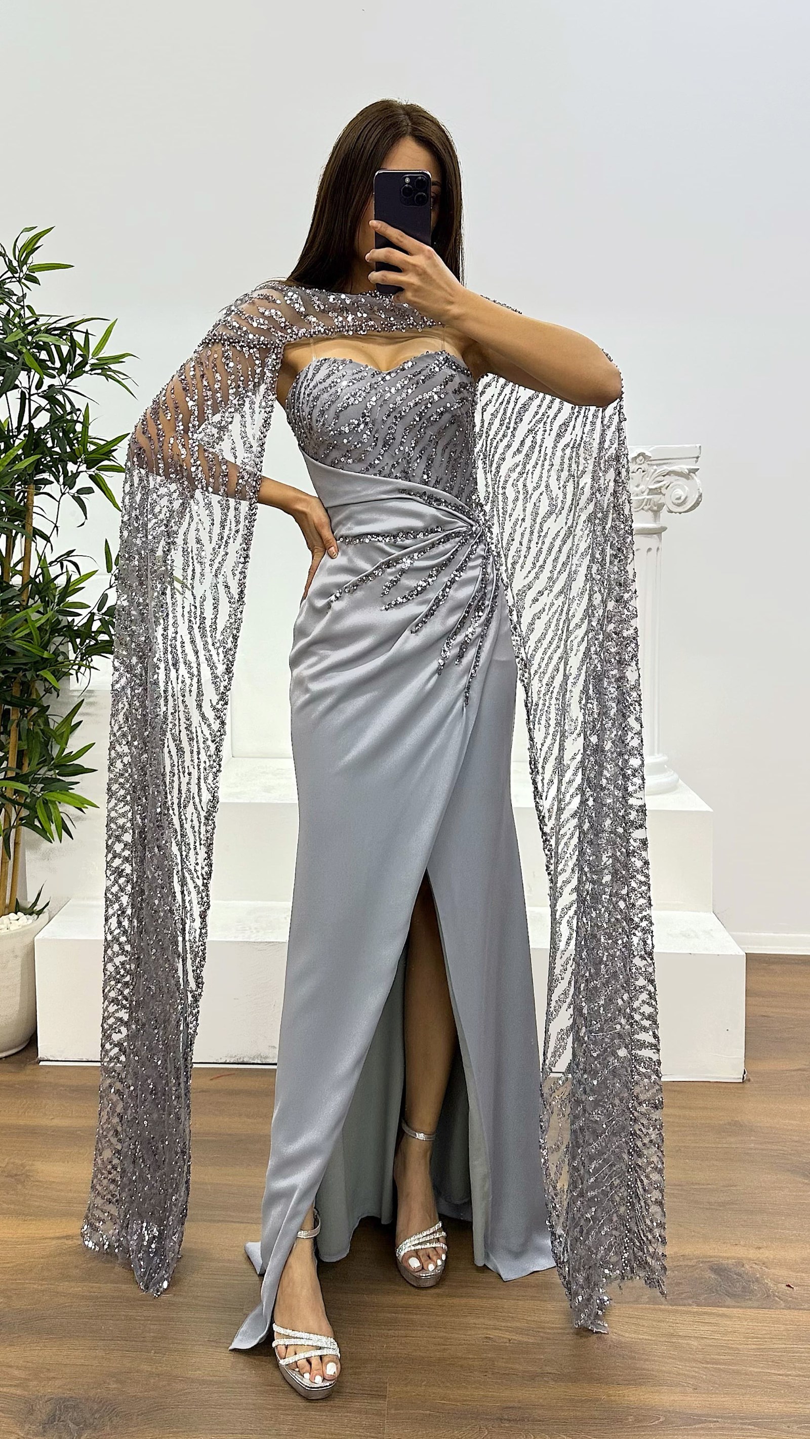 Vestido de noche sin tirantes bordado con capa El producto está diseñado como un vestido de noche sin tirantes, bordado y con capa. Compatible con tallas 36 a 42, con copas en el pecho, forro, cierre de cremallera trasera y abertura. Largo del vestido: Puede variar entre 170 y 175 cm. Tipo de tela: atlas, 100 % poliéster.