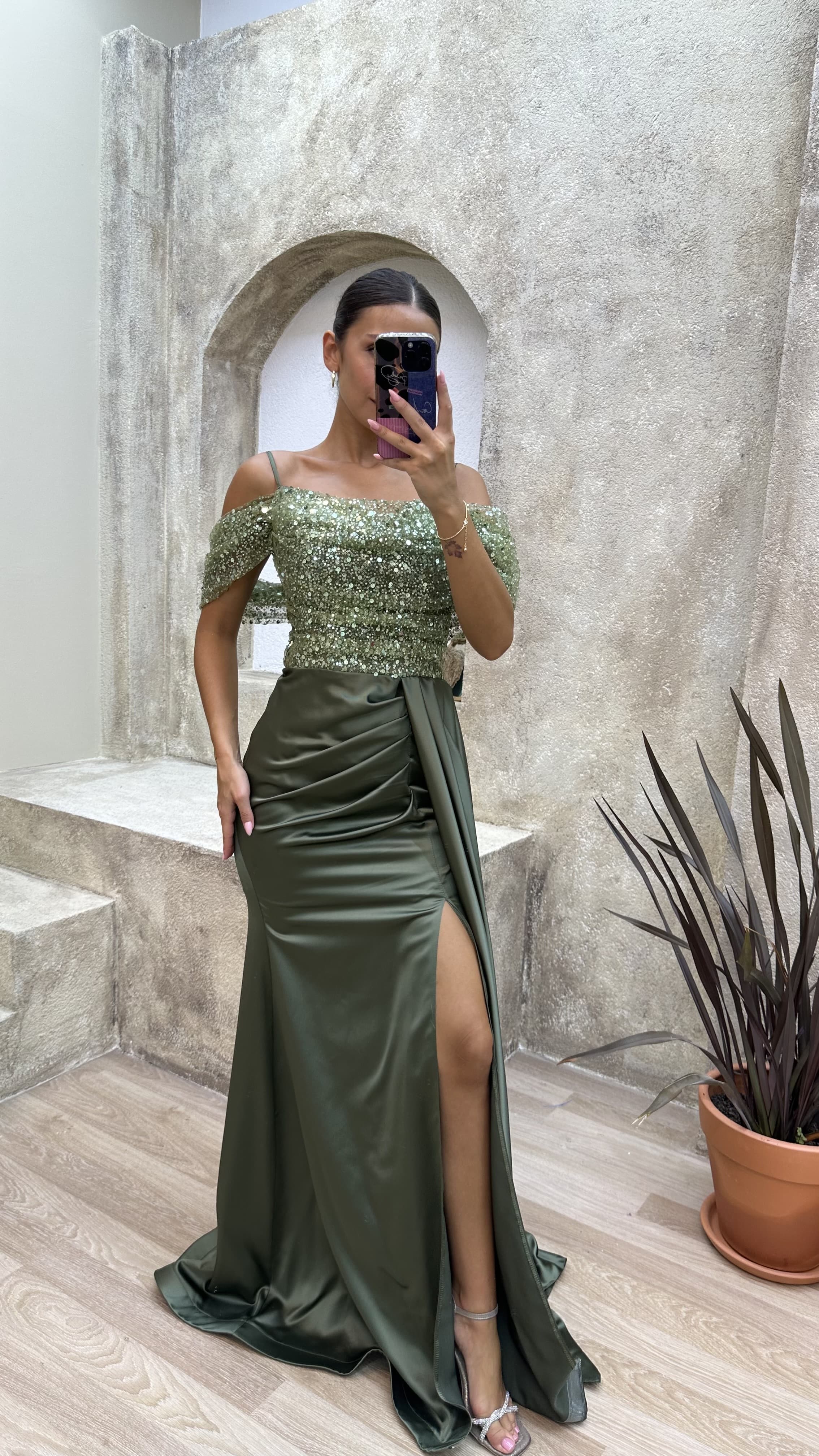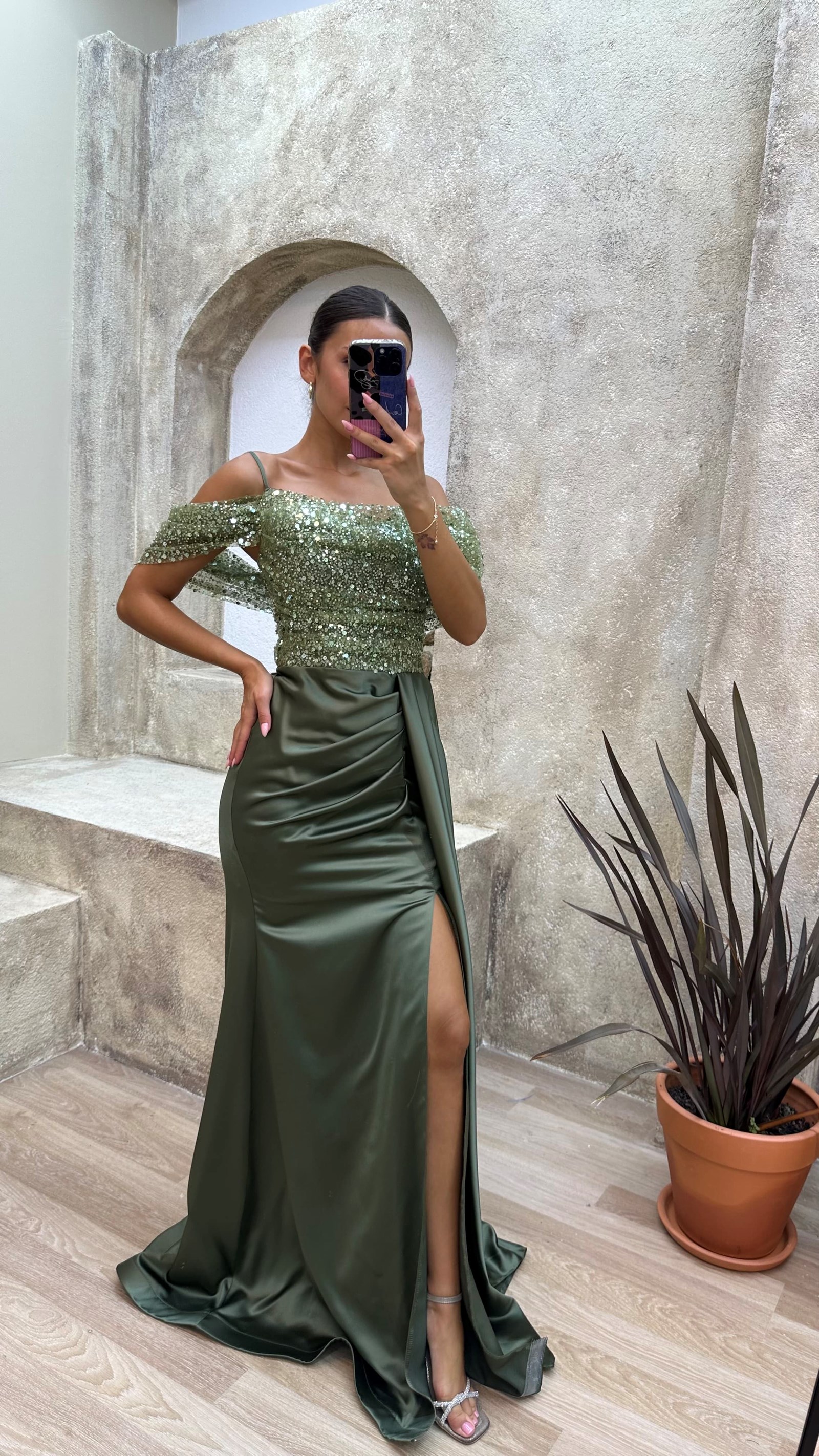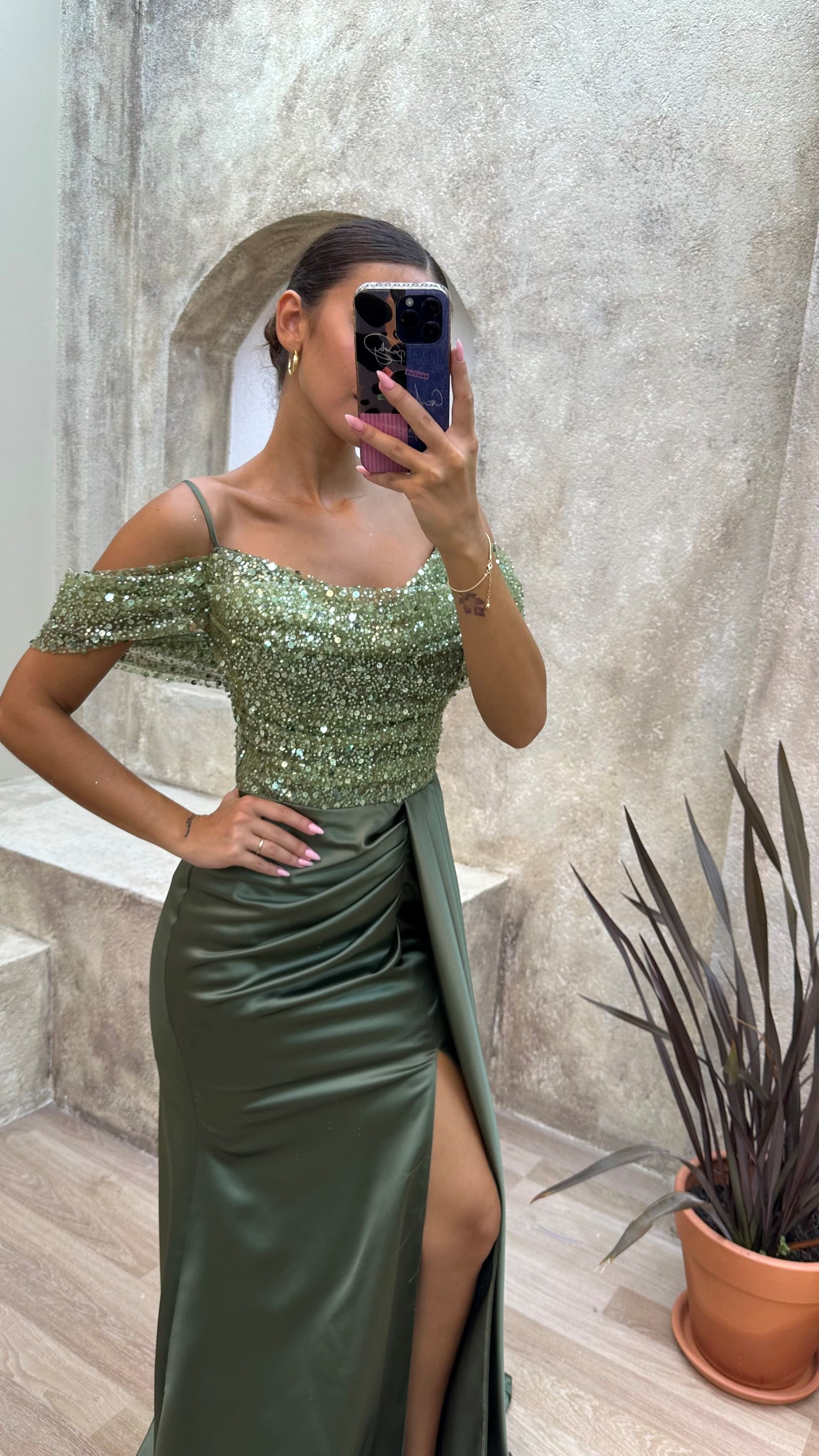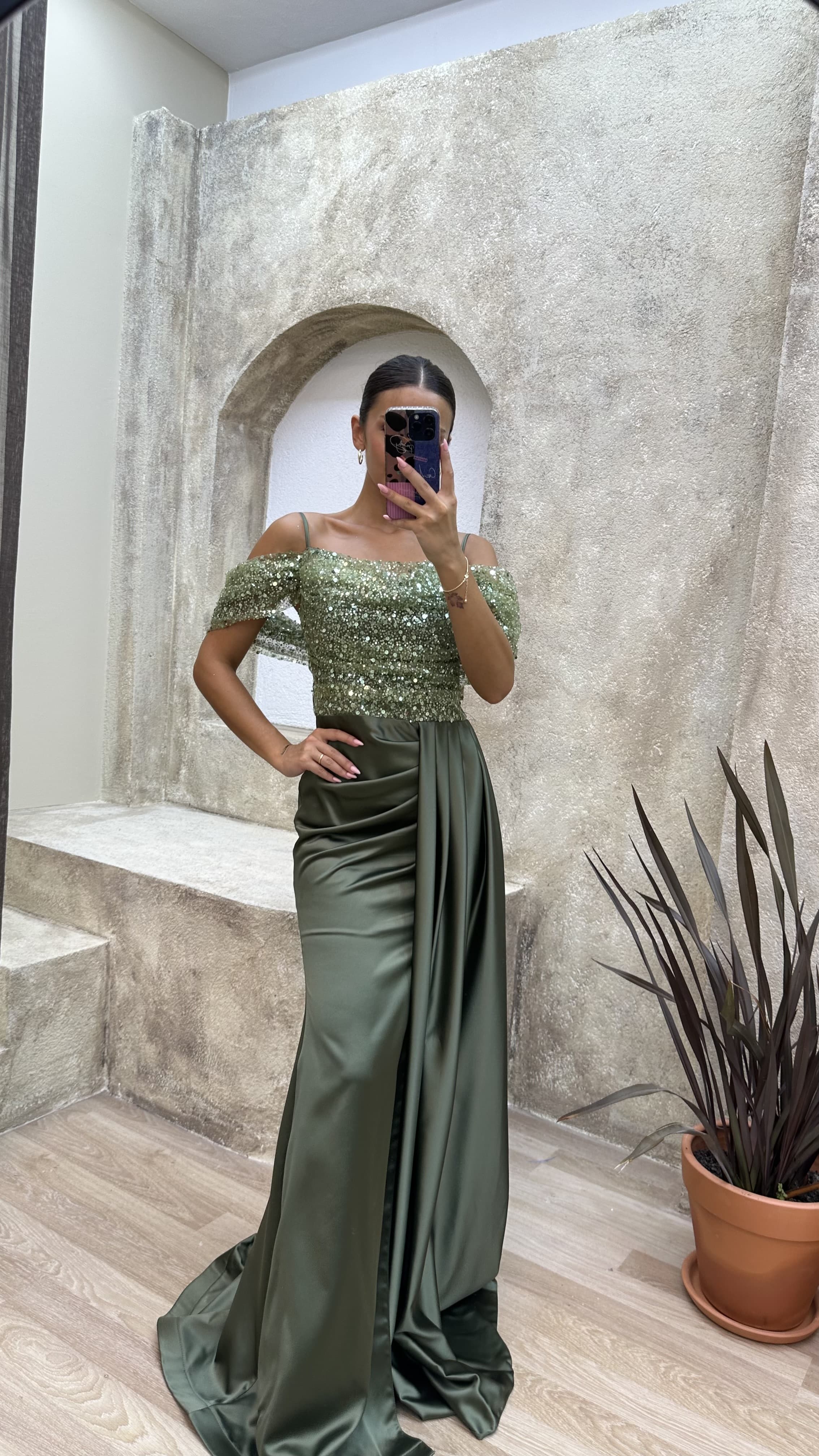 • Haki İp Askılı Kol Detay Göğsü Pul İşlemeli Saten Abiye Elbise