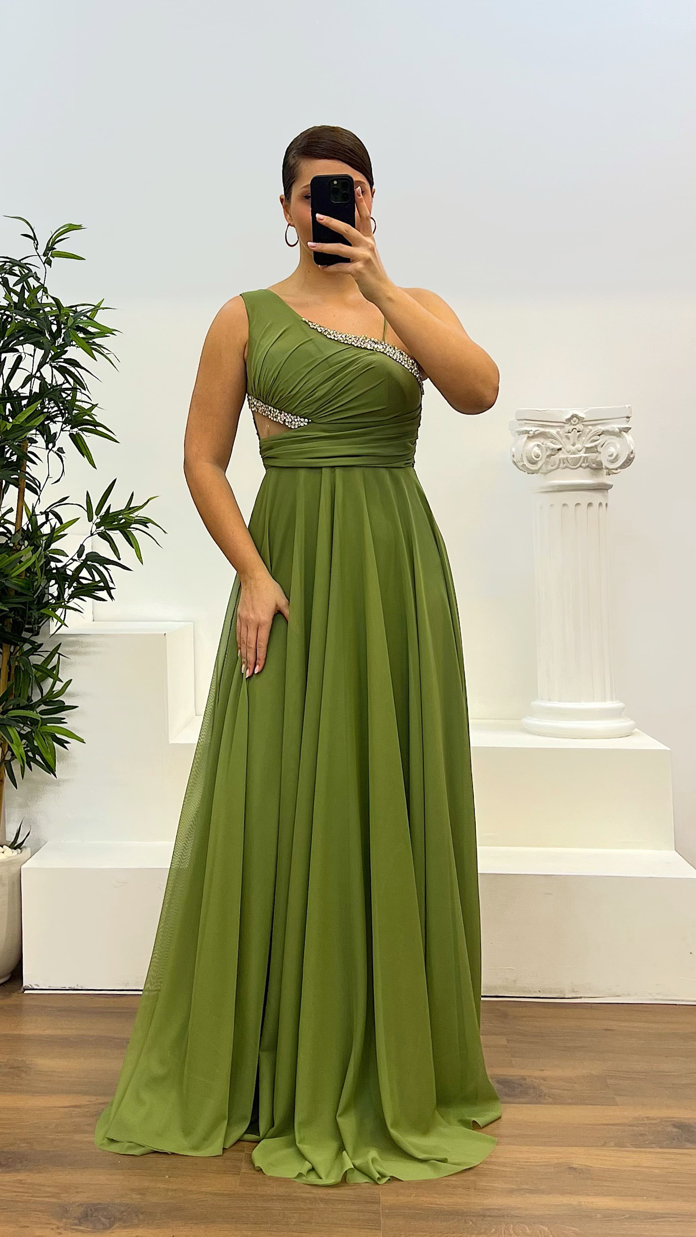 • Haki Taş Detay Büyük Beden Abiye Elbise