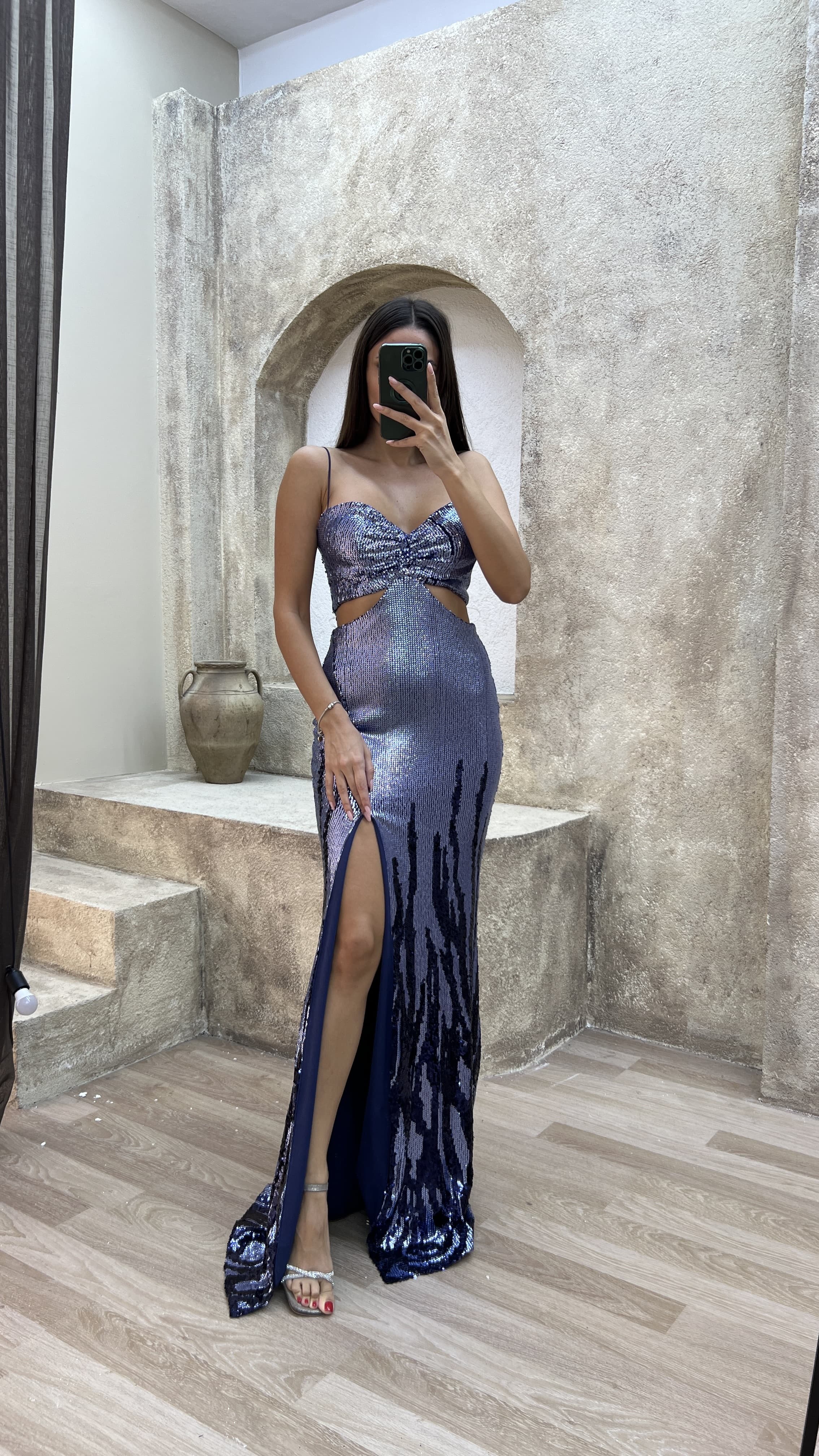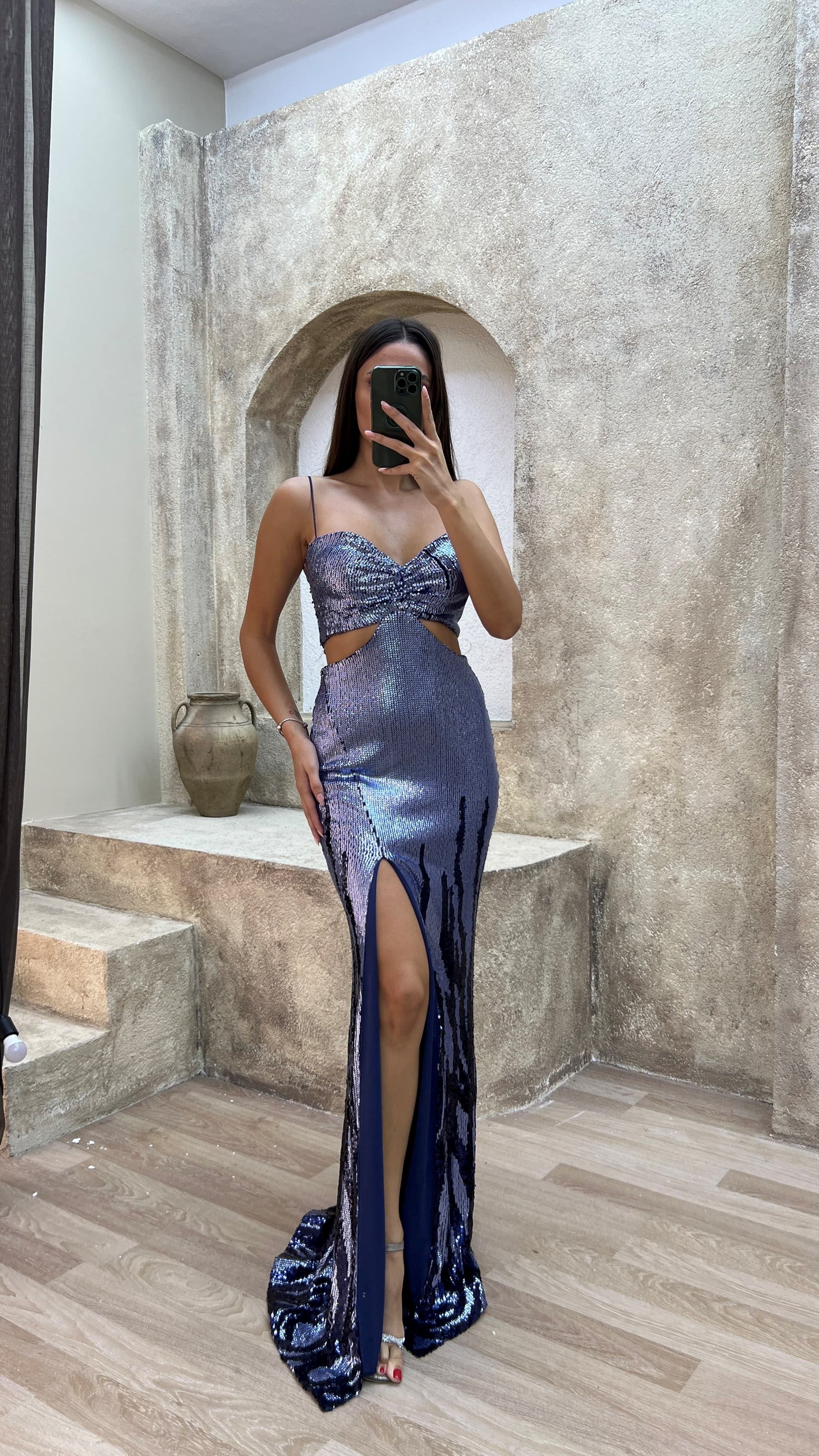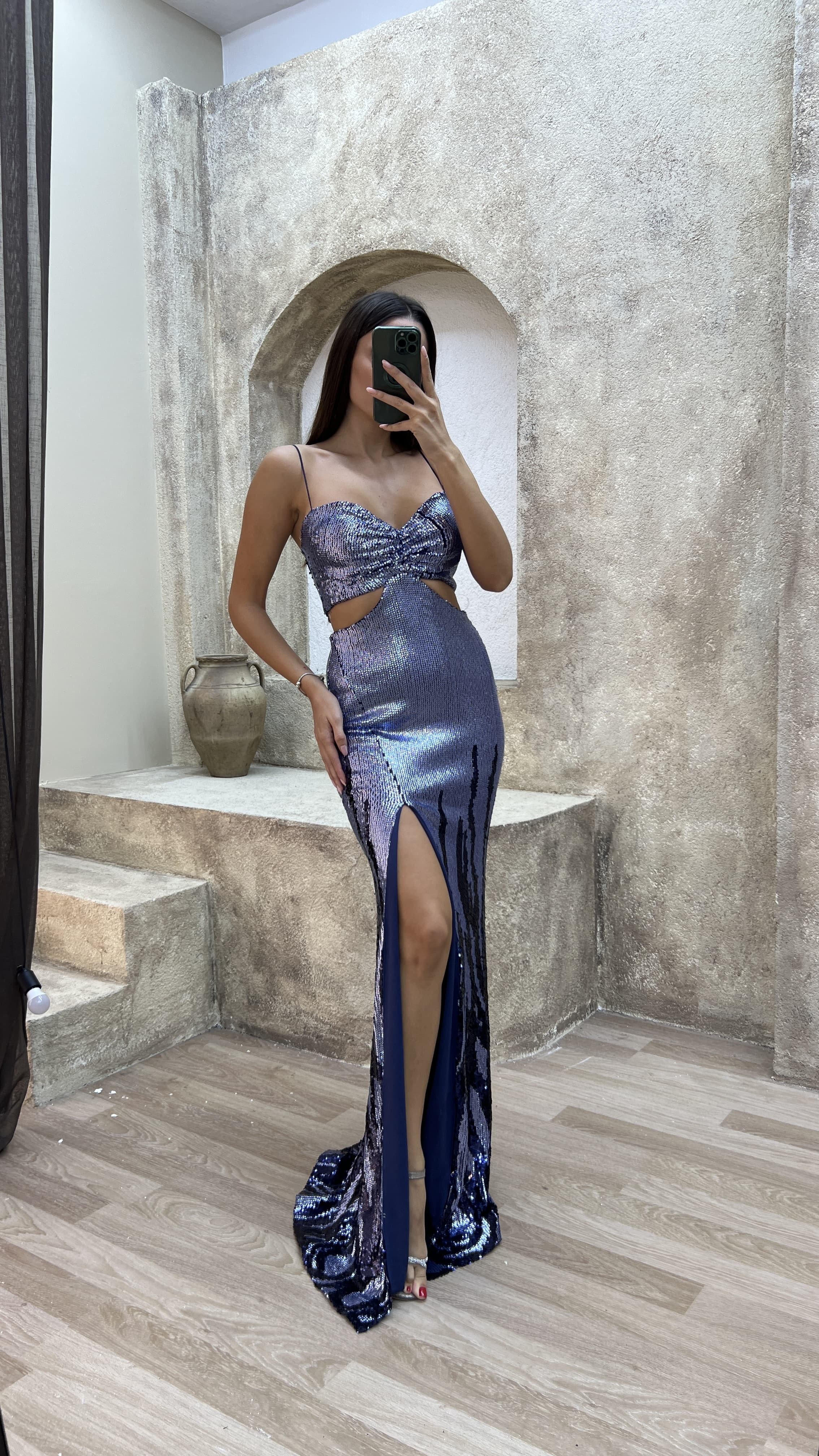• İndigo İp Askılı Bel Detay Payet Abiye Elbise