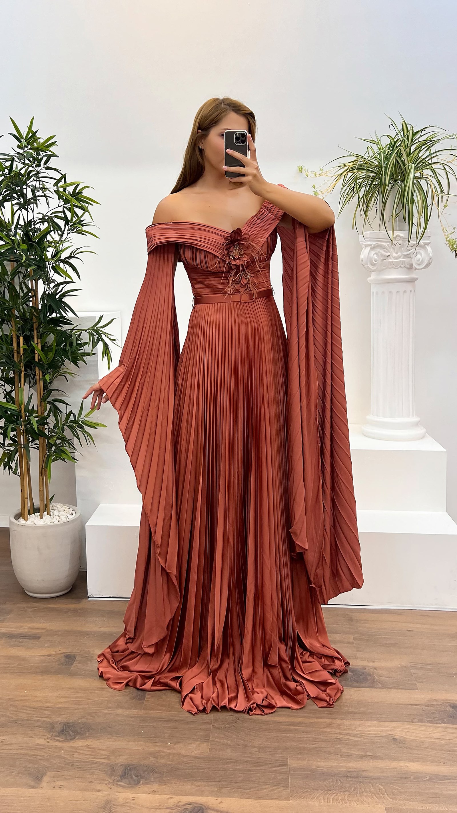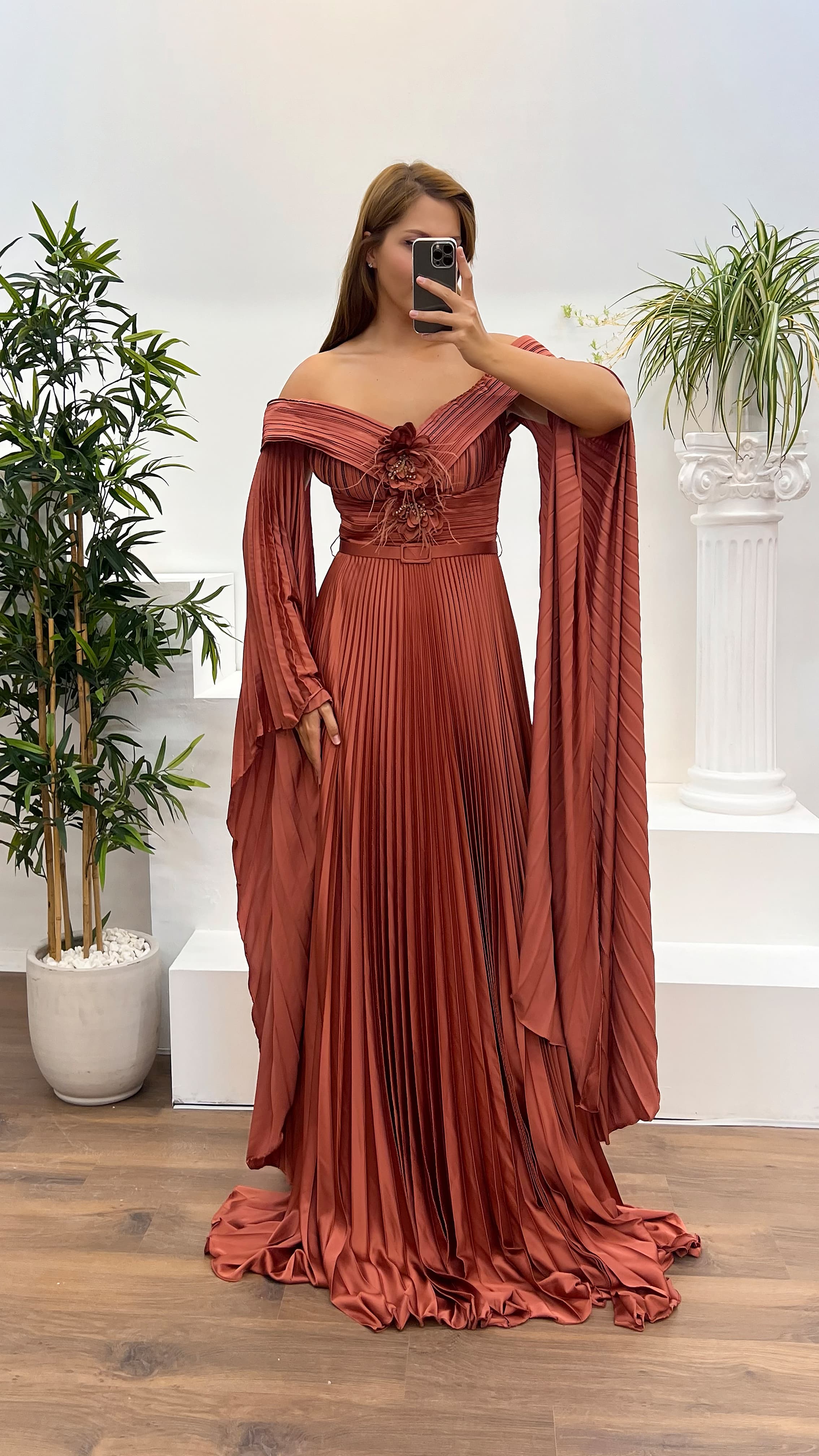 • Kiremit Kayık Yaka Gül Detay Büyük Beden Abiye Elbise