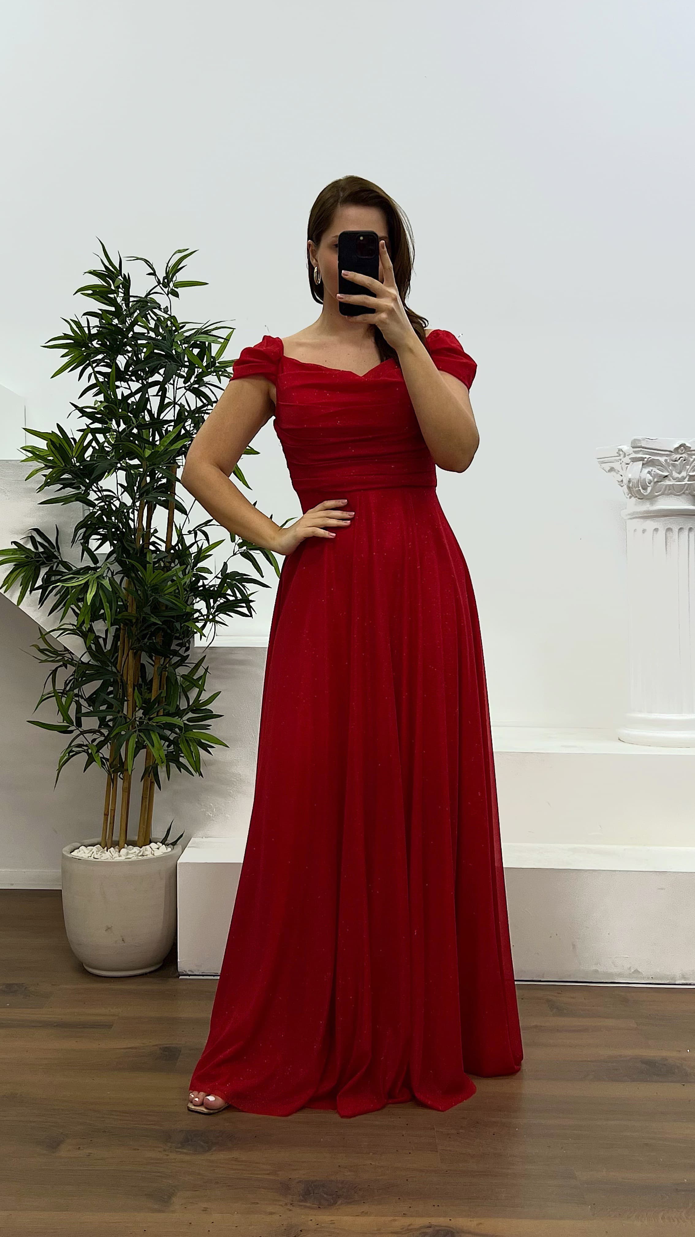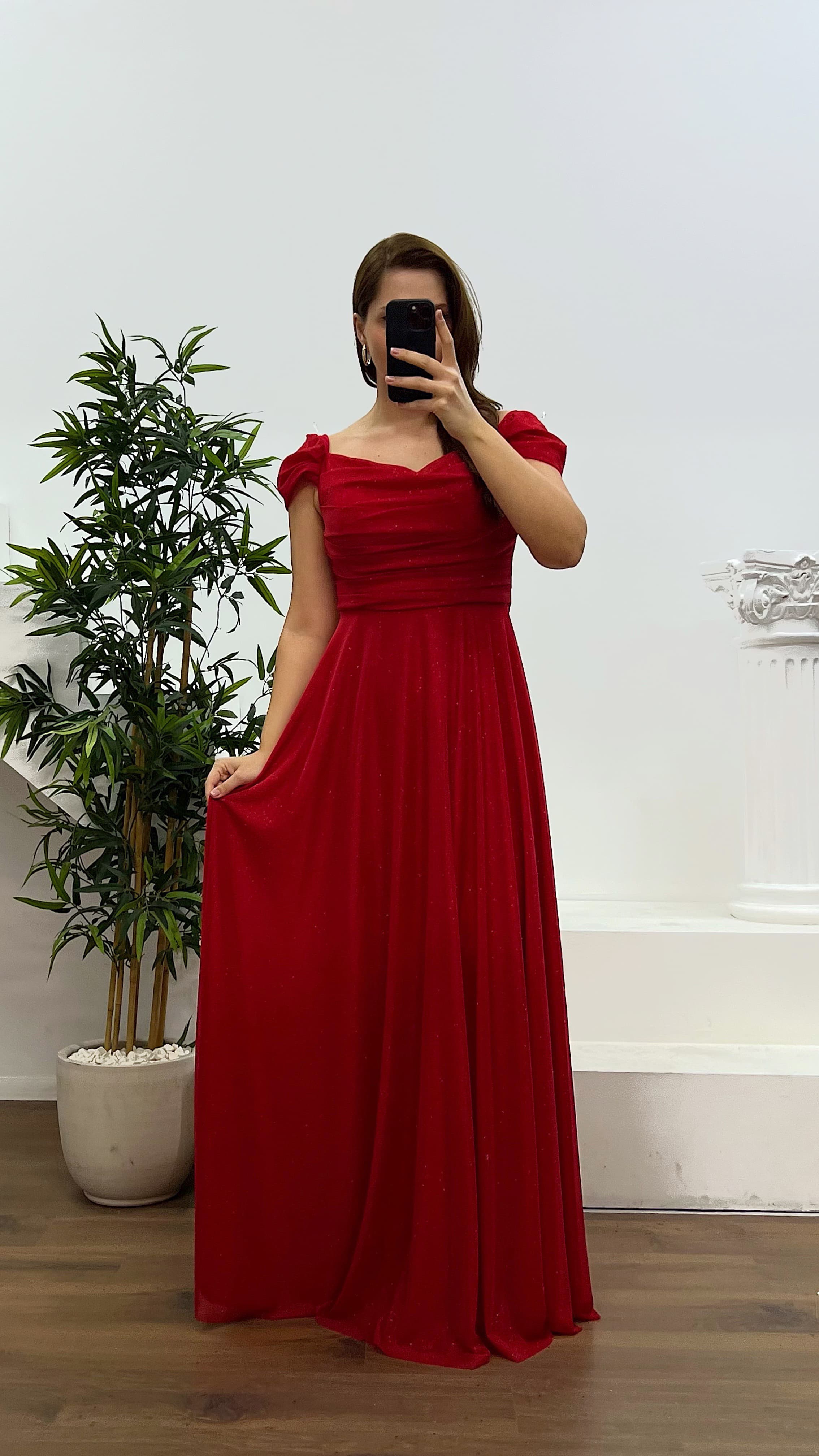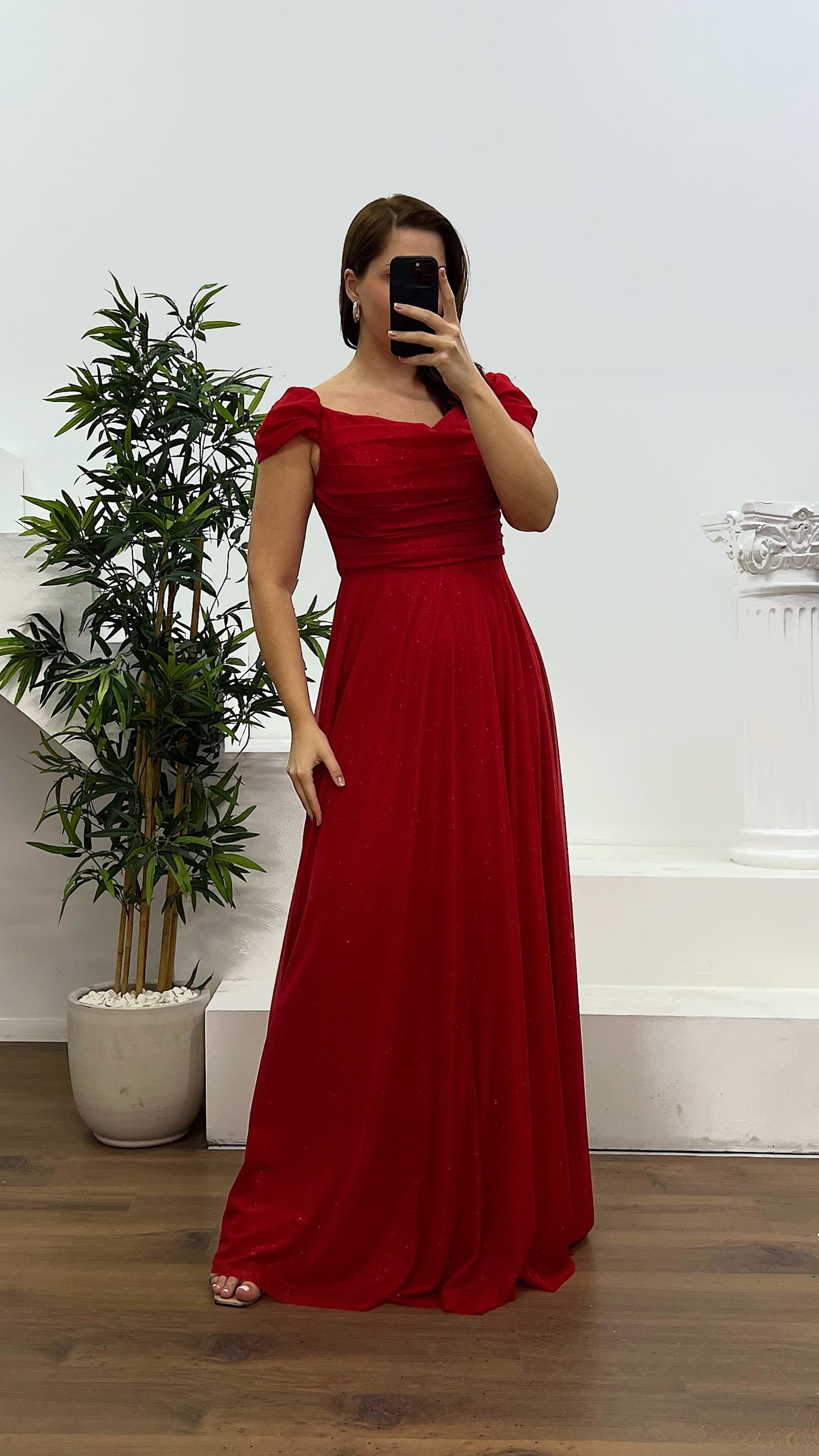 • Kırmızı Göğsü Drapeli Büyük Beden Abiye Elbise