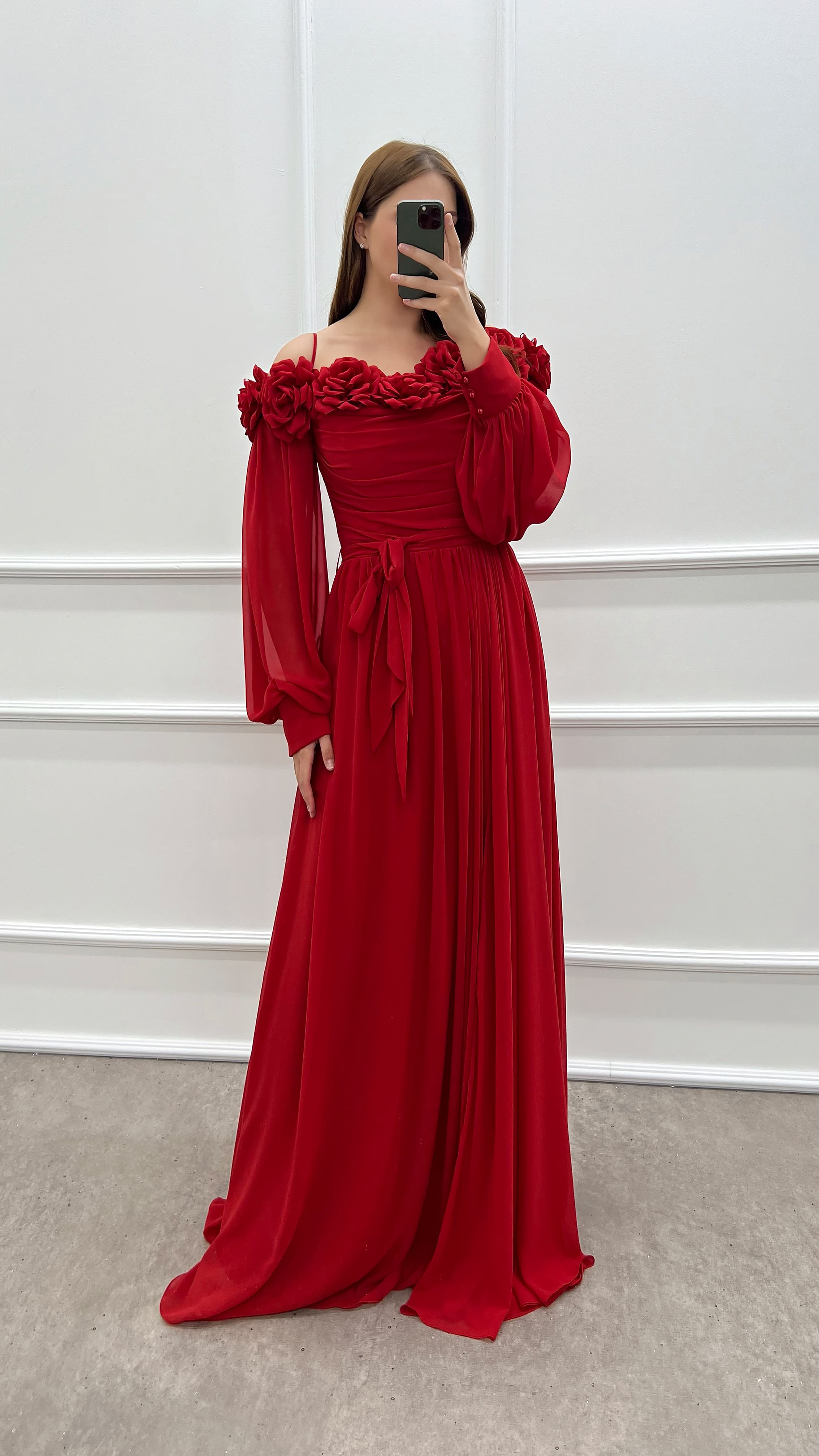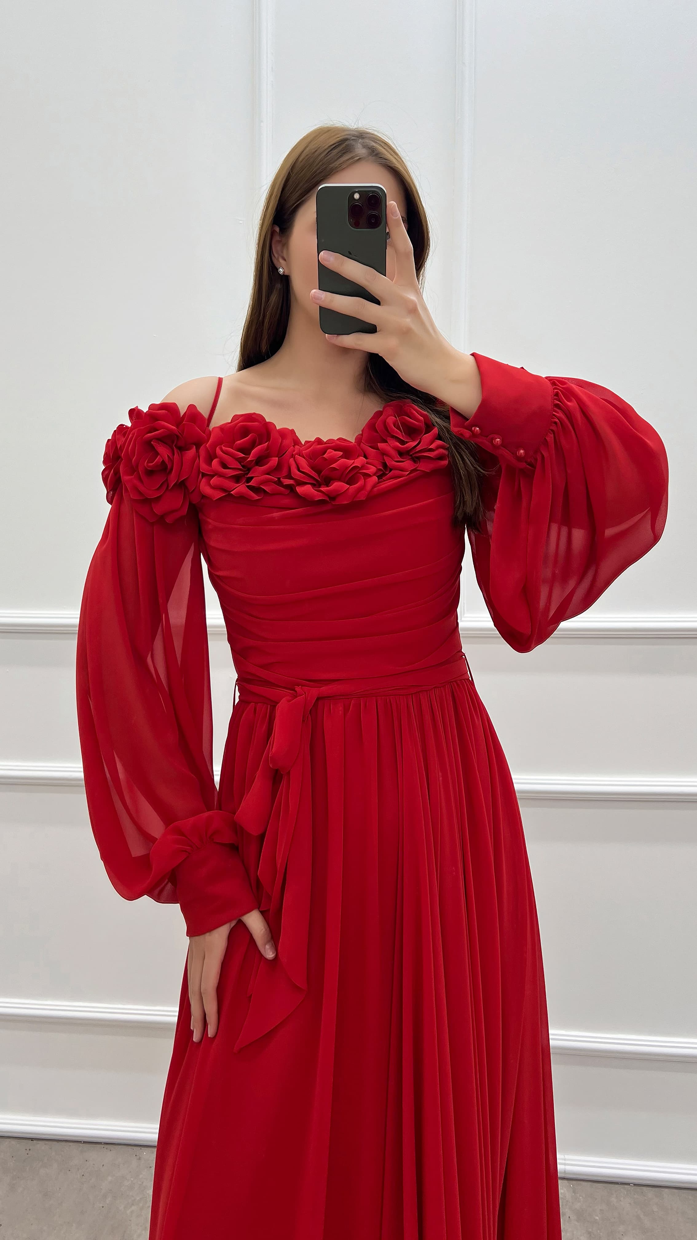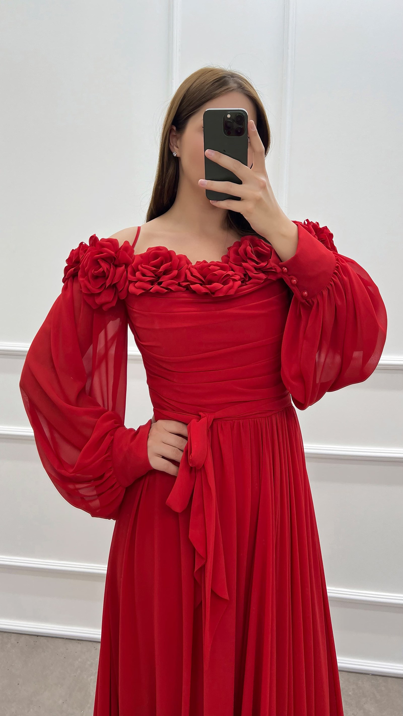 • Vestido de gasa de talla grande con manga globo rosa de pecho rojo
