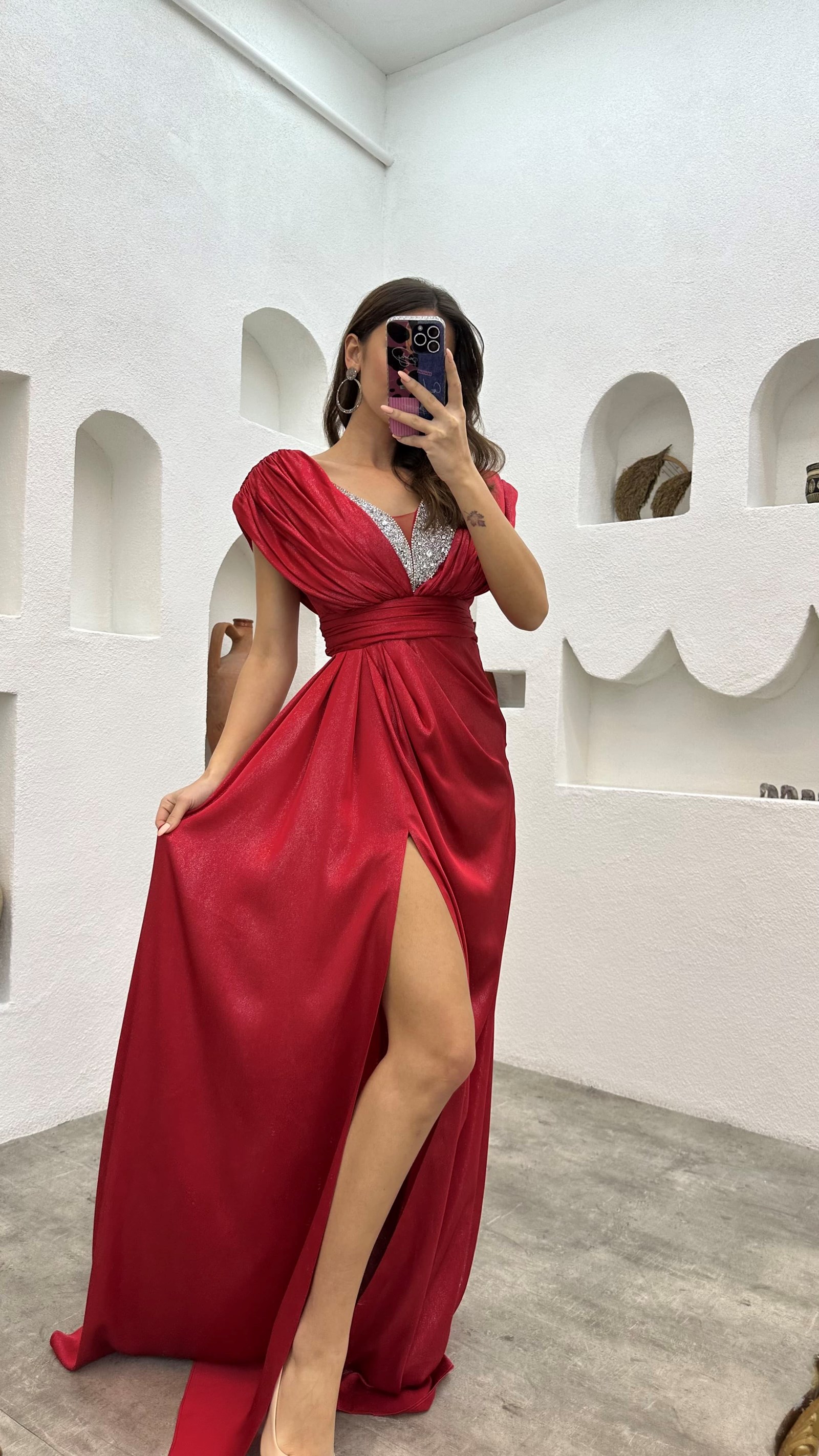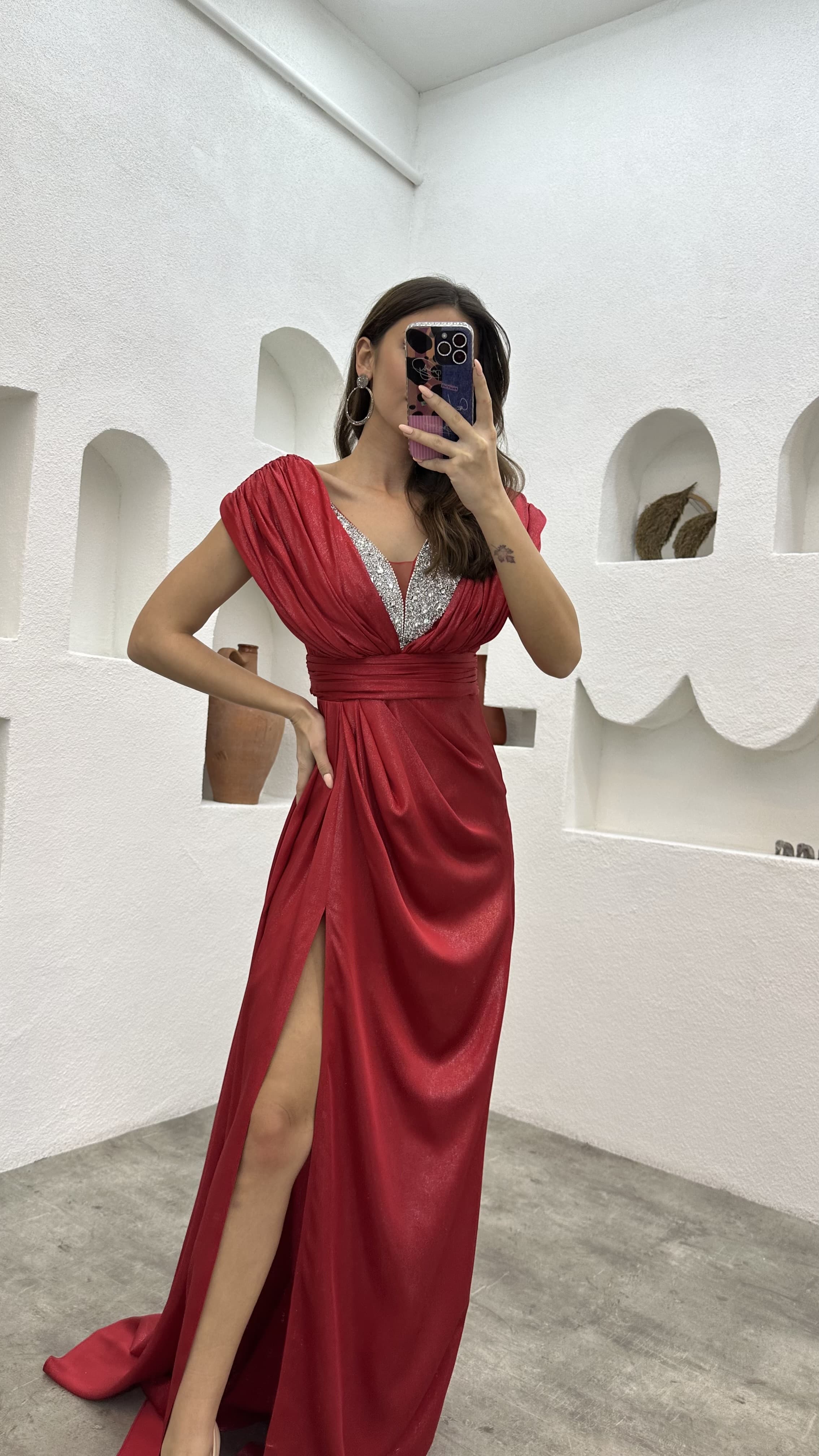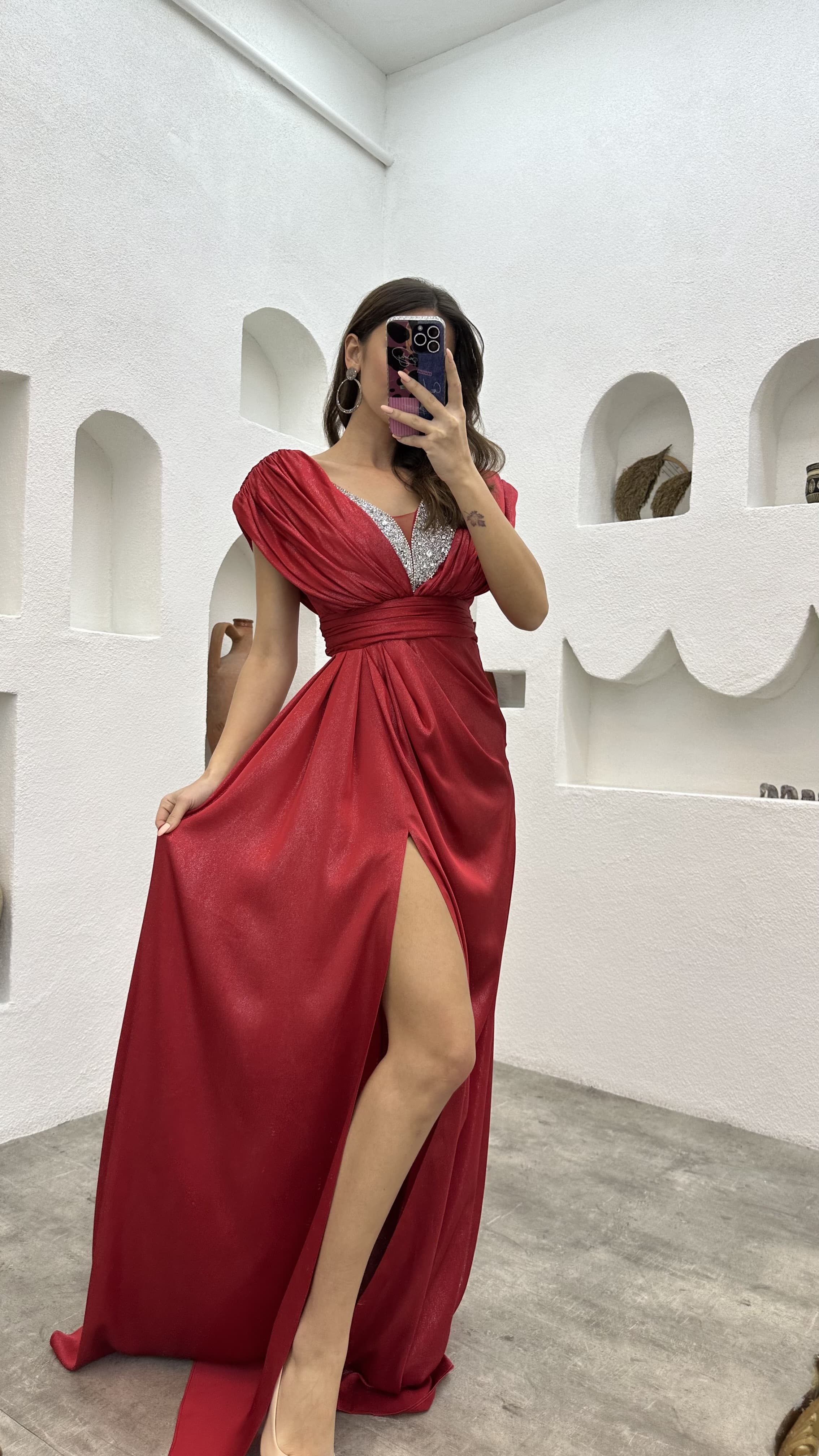 • Kırmızı Göğsü Taş İşleme Kuşaklı Abiye Elbise