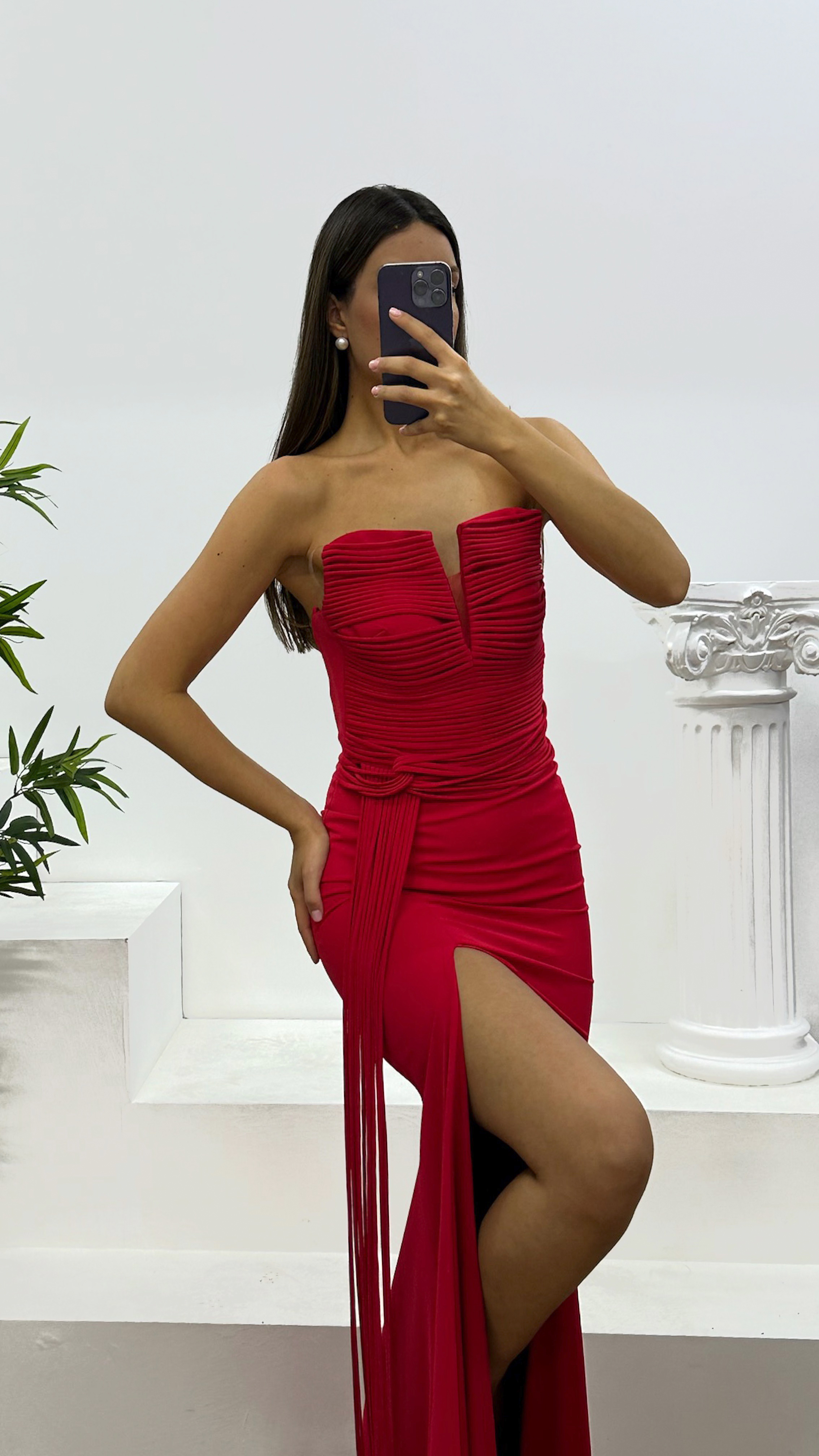 Vestido de noche sin tirantes con detalles de flecos El producto está diseñado como un vestido de noche con detalles de flecos, adecuado para tallas de la 36 a la 44, con copas en el pecho, forro, cordones cruzados en la espalda y cierre de cremallera. Longitud del producto: Puede variar entre 170 y 175 cm. Tipo de tela: Atlas, 100 % poliéster.