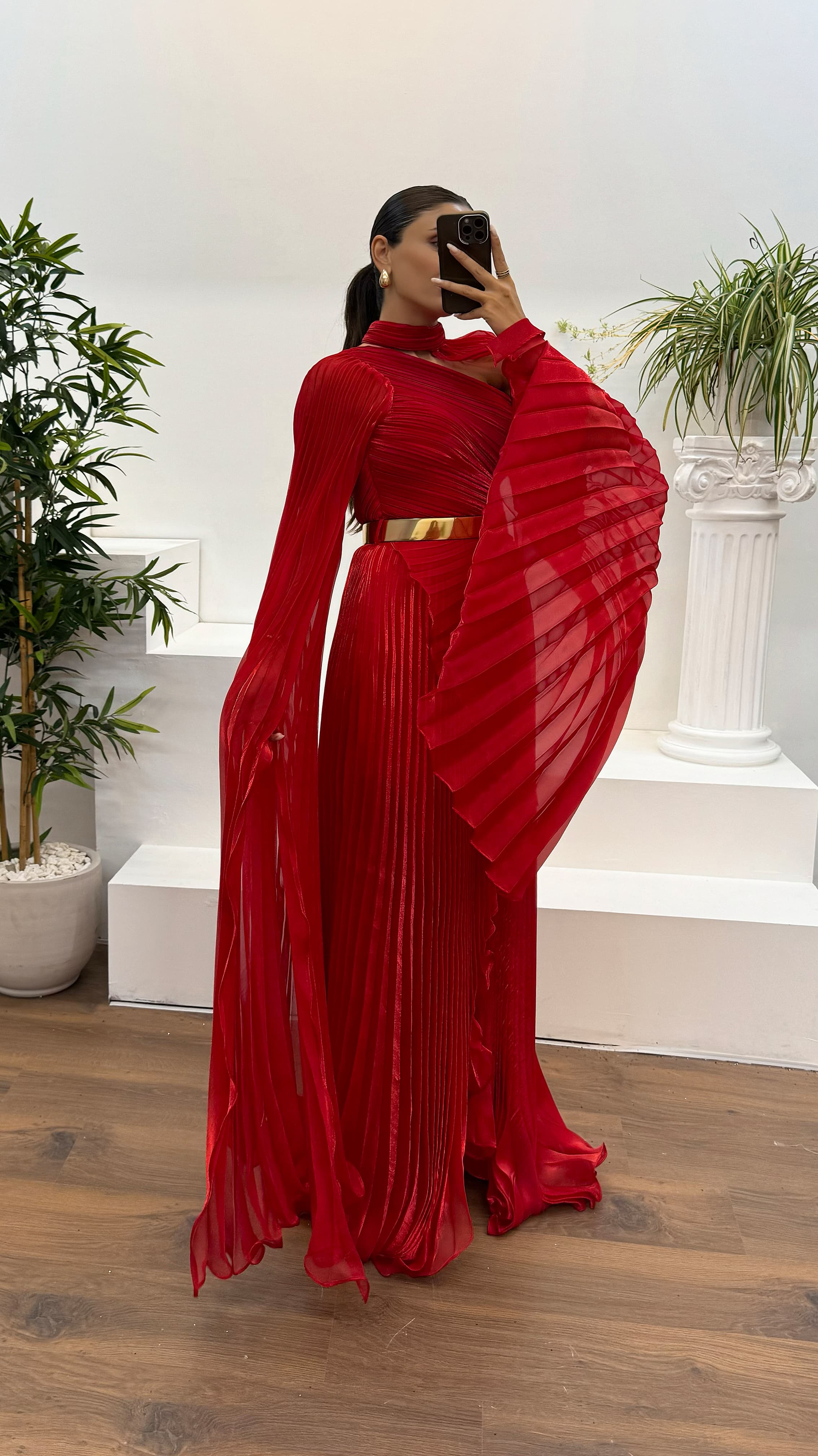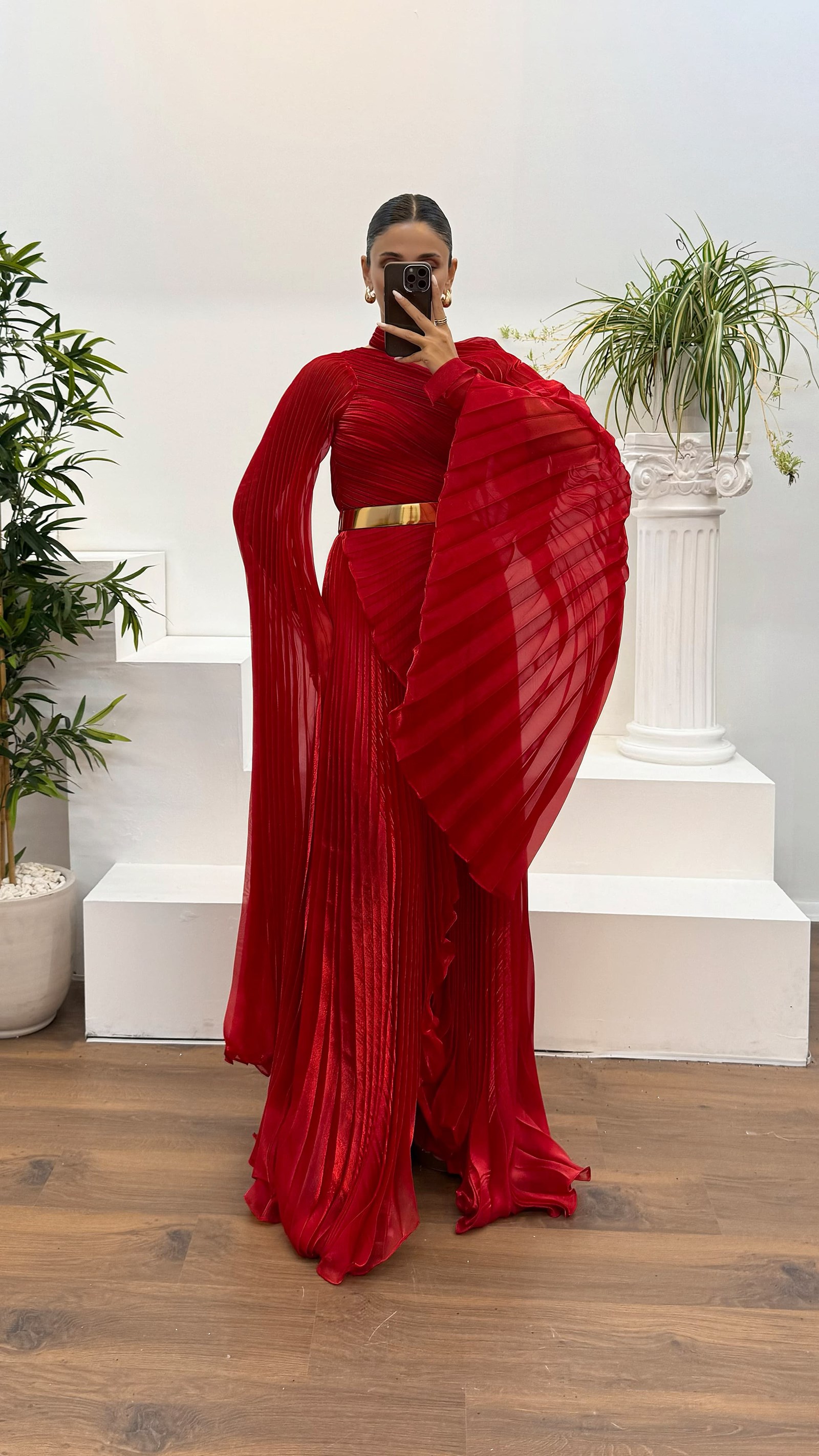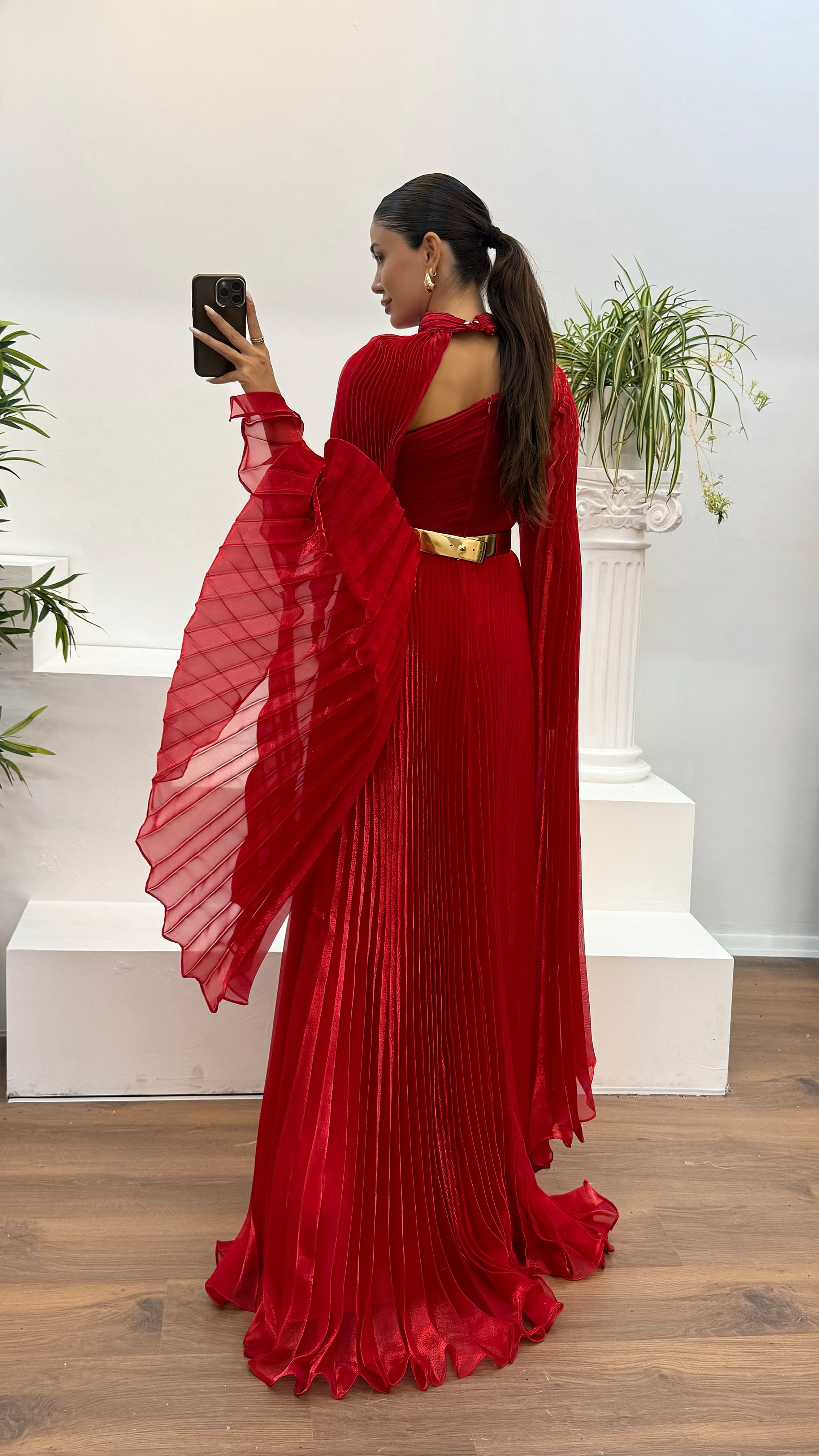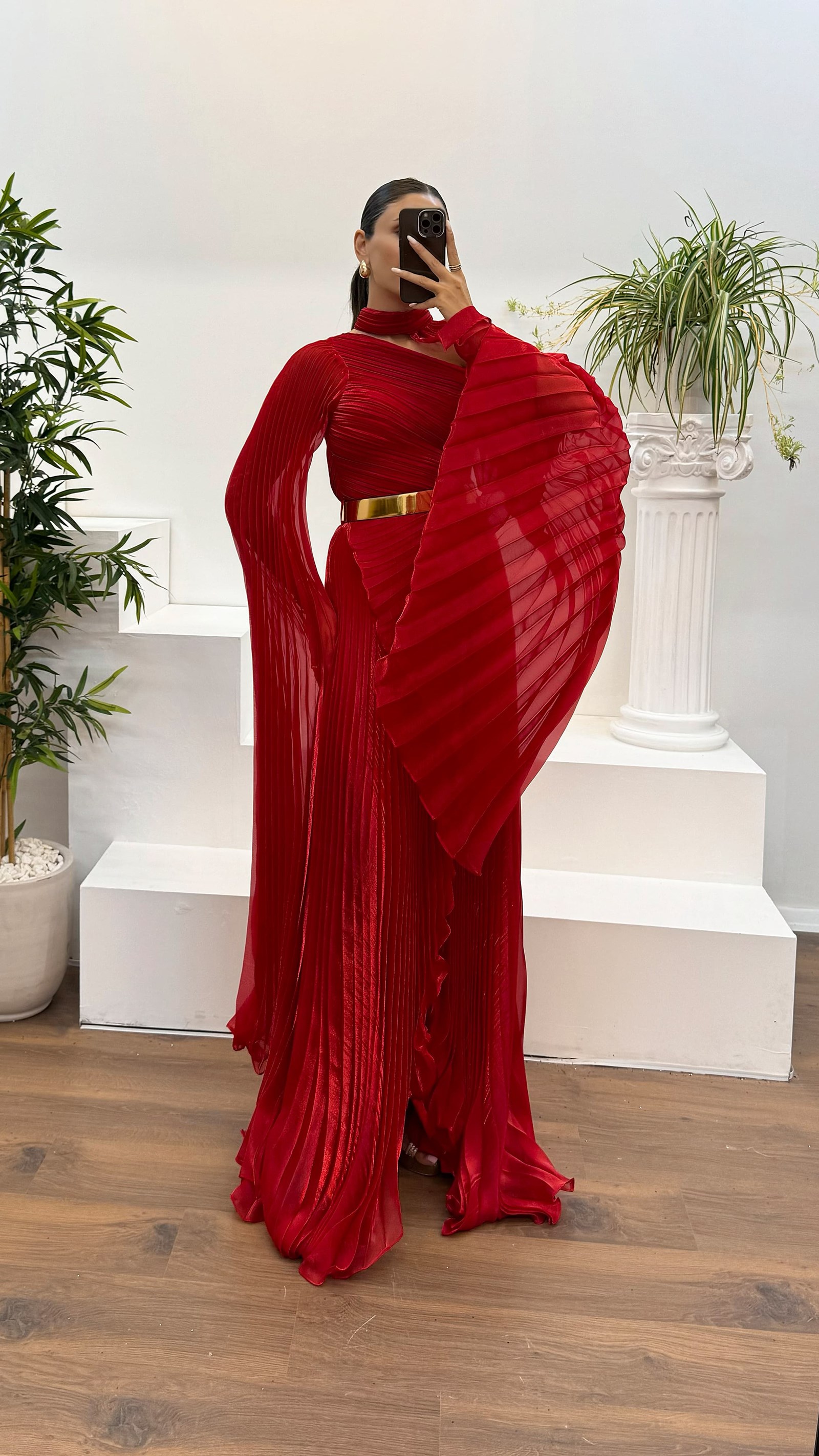 • Kırmızı Yaka Detay Asimetrik Kesim Abiye Elbise