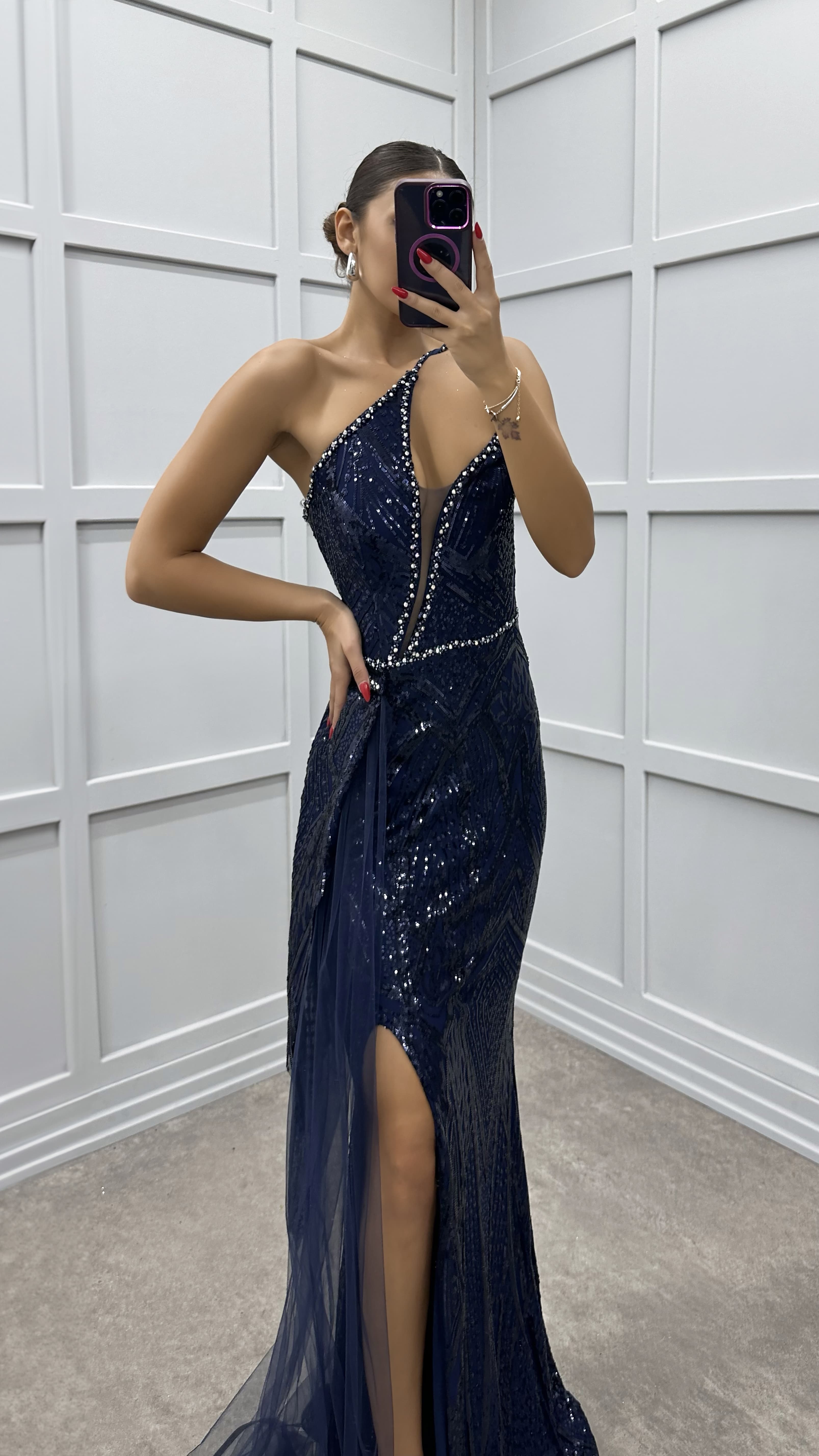 Lacivert Asimetrik Kesim Tül detay İşlemeli Abiye Elbise