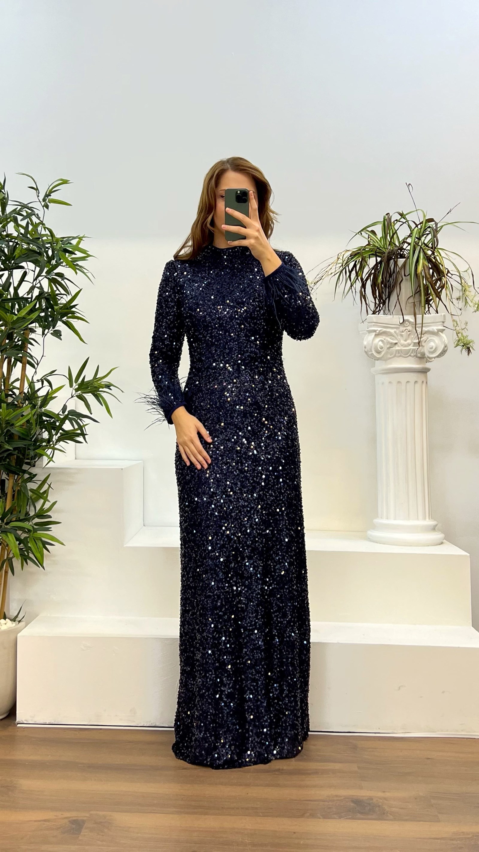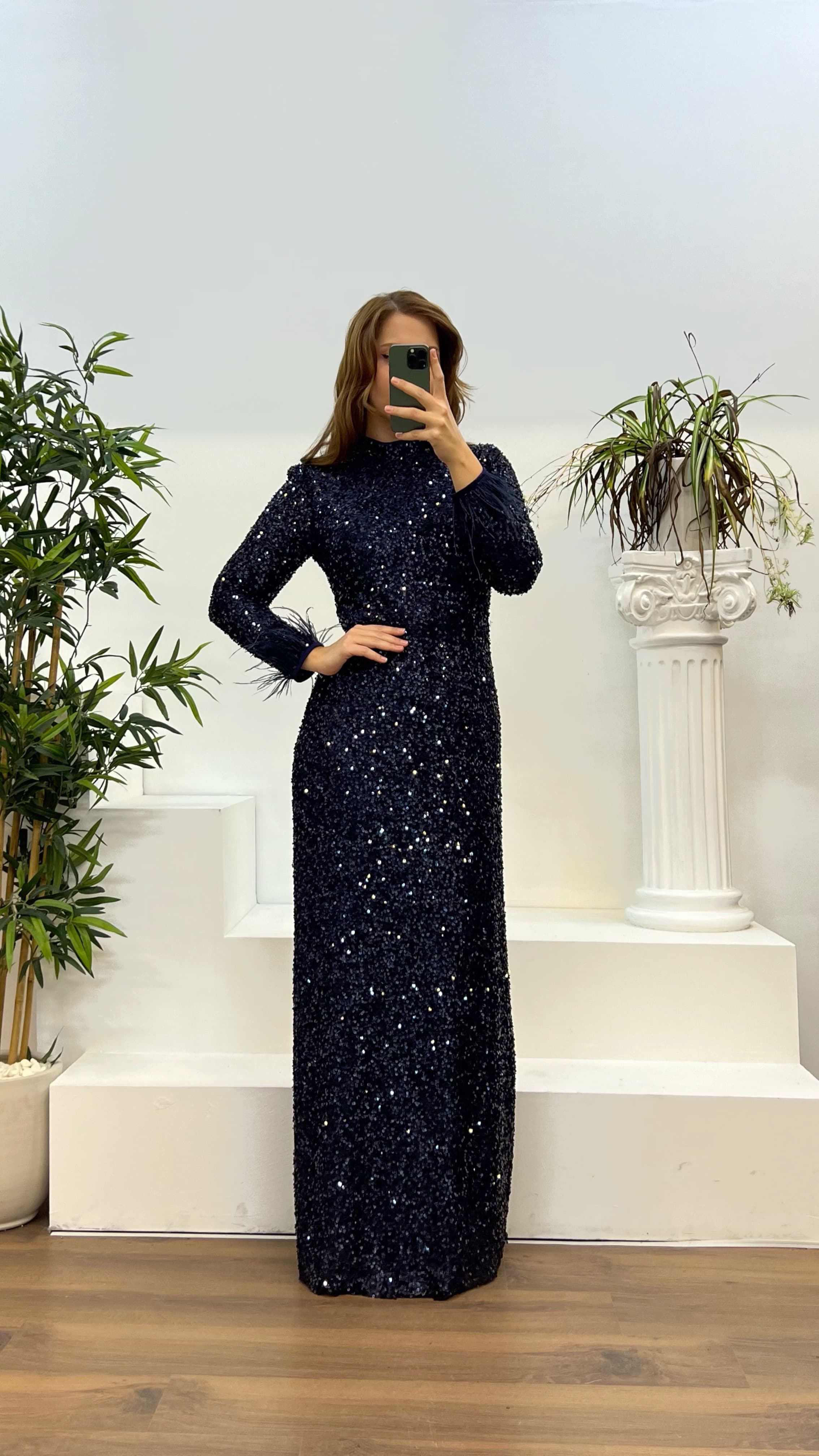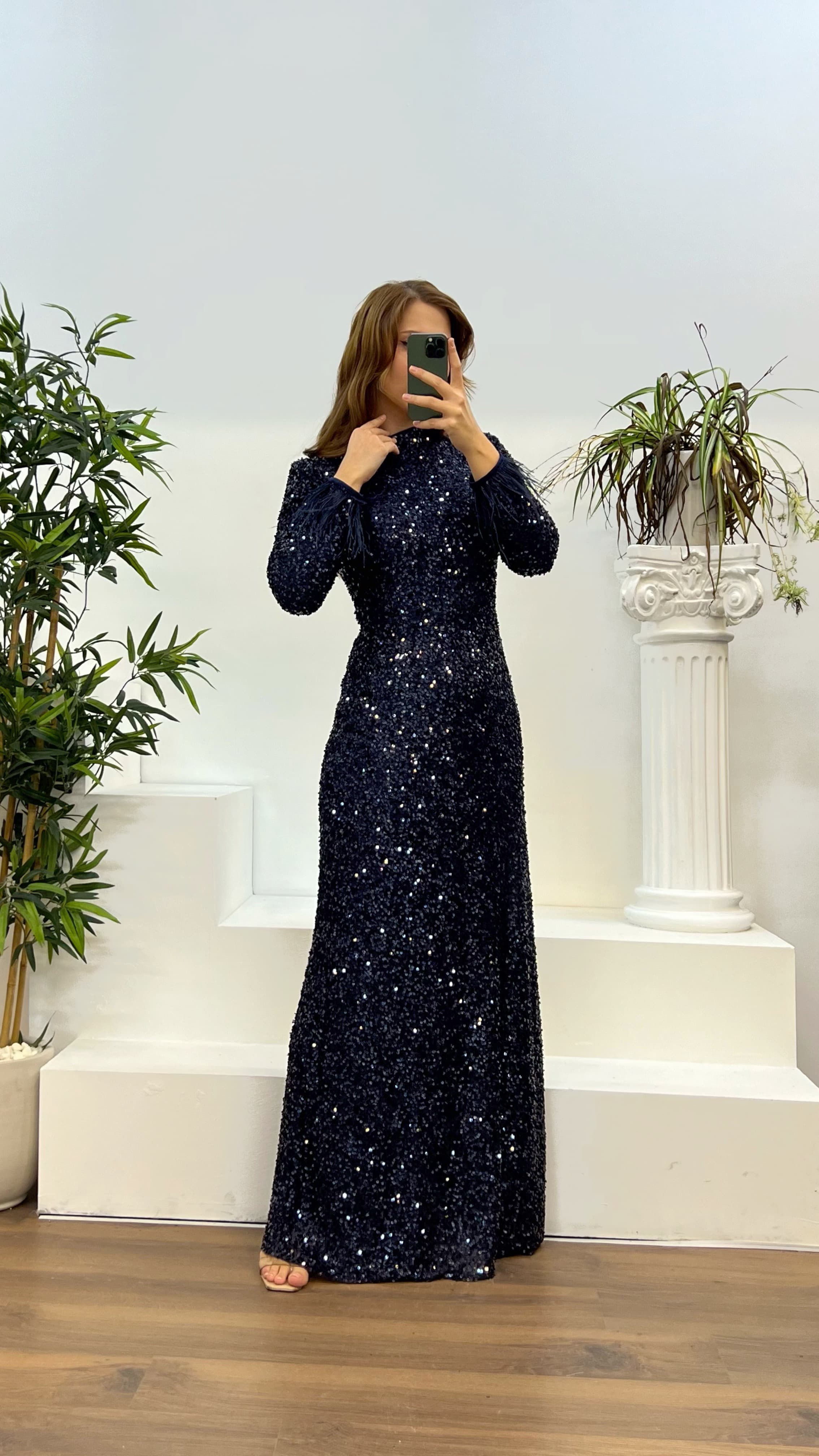 • Lacivert Kolları Tüy Detay Pul Payet Büyük Beden Abiye Elbise