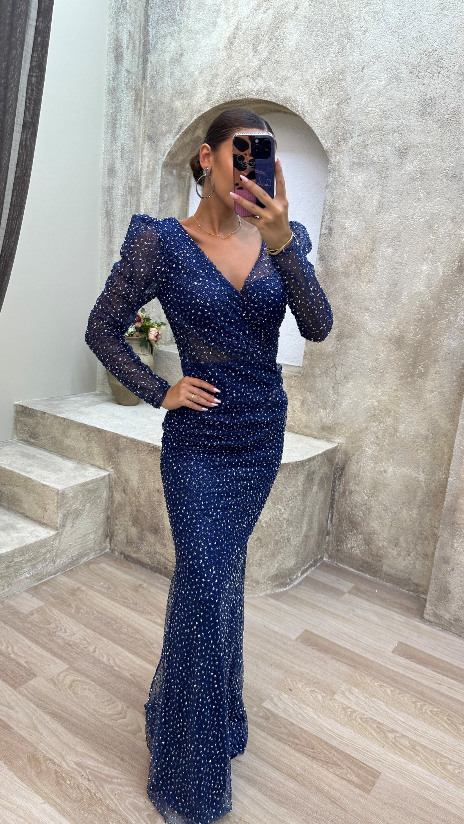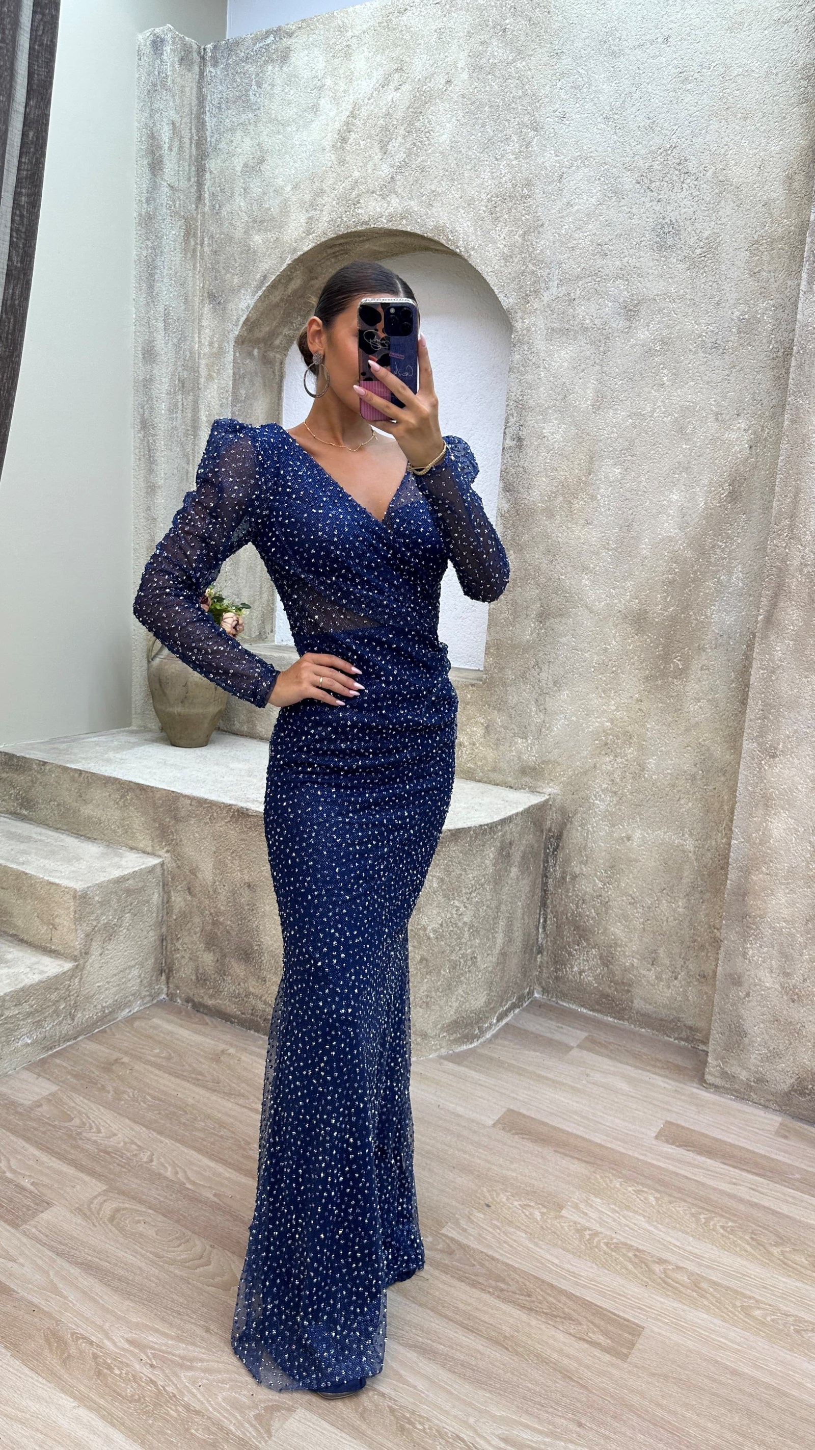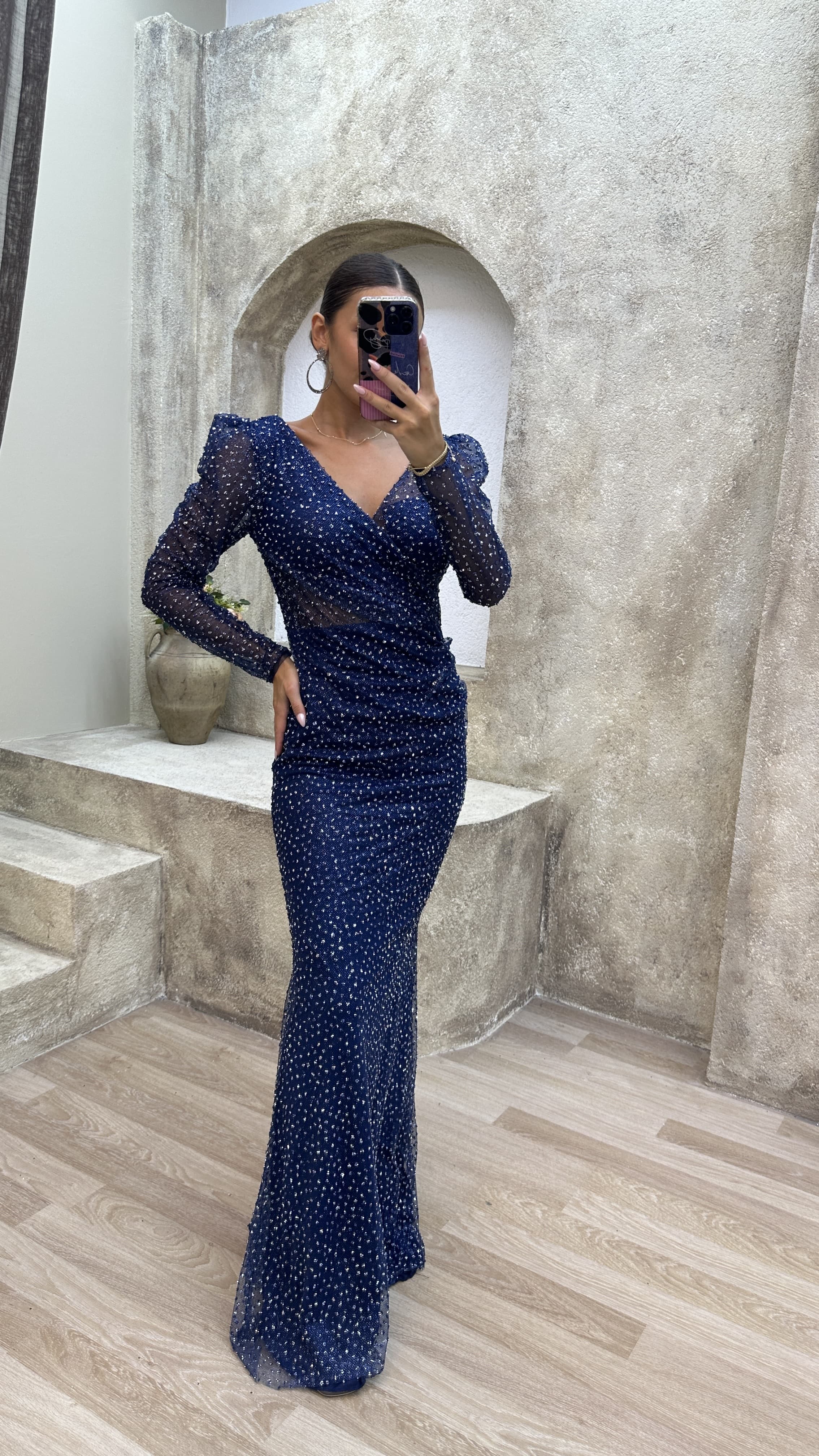 Lacivert V Yaka Sırt Detay Taş İşlemeli Abiye Elbise