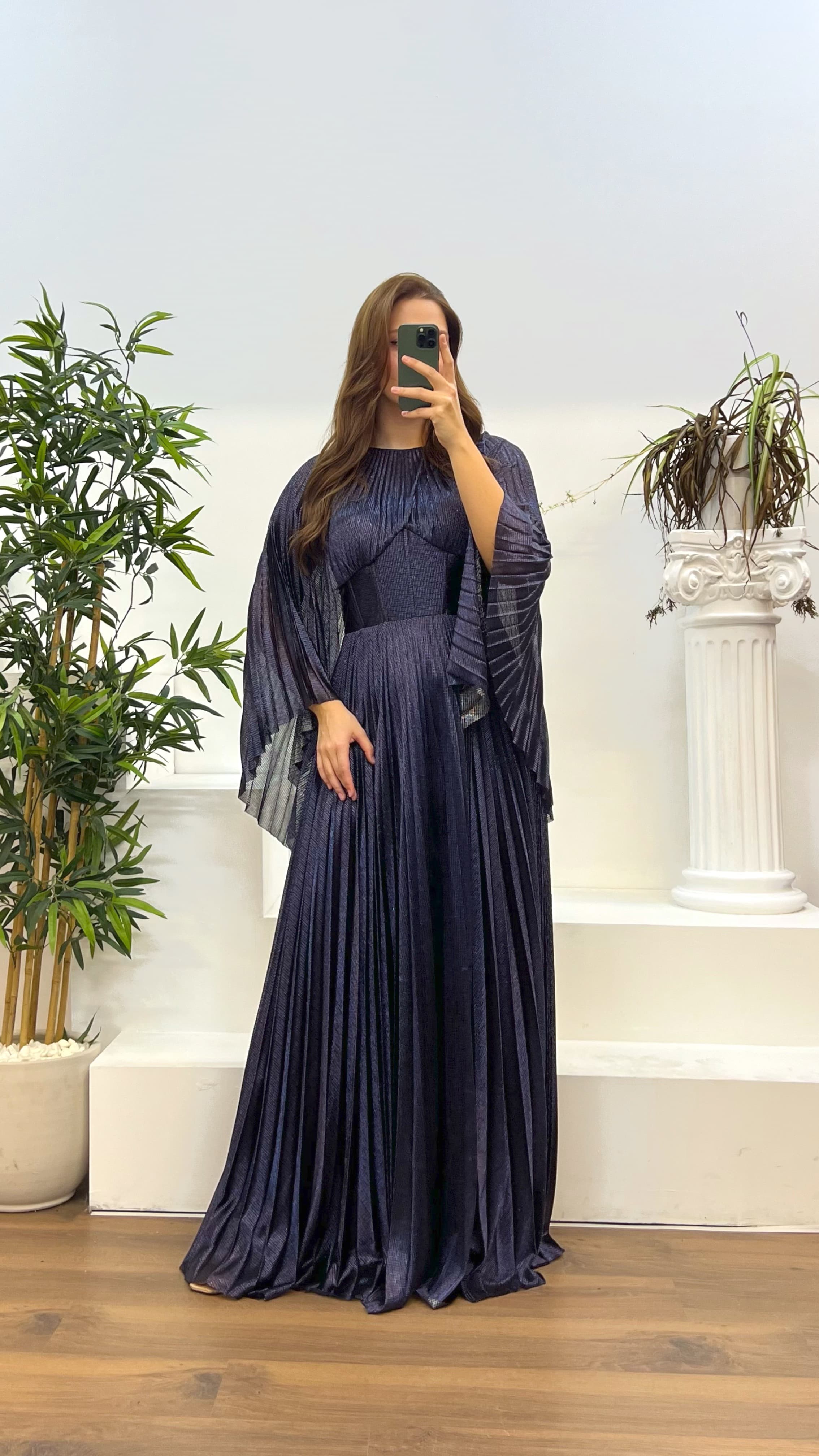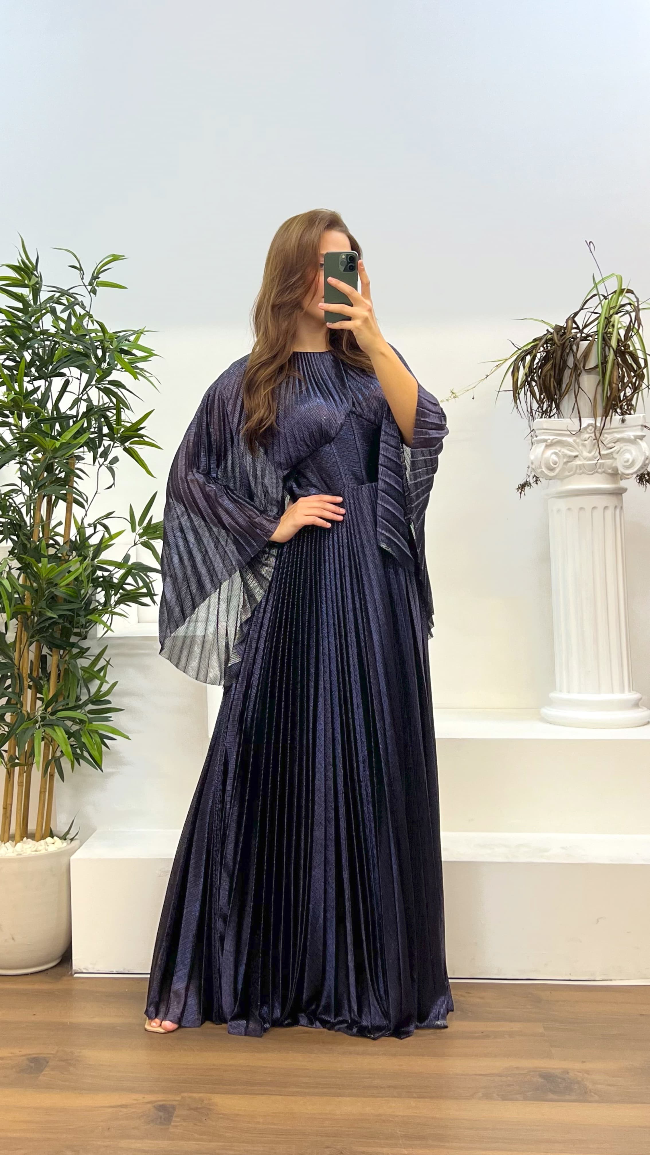 Lacivert Yarasa Kol Piliseli Büyük Beden Abiye Elbise