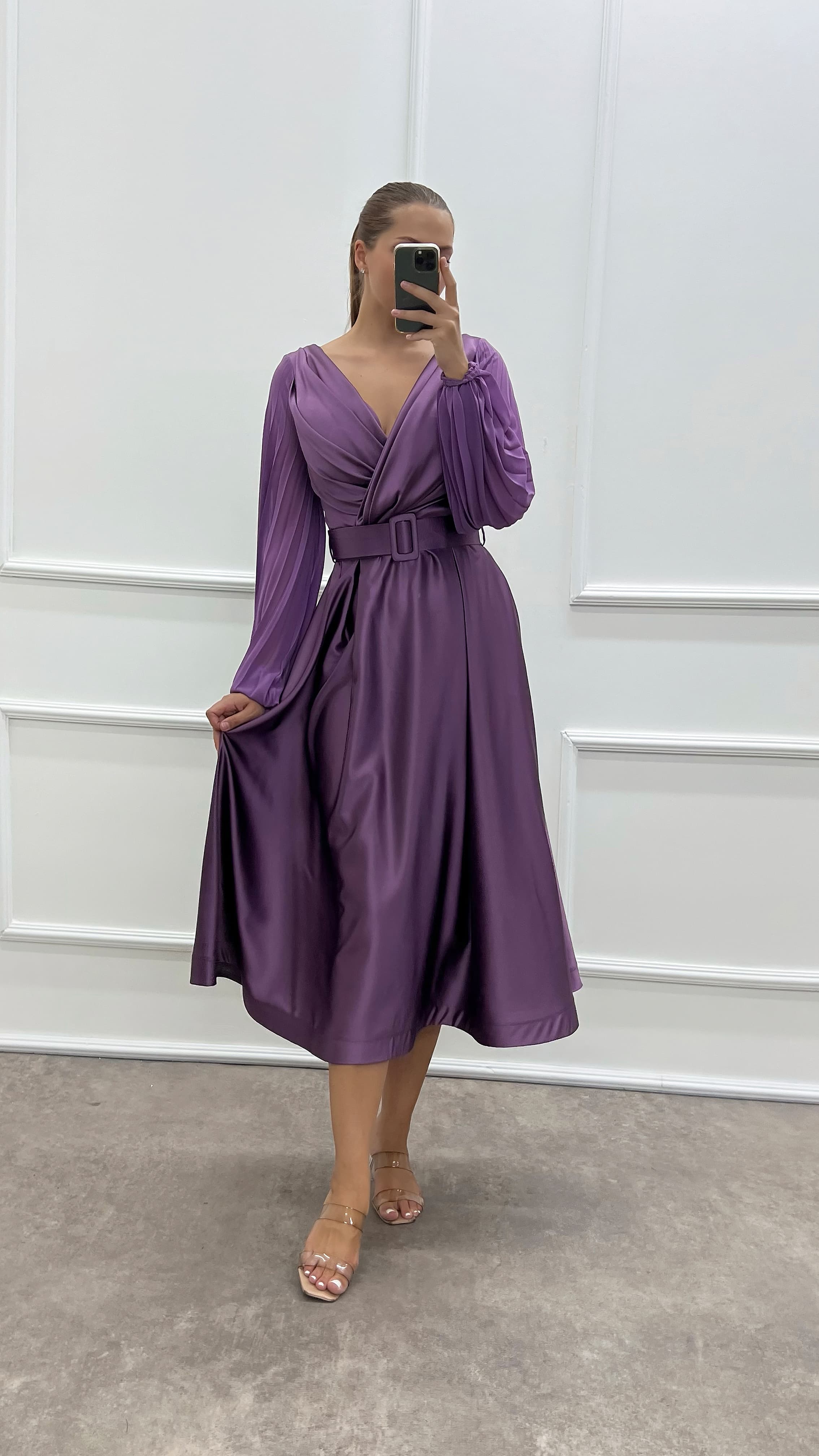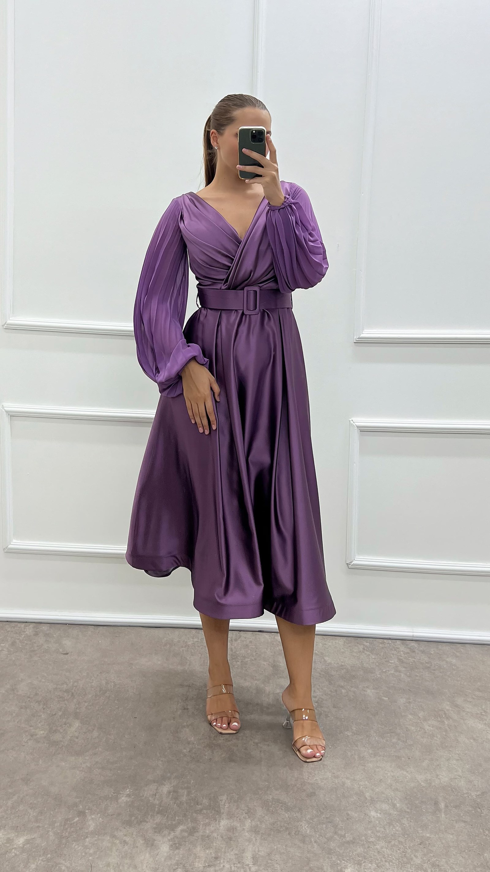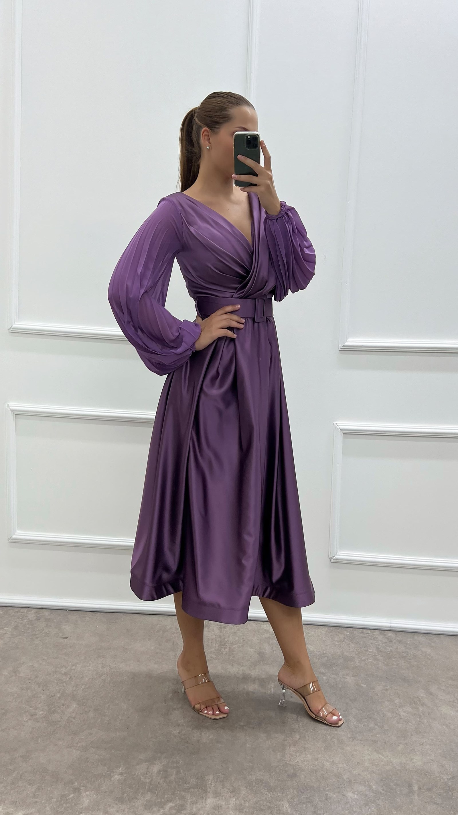 • Lila Göğsü Kruvaze Balon Kol Tasarım Büyük Beden Saten Elbise