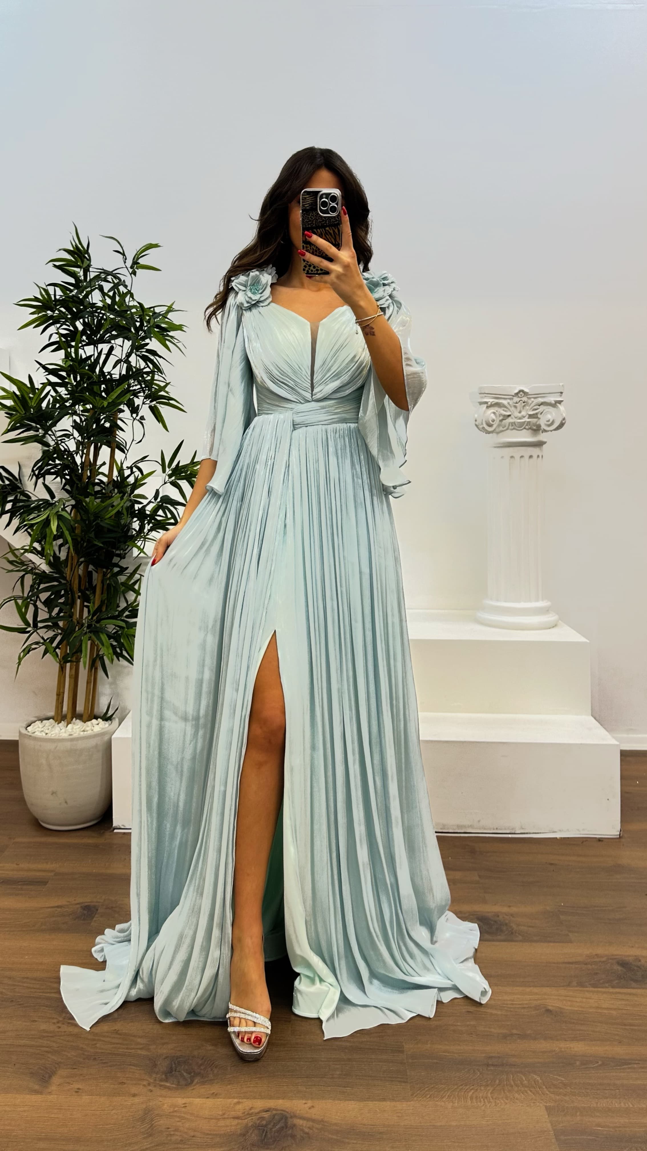 Vestido de noche plisado con detalles de flores El vestido es compatible con tallas de la 36 a la 42, con almohadillas para el pecho incorporadas, forrado, cierre con cremallera en la parte posterior, con abertura, plisado y diseñado con accesorio desmontable. La longitud del vestido puede variar entre 165-170 cm. Tipo de tela: chiffon 66%, viscosa 34%, poliéster.