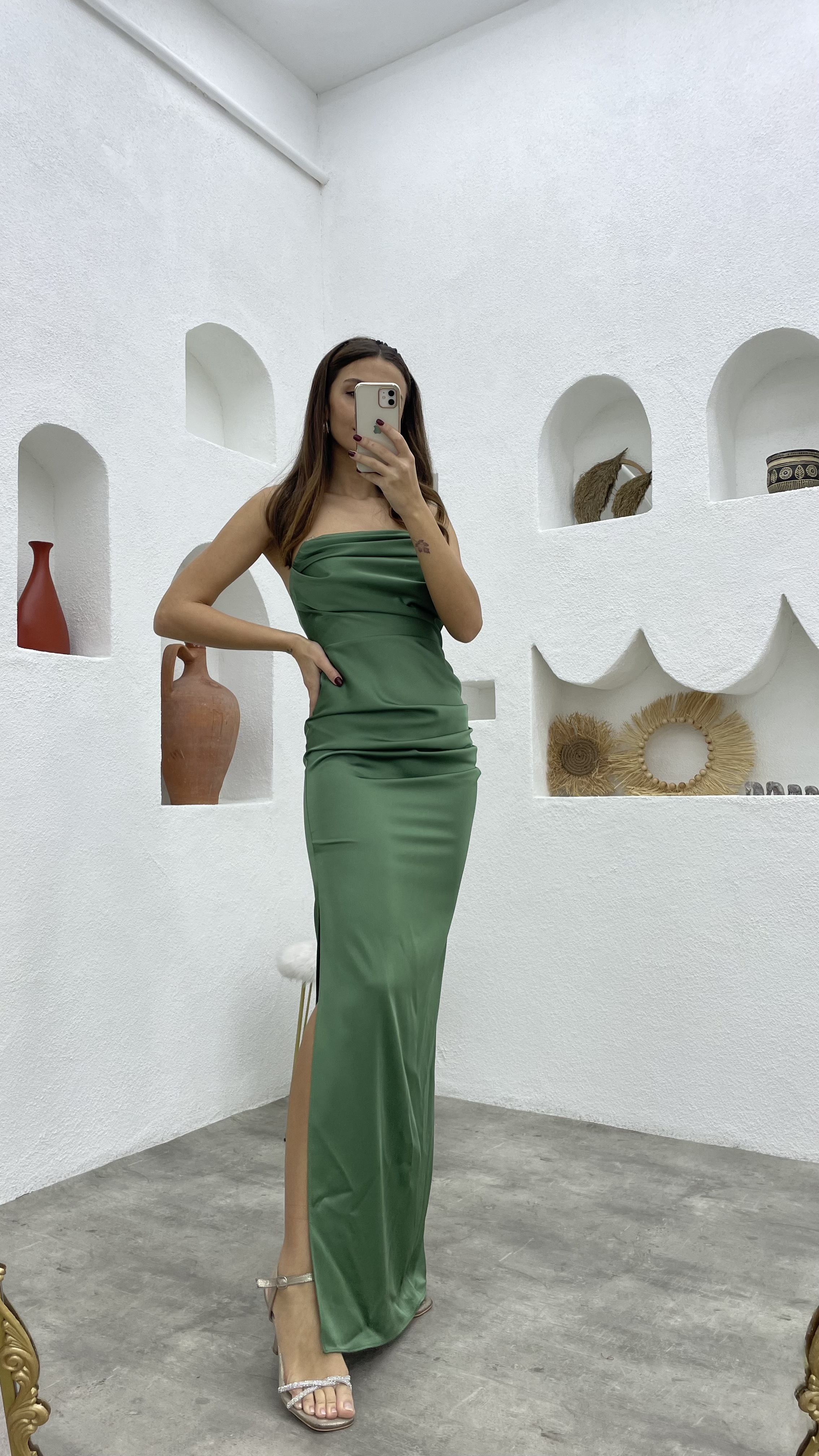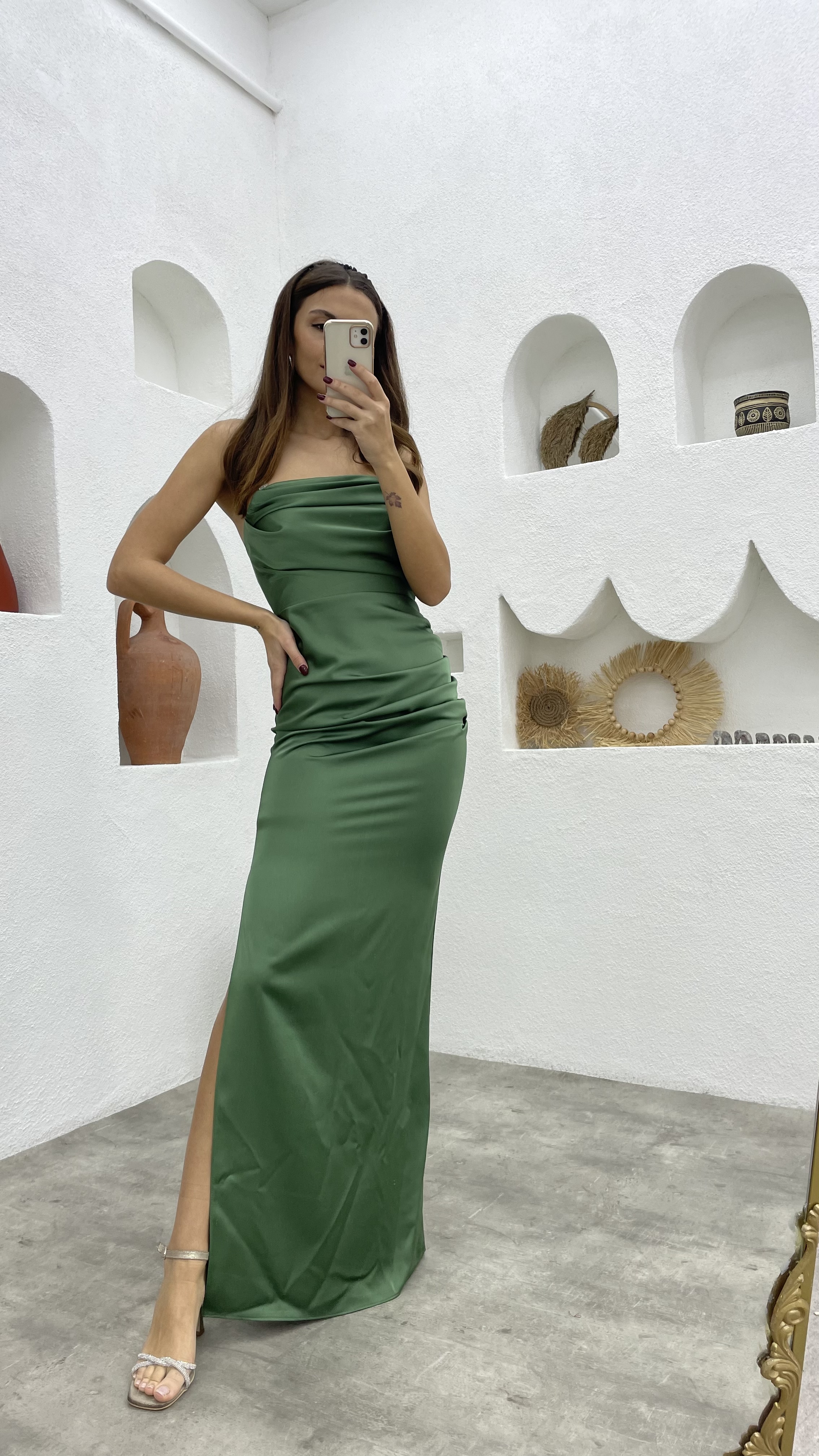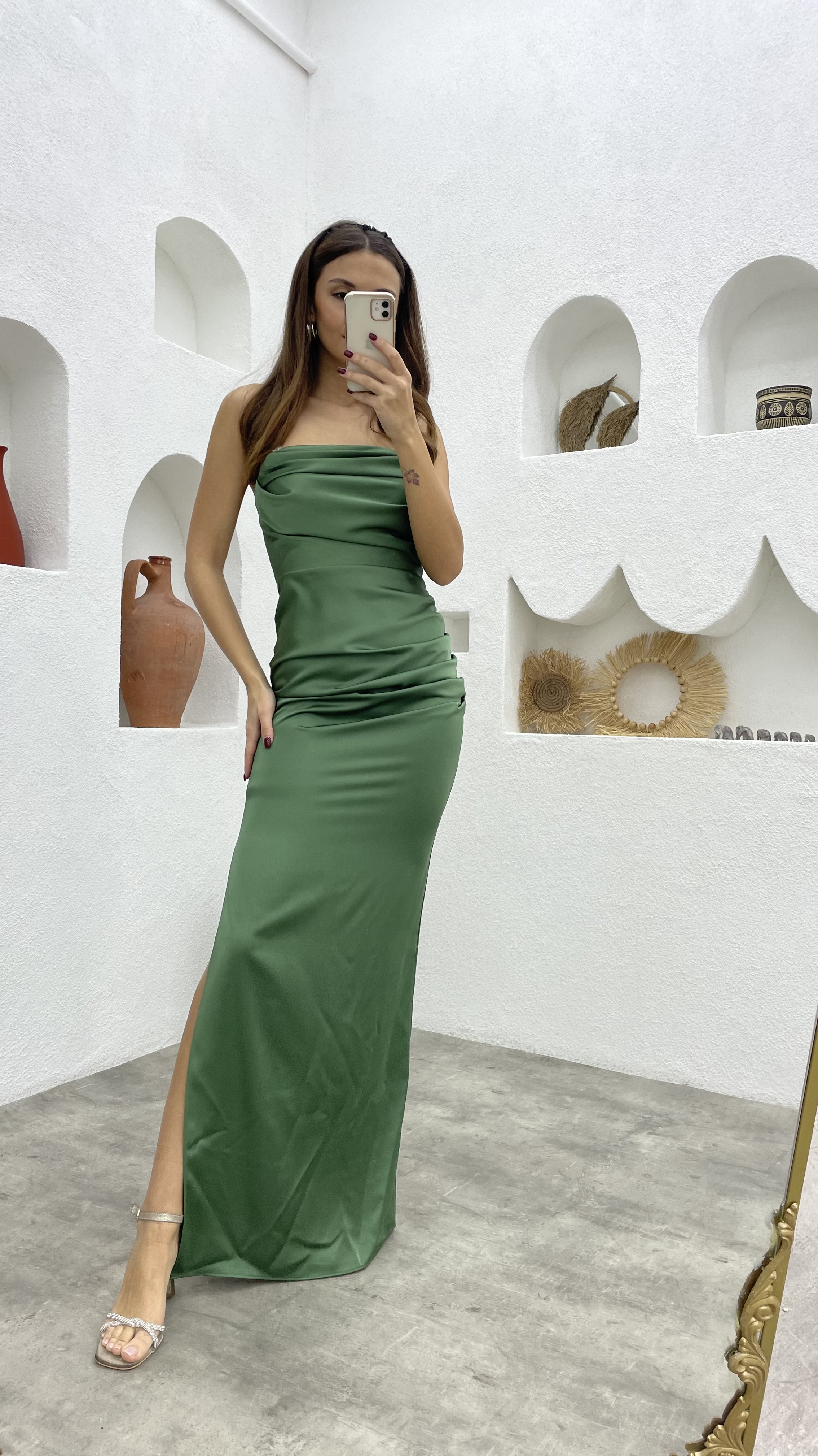 • Vestido de noche de satén fruncido sin tirantes verde menta
