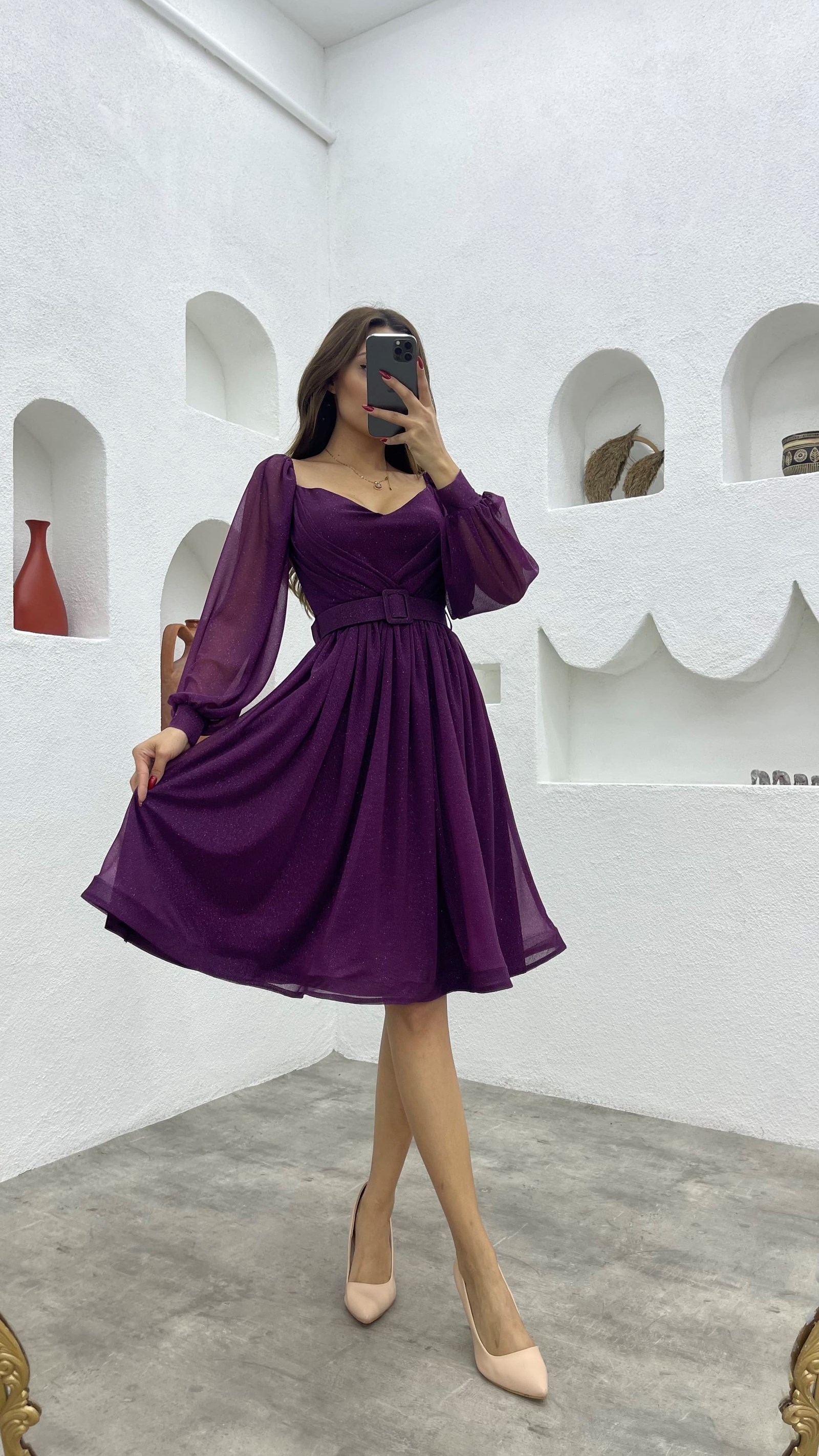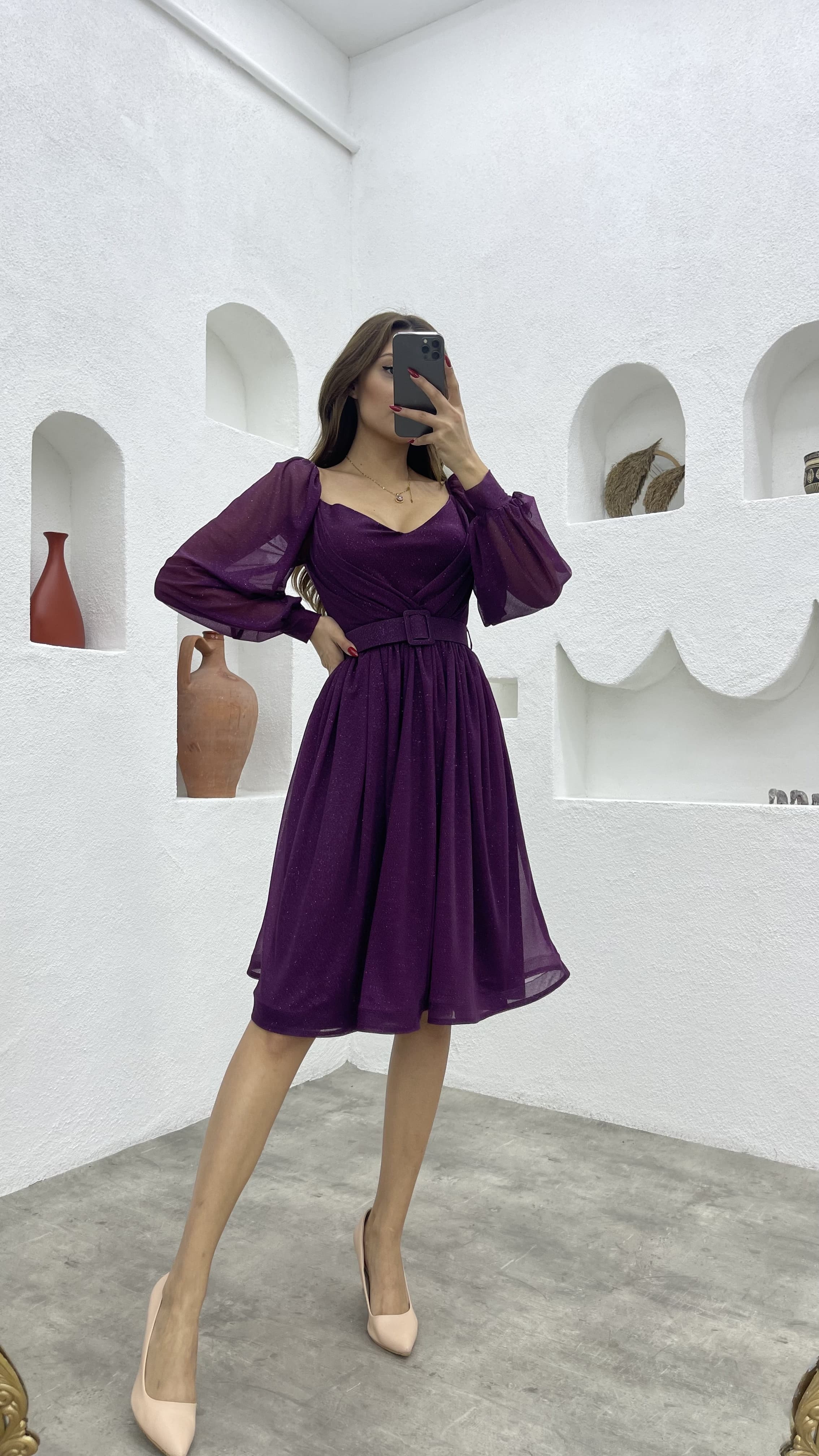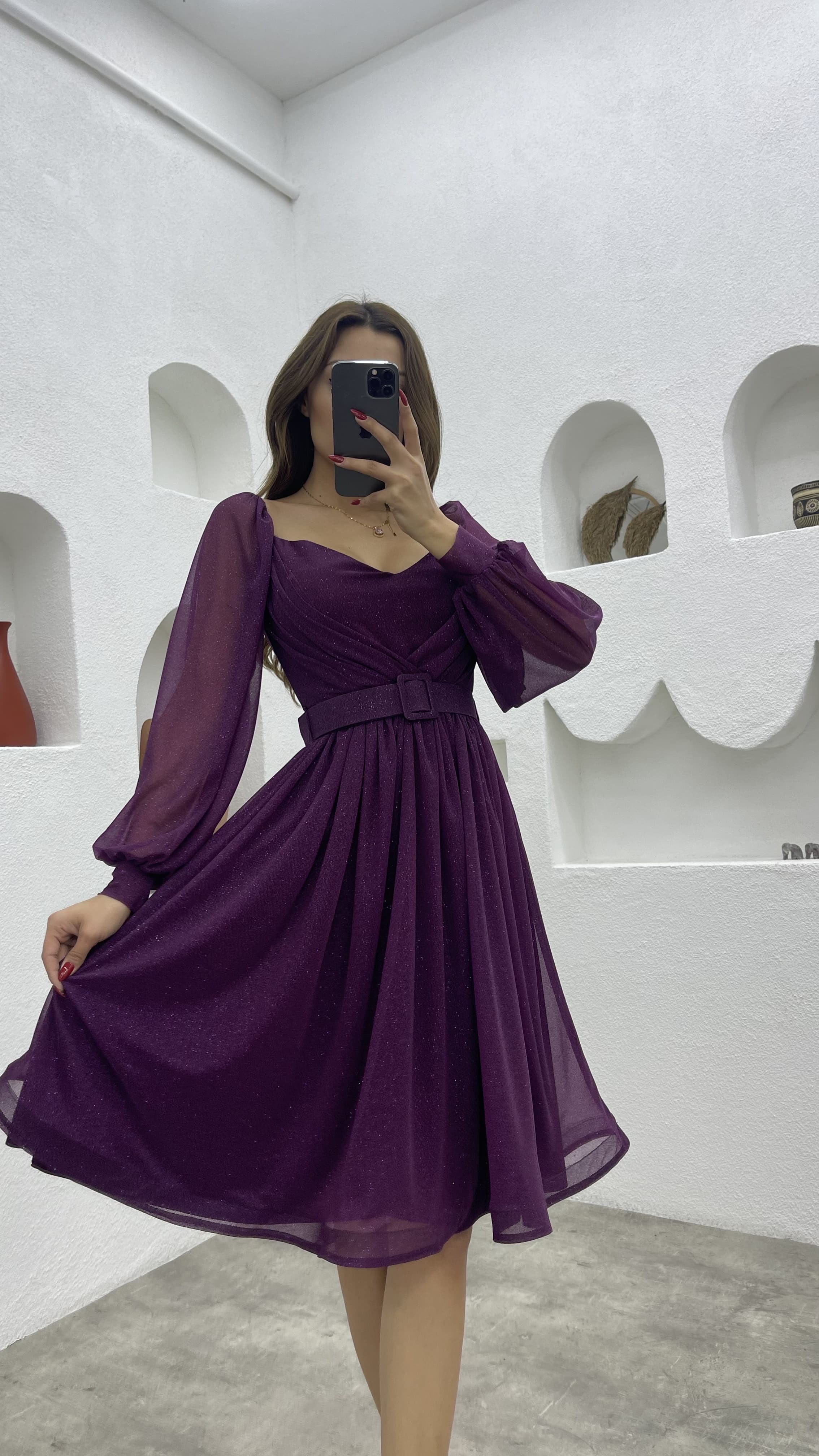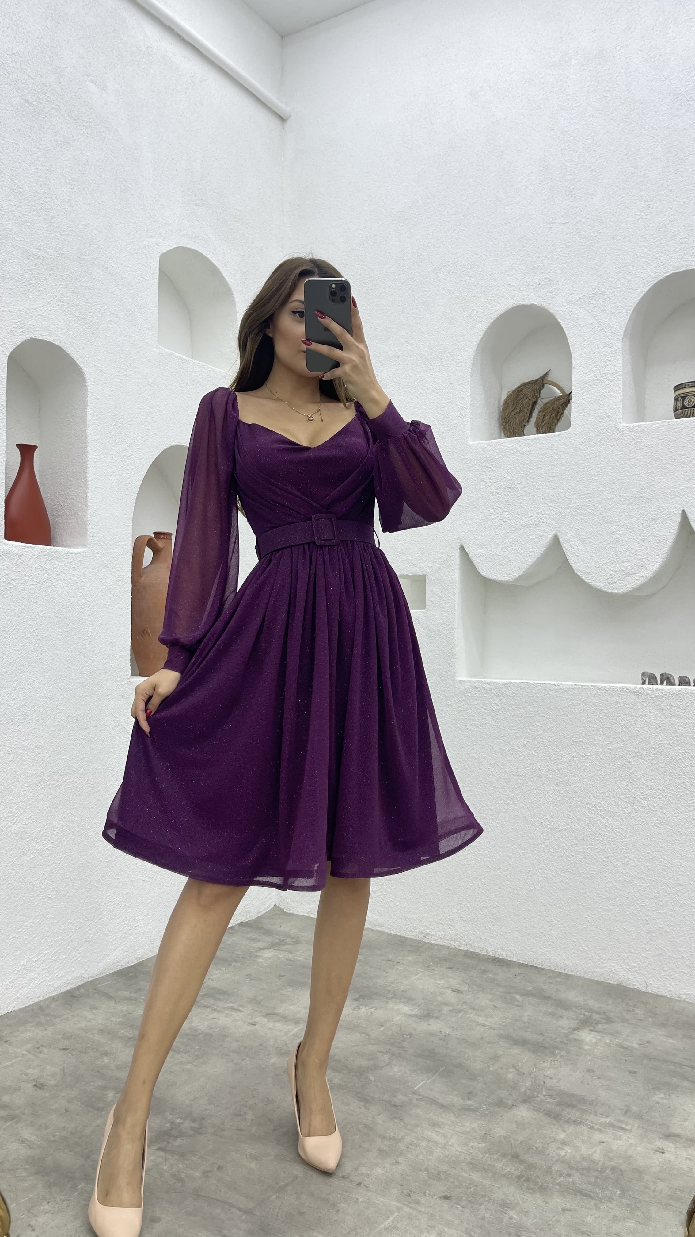 Mürdüm Kemerli Simli Tül Abiye Elbise