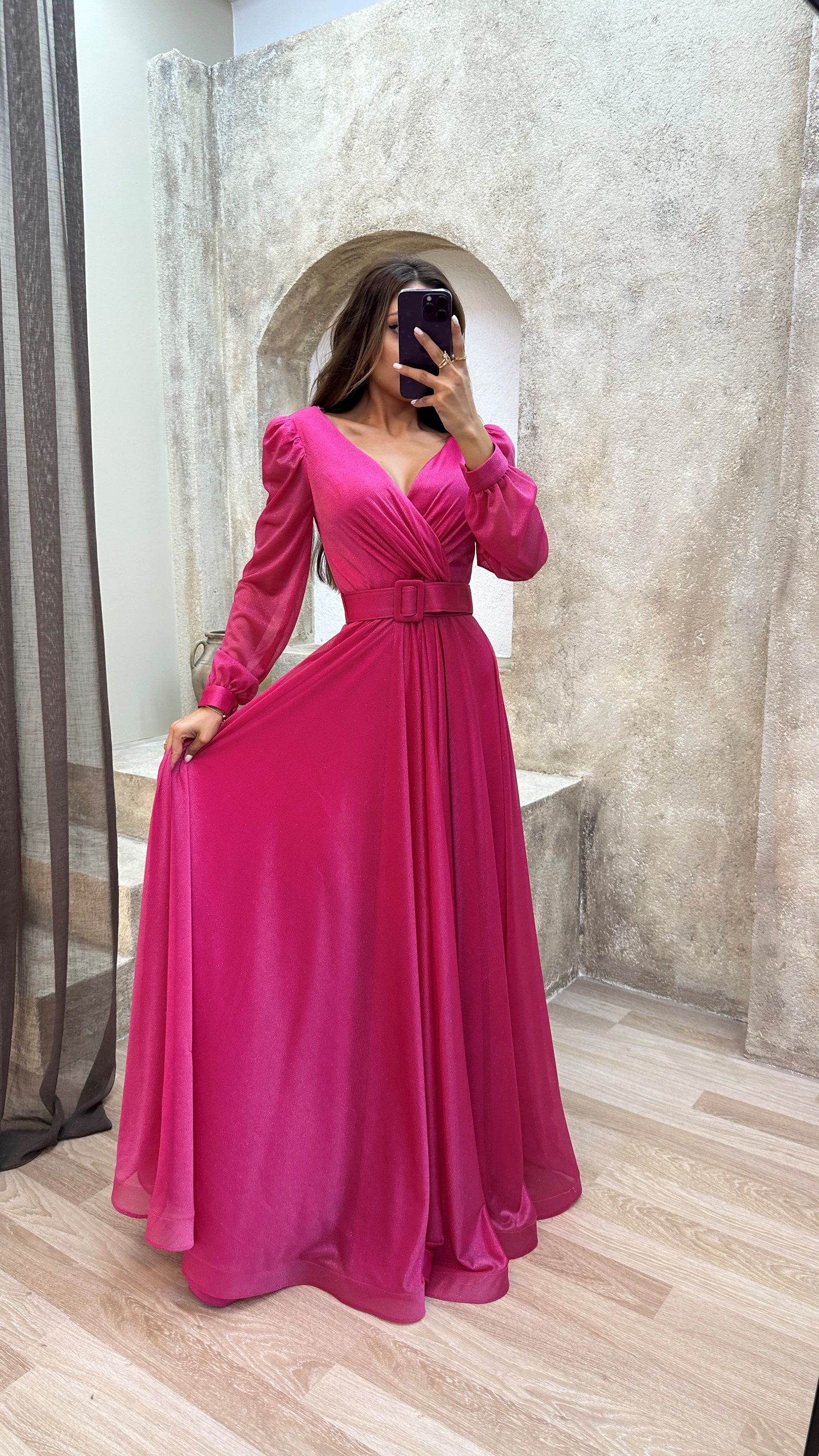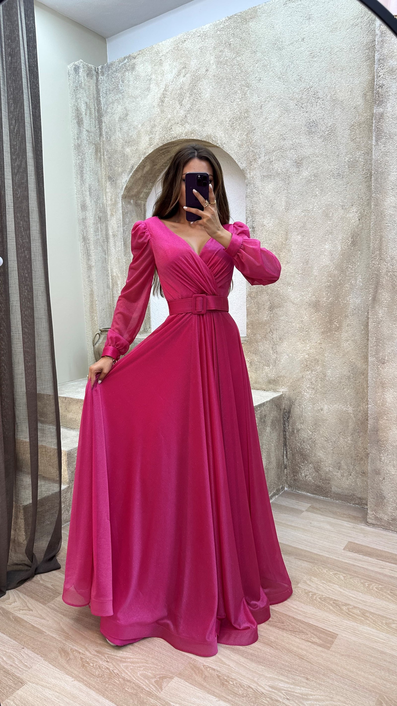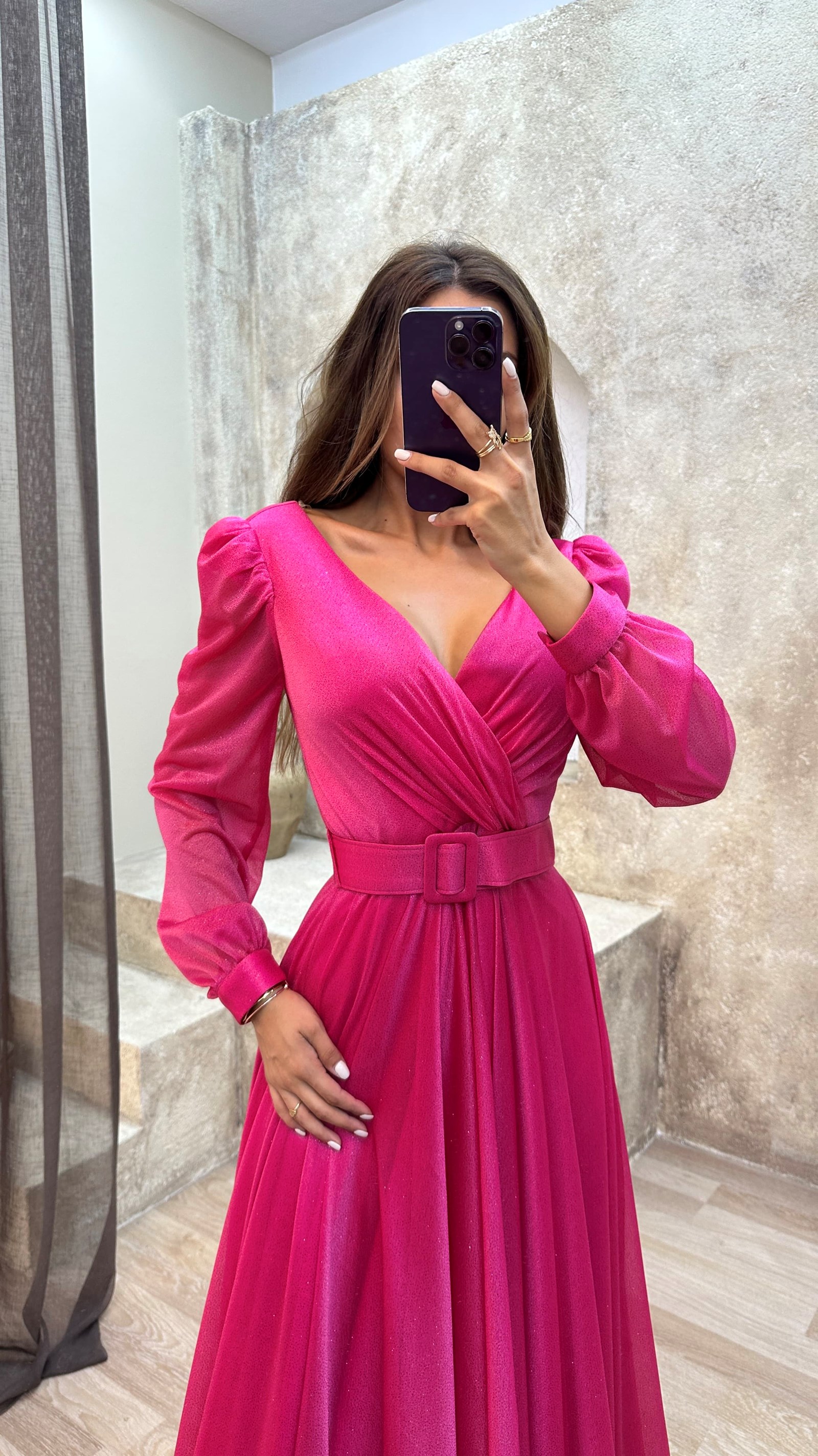 • Pembe Balon Kol V Yaka Abiye Elbise