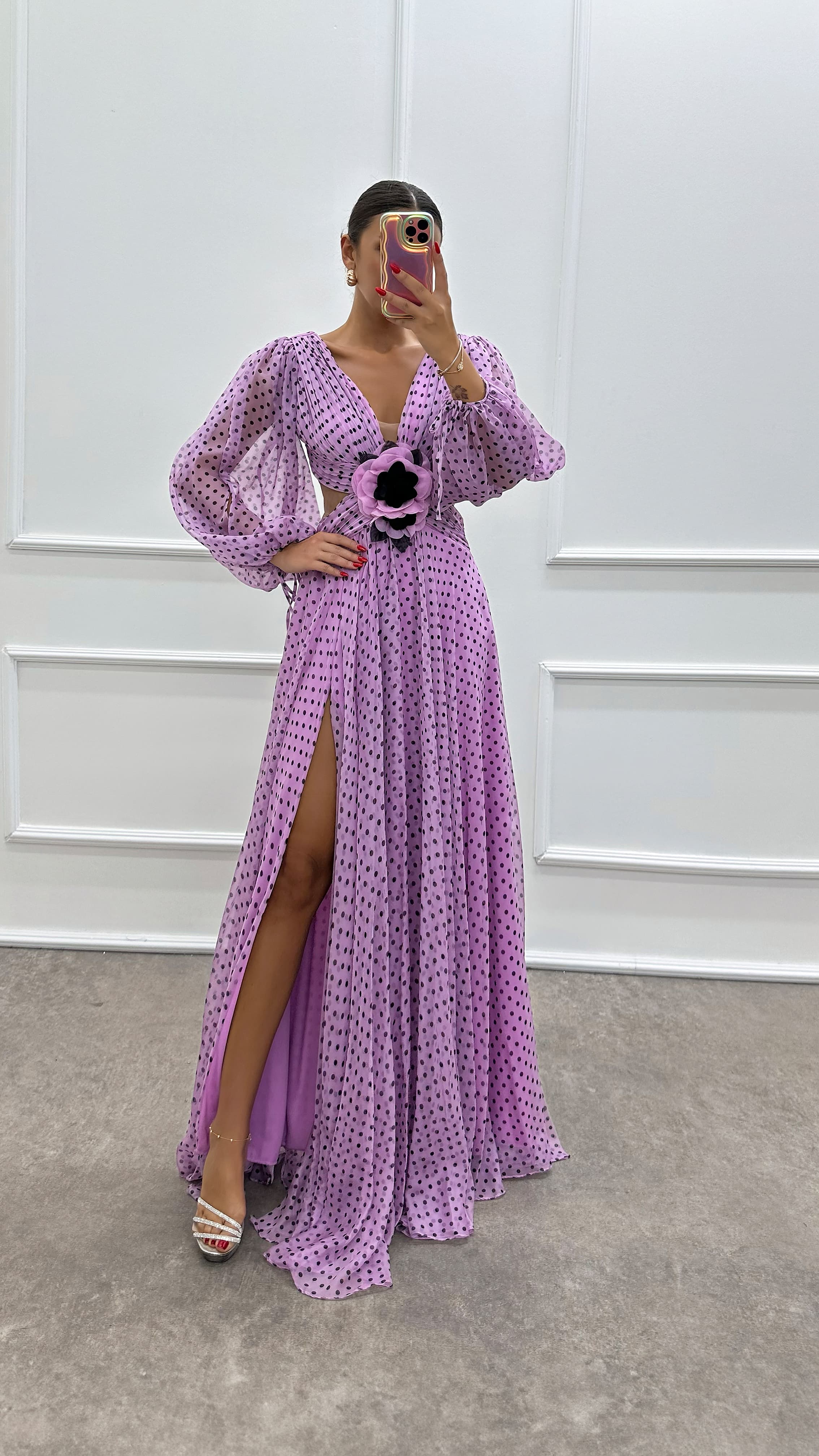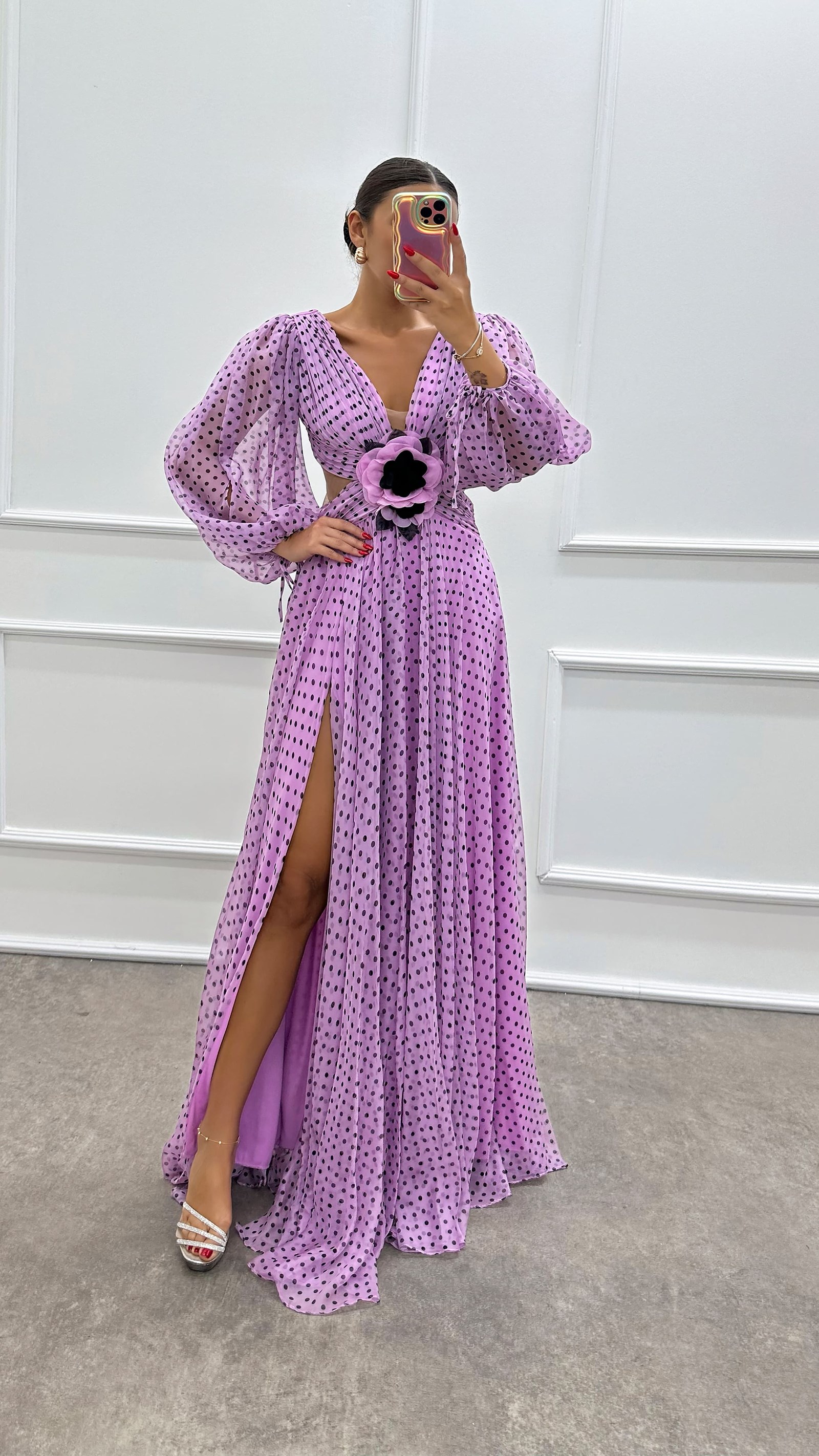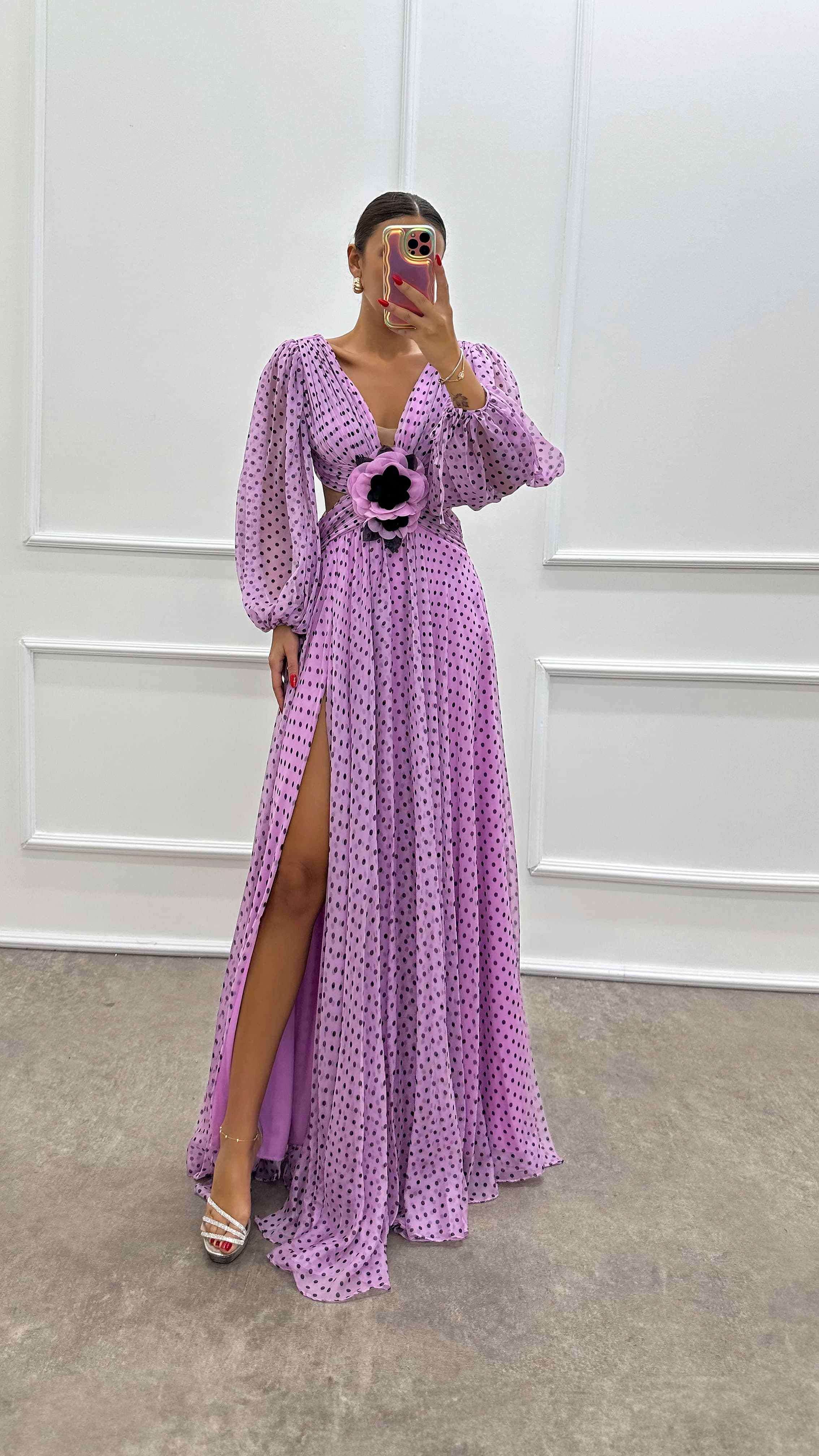 • Saks V Yaka Beli Transparan Abiye Elbise