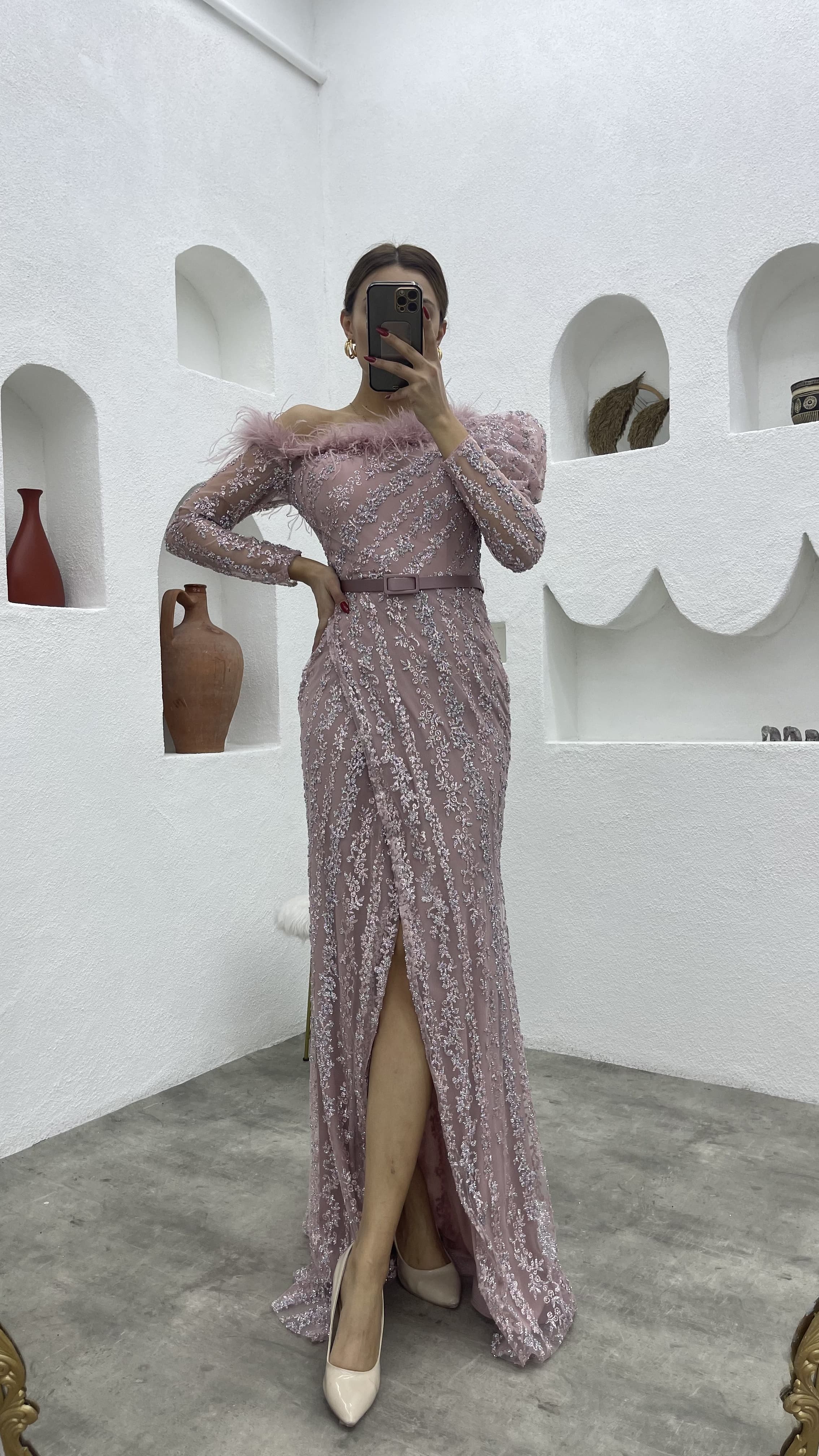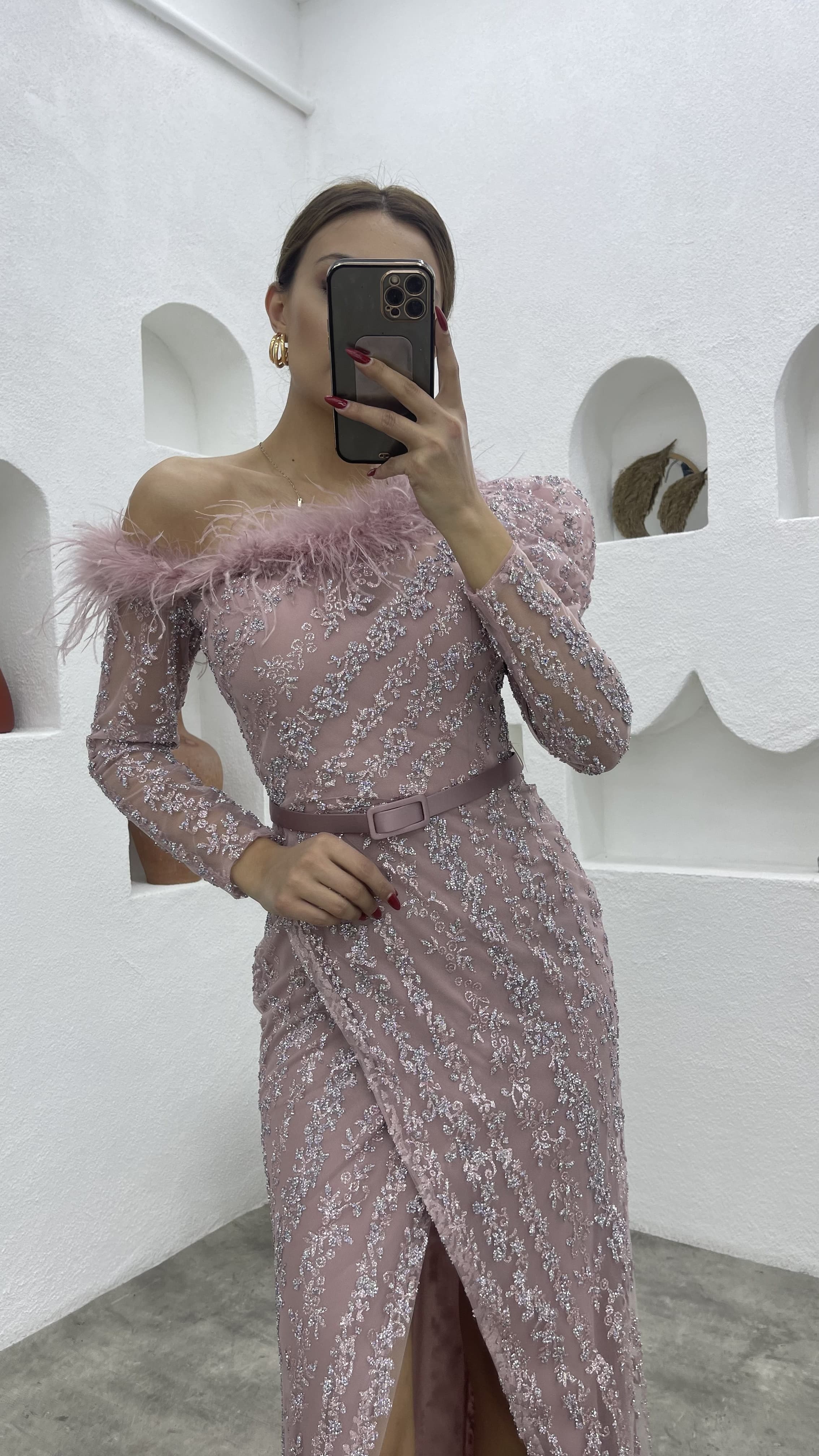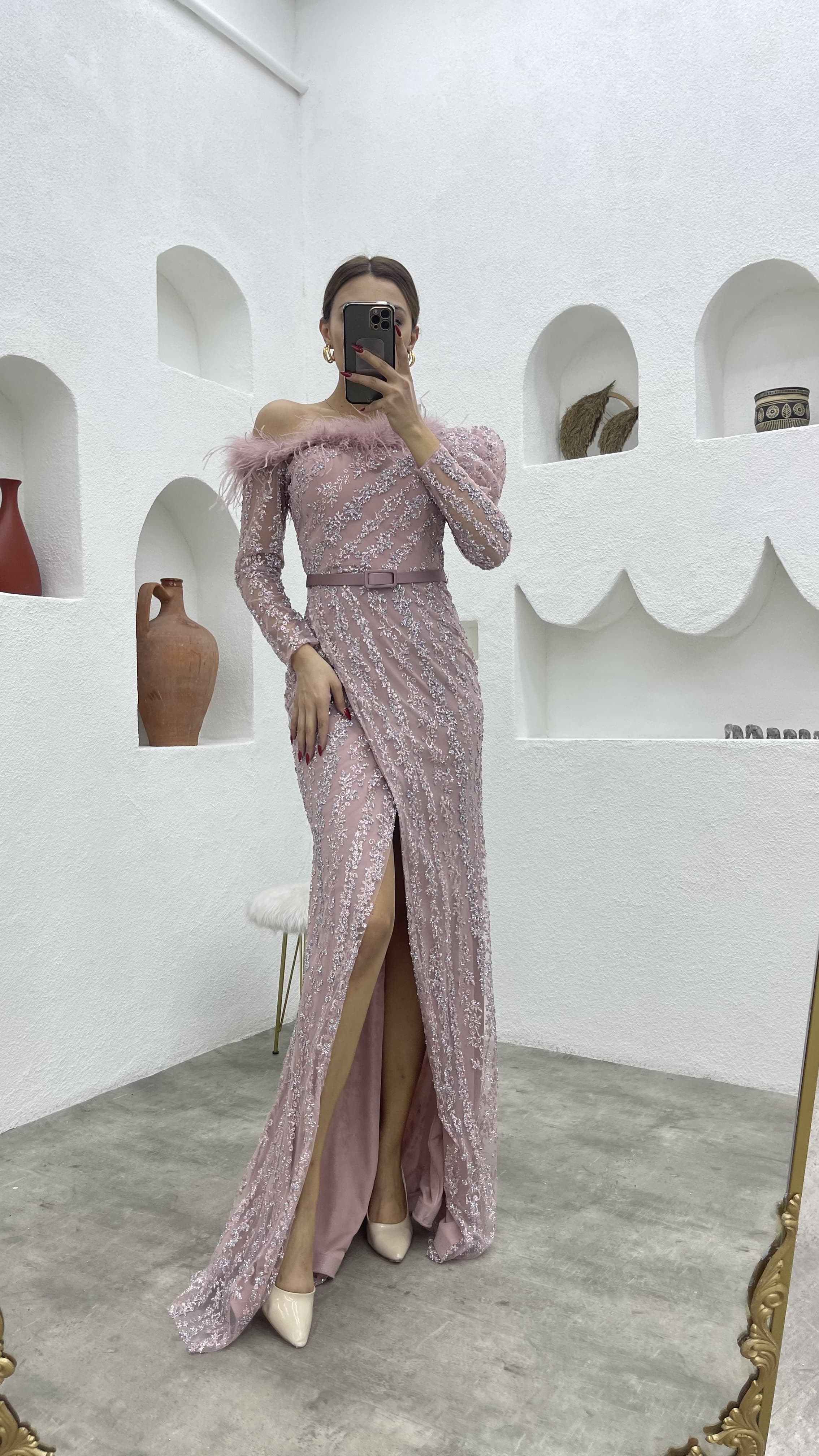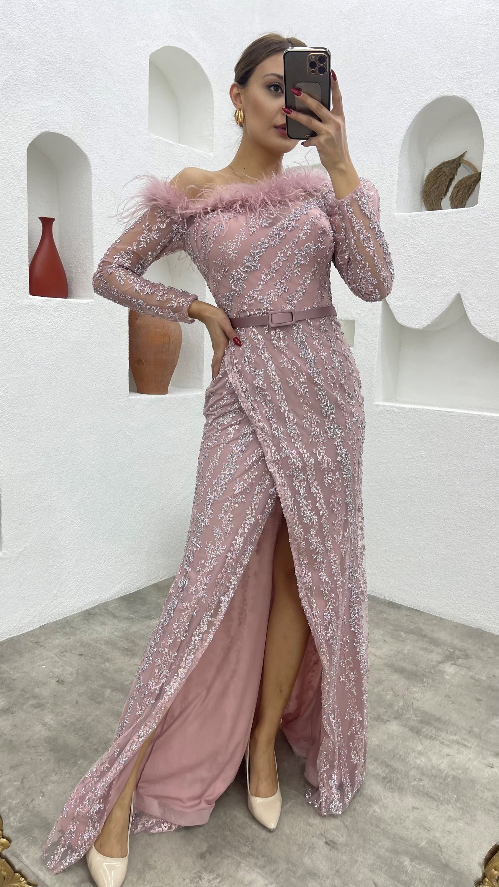 • Pudra İşlemeli Tüylü Abiye Elbise