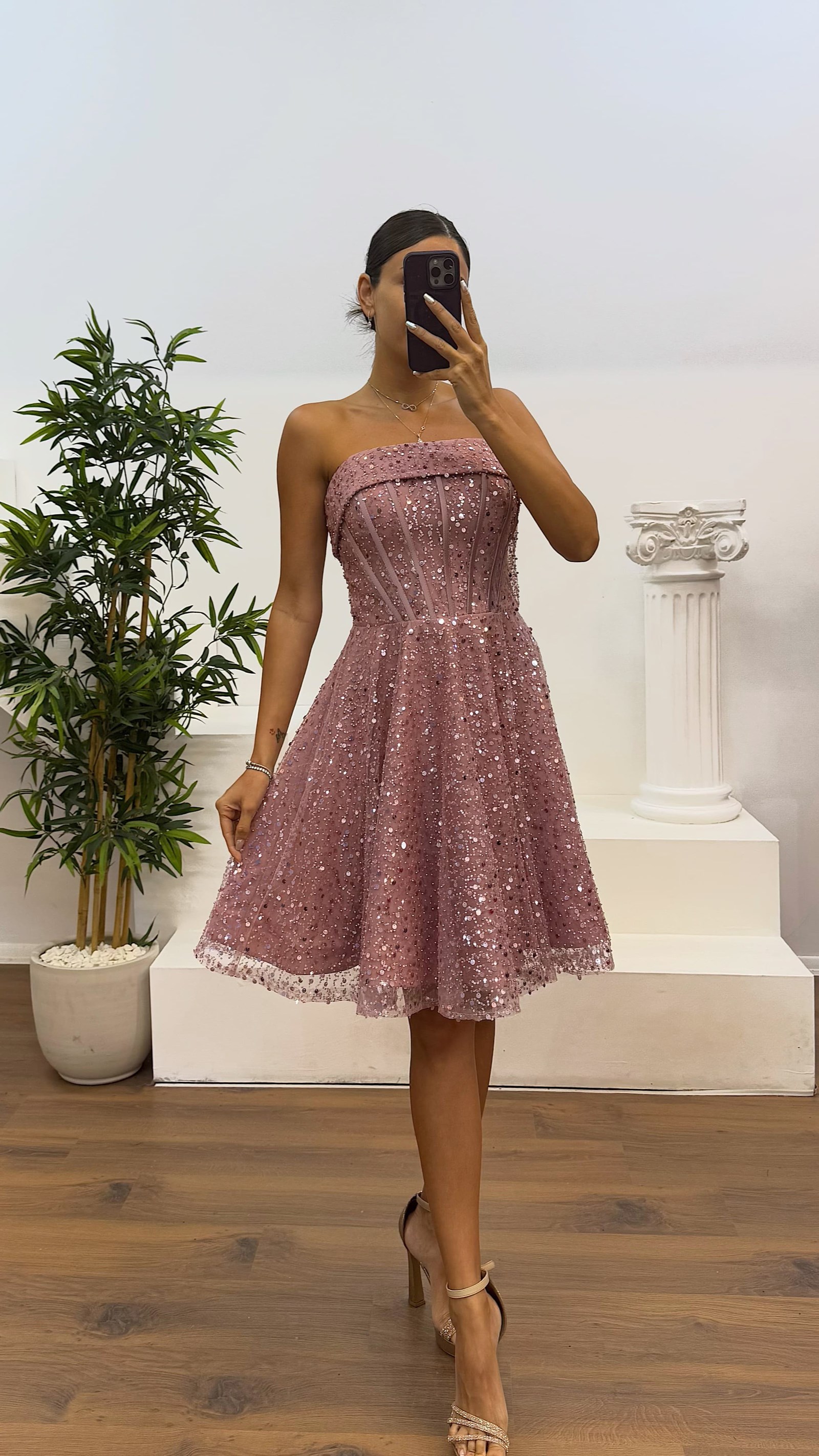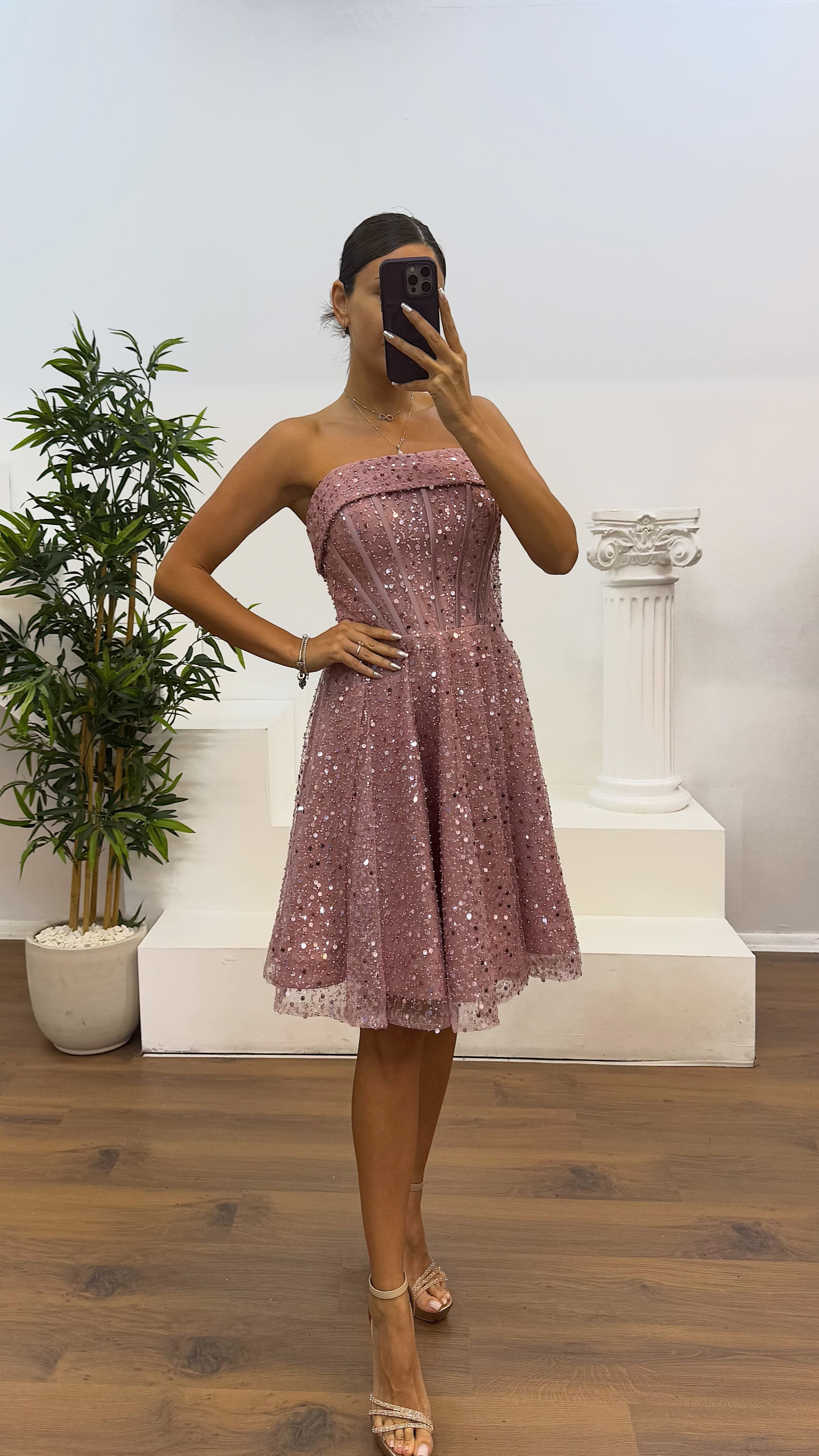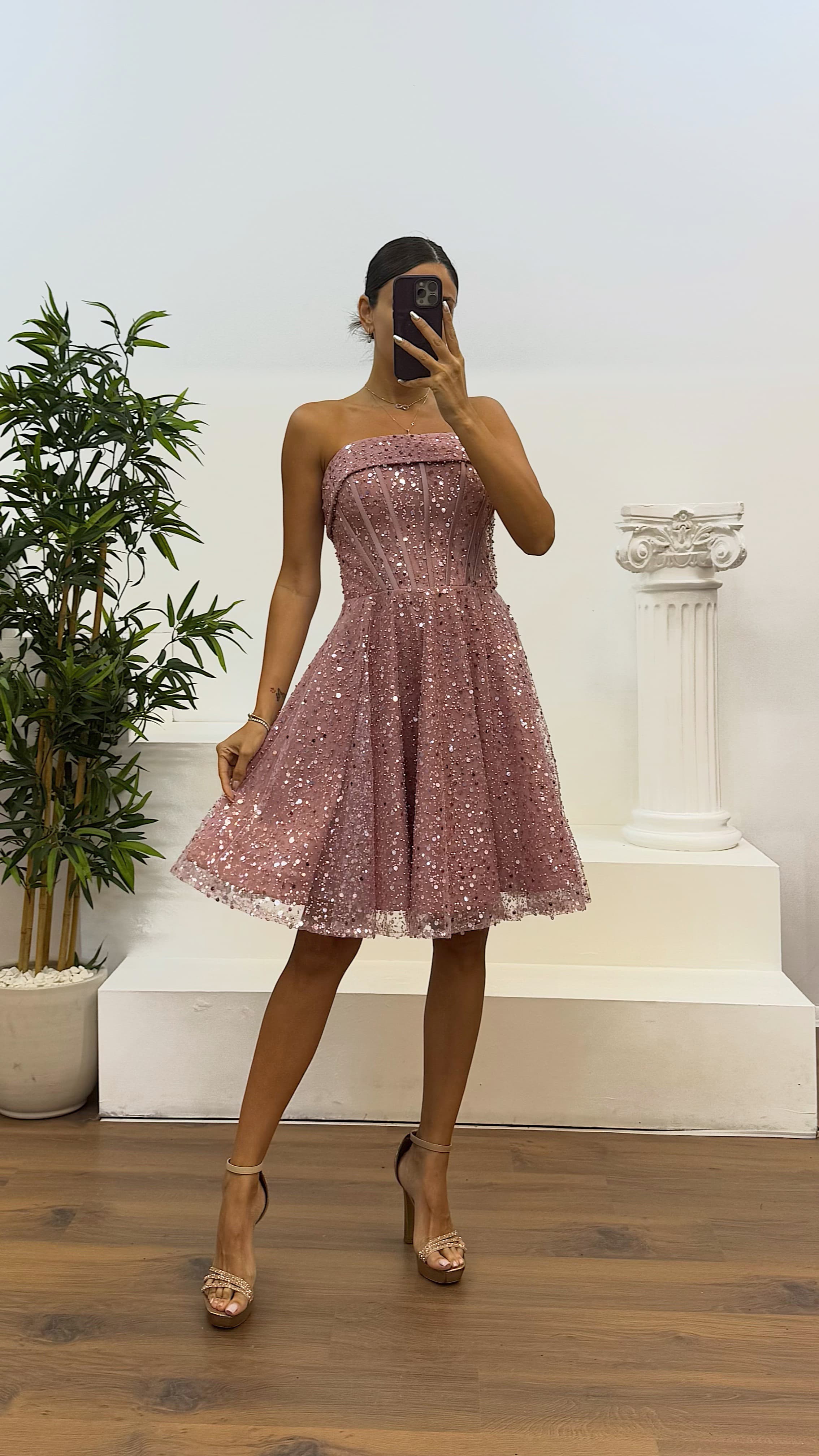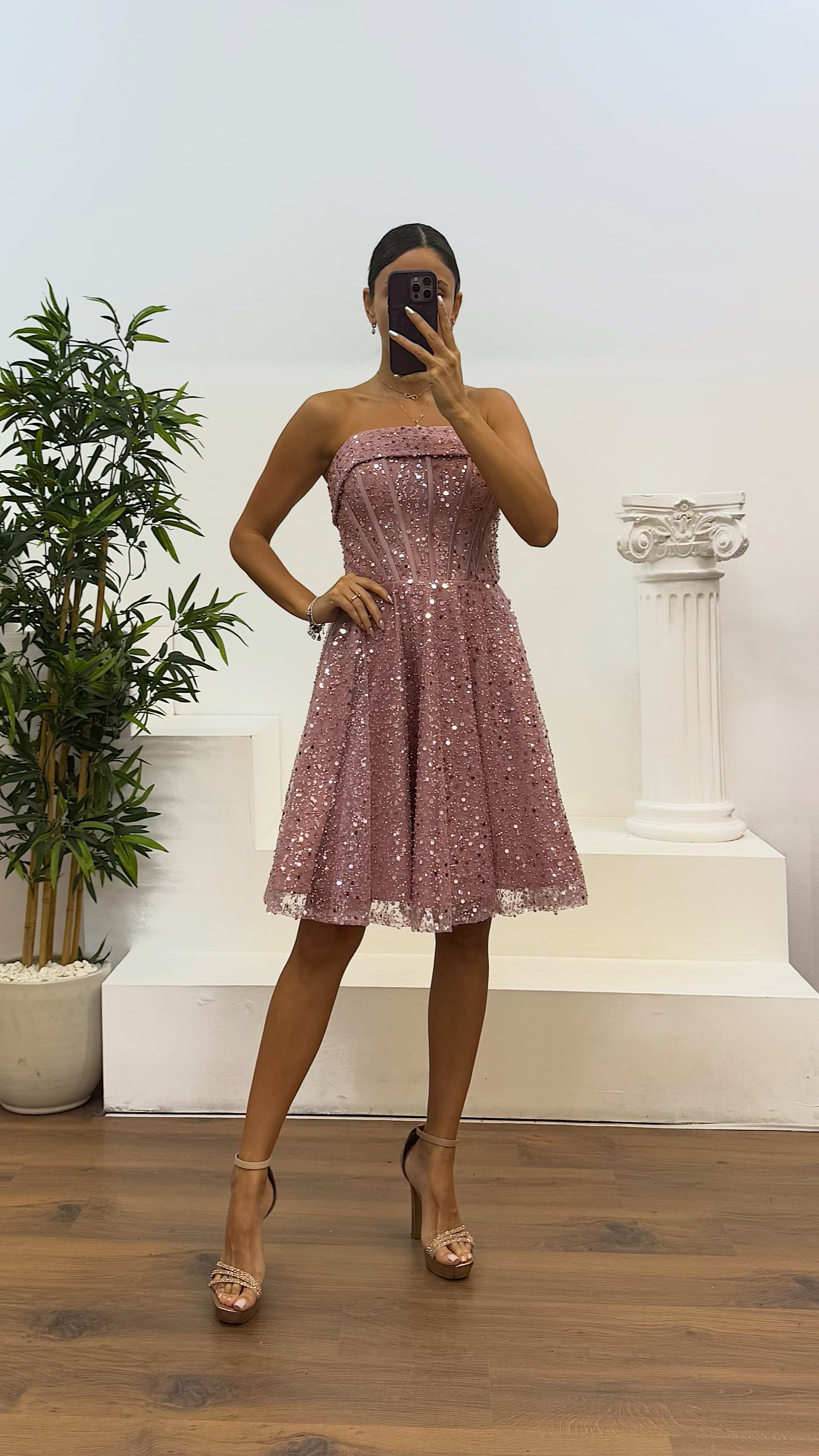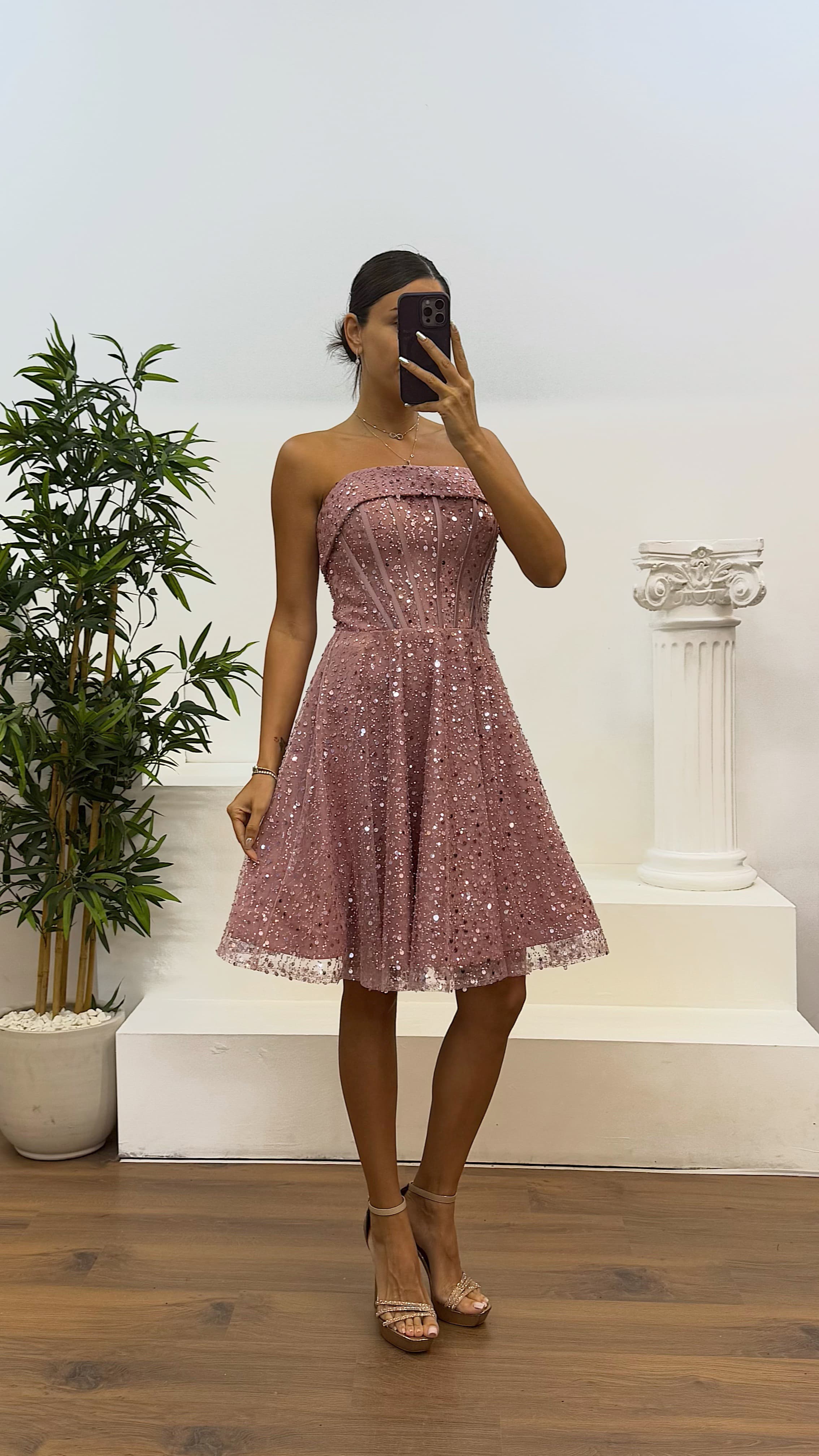 Pudra Straplez Boncuklu Mini Abiye Elbise
