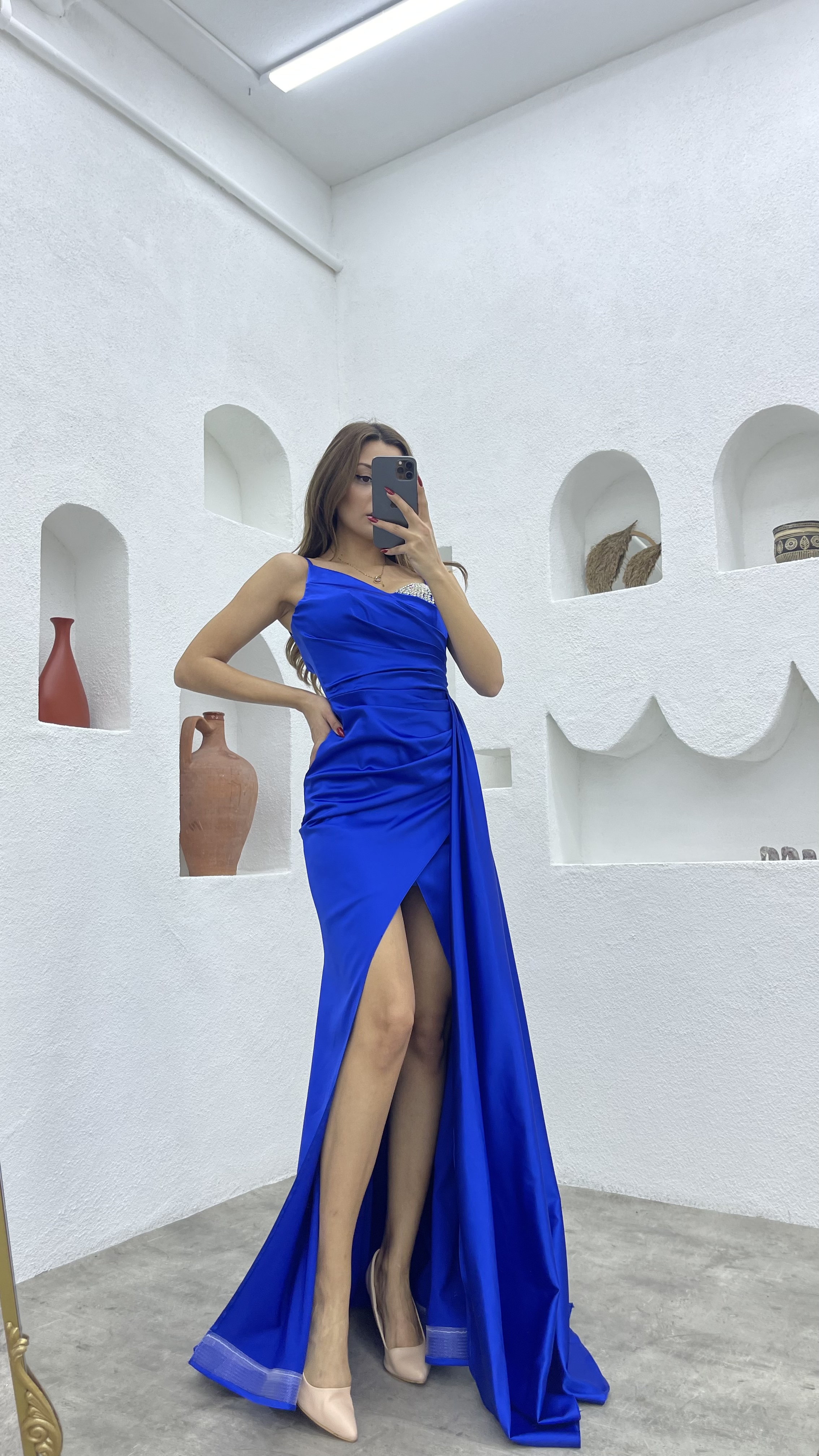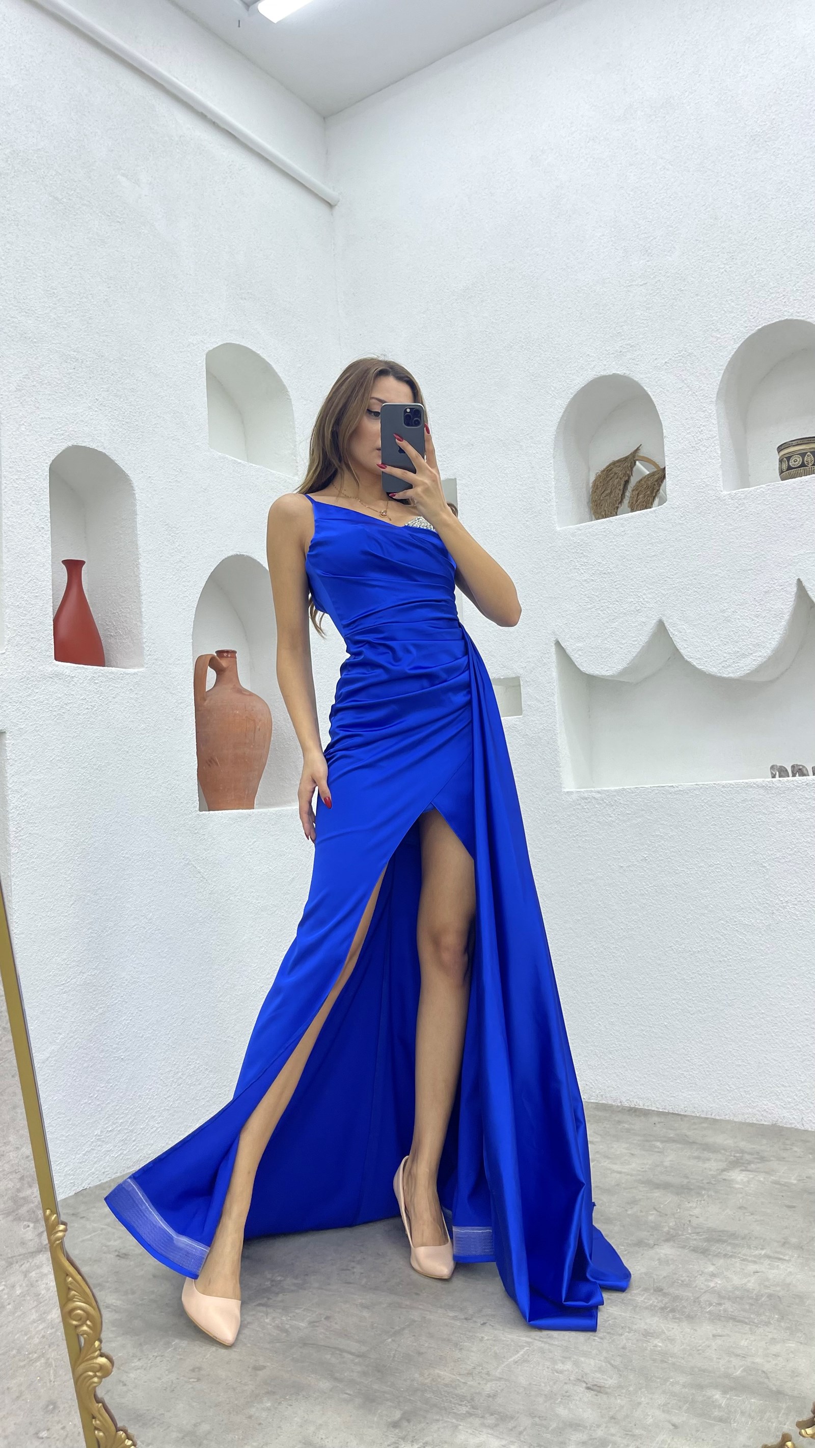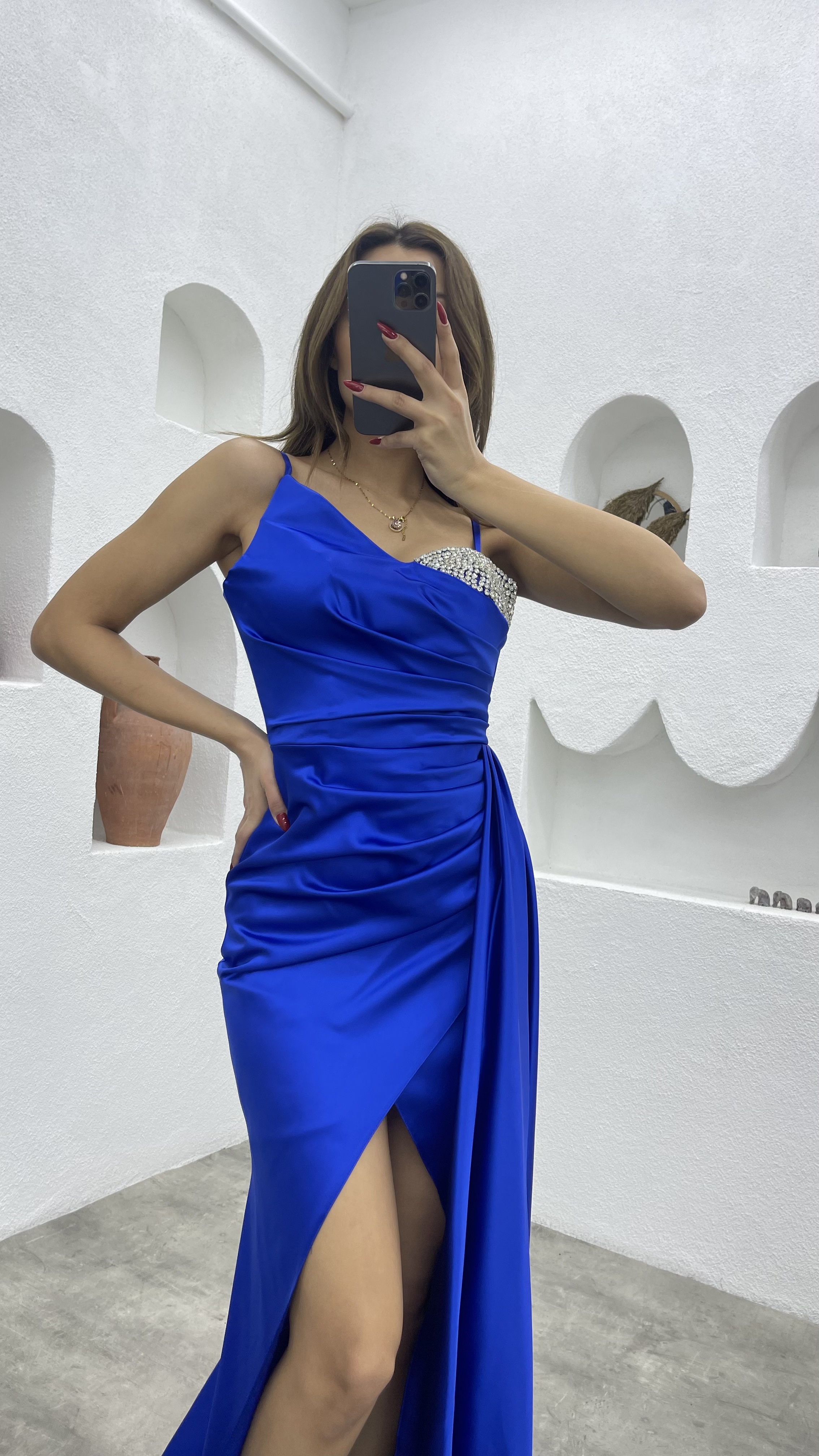 • Saks İp Askılı Göğsü İşlemeli Saten Abiye Elbise