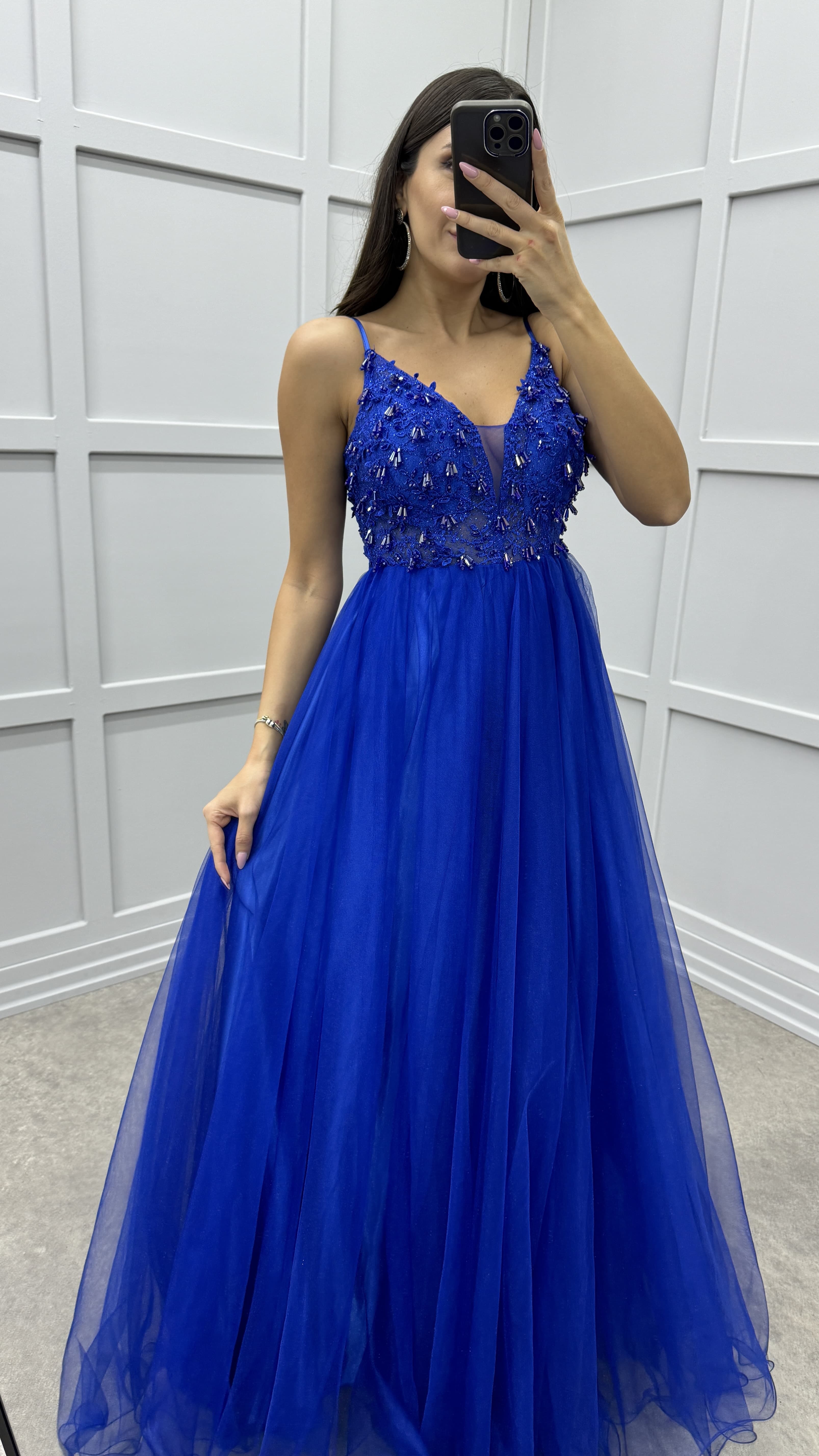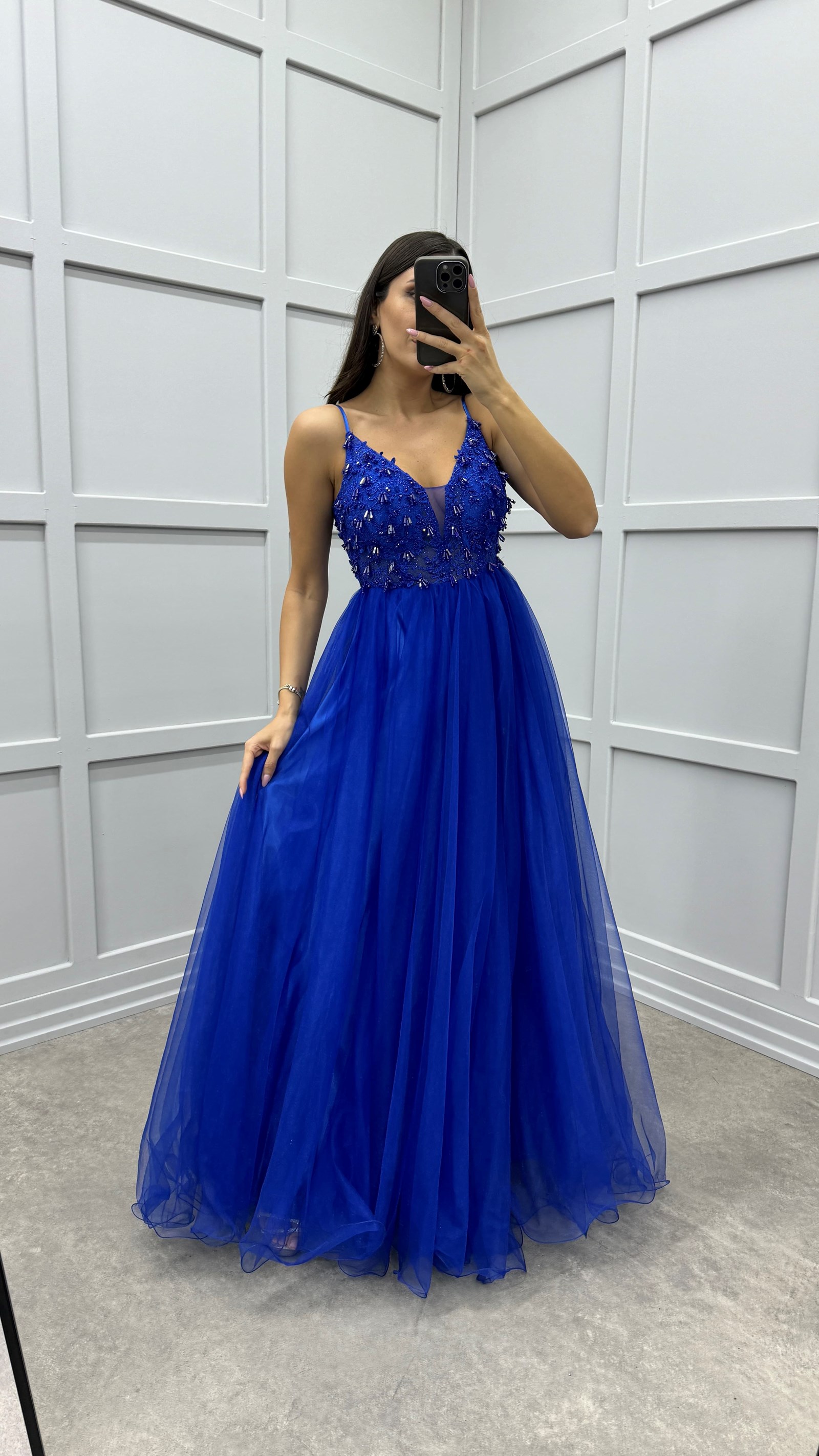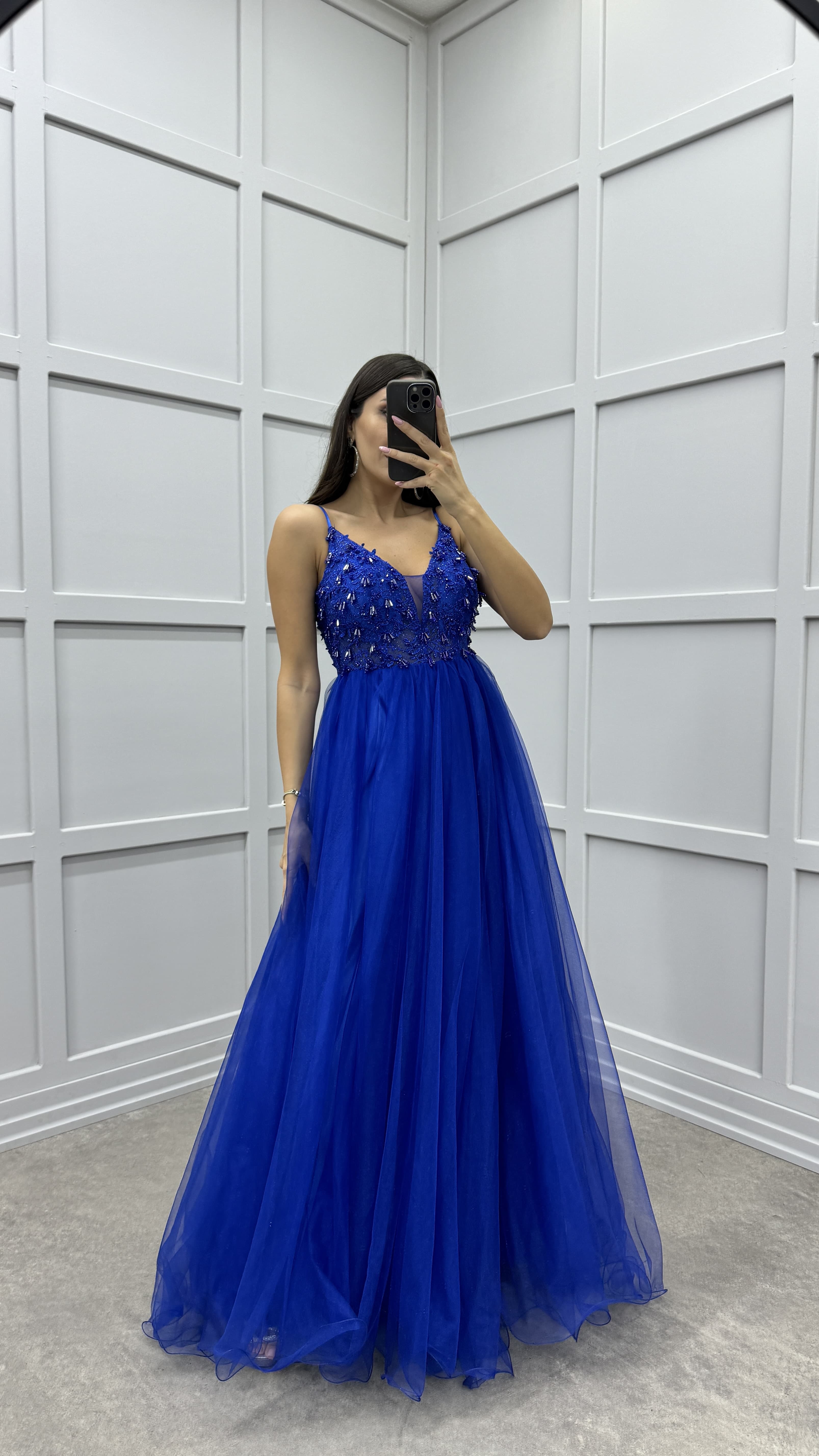 • Saks İp Askılı Göğüs Detay Tasarım Tül Abiye Elbise
