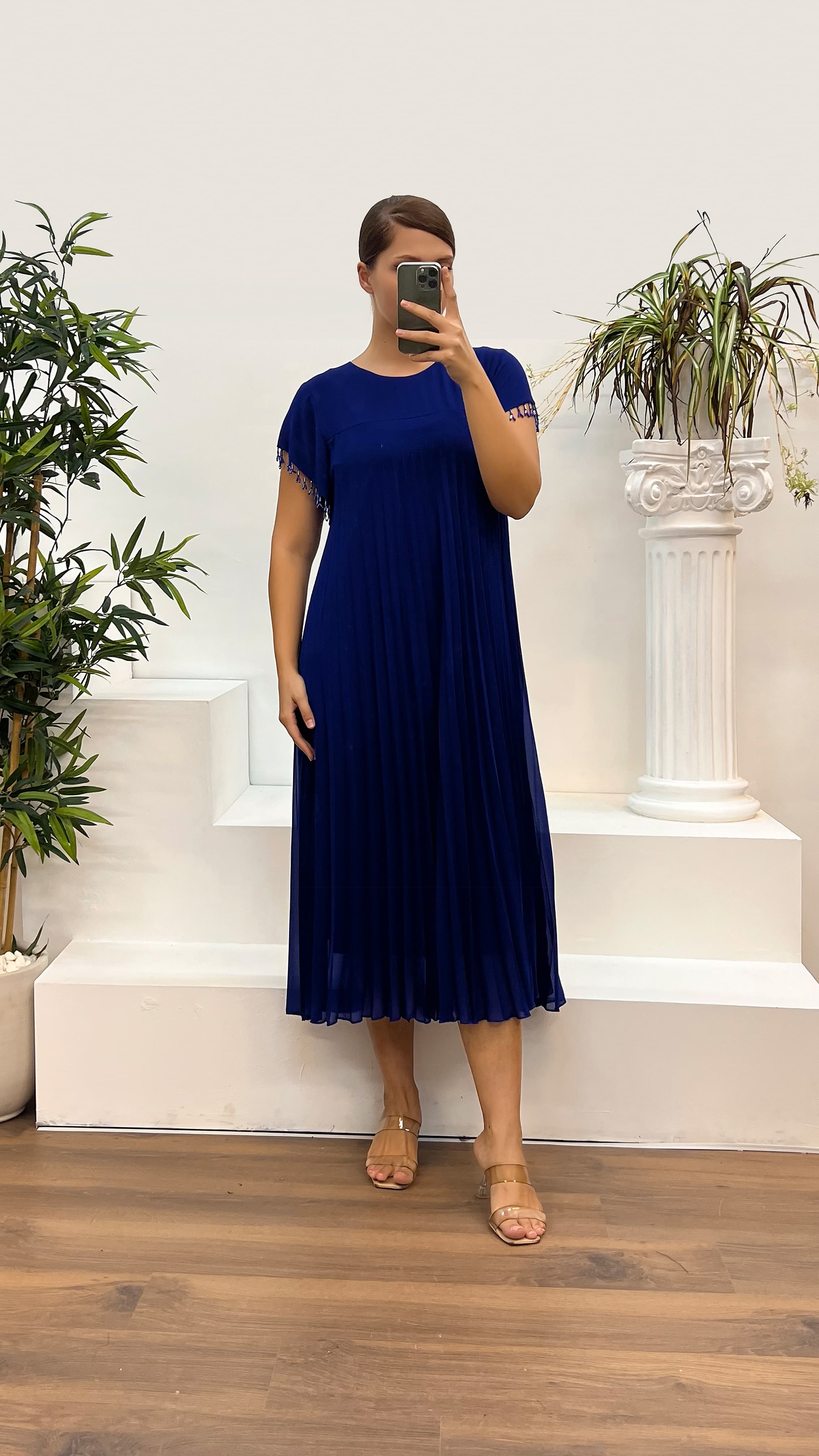 • Saks Pliseli Kolları İşlemeli Büyük Beden Abiye Elbise