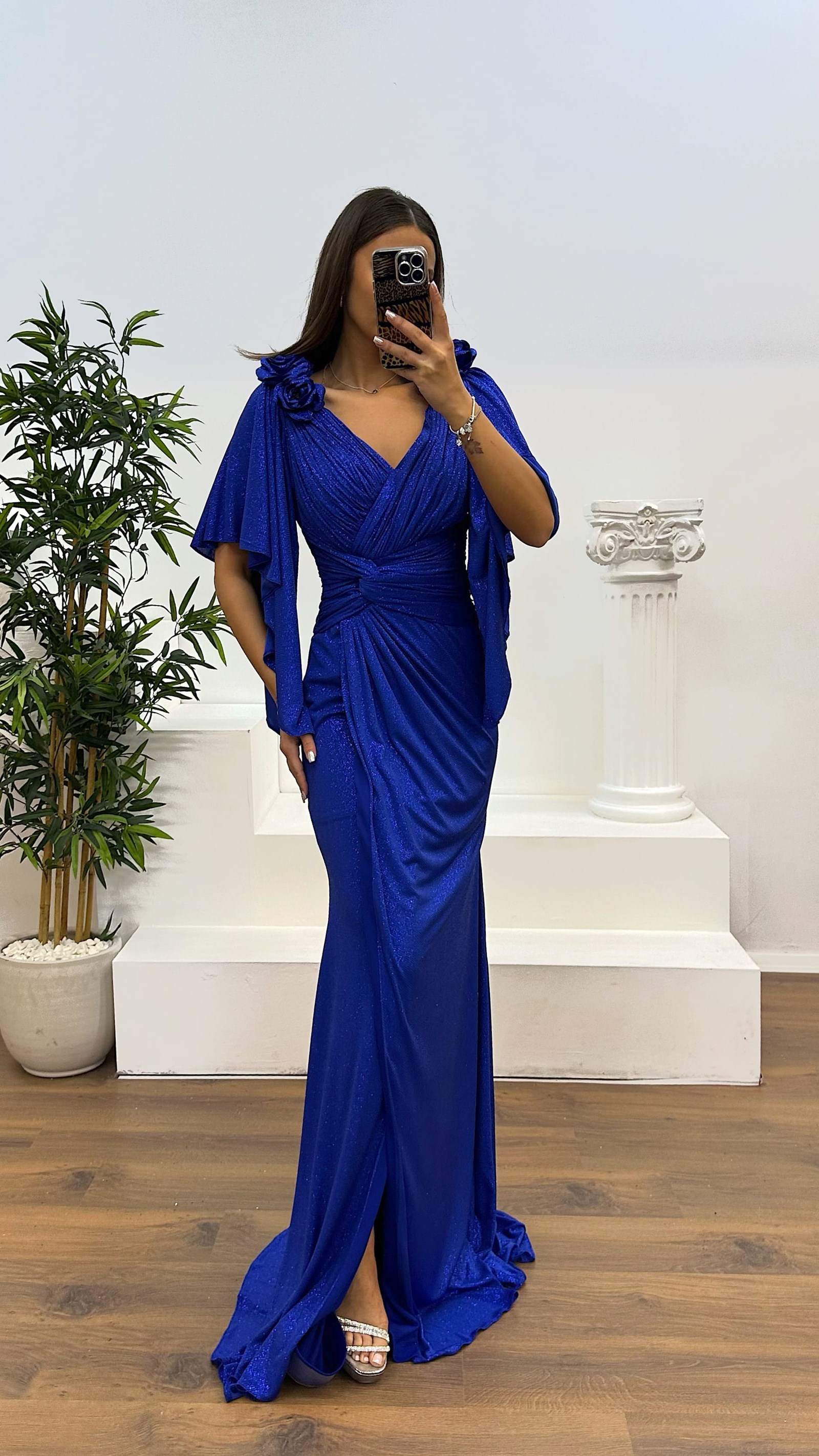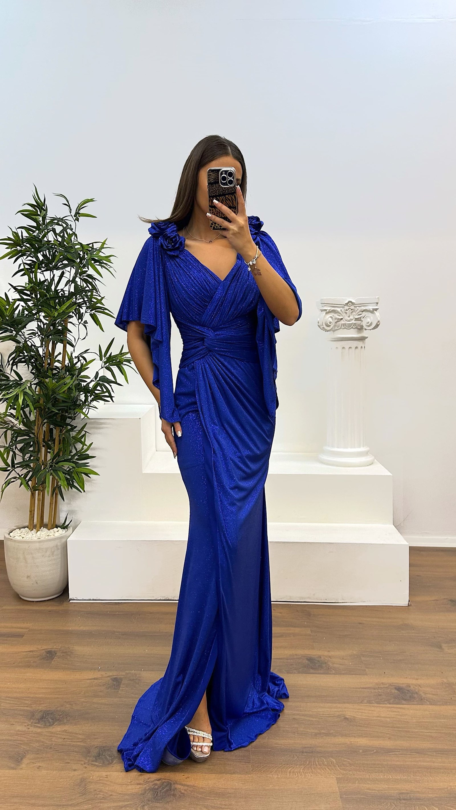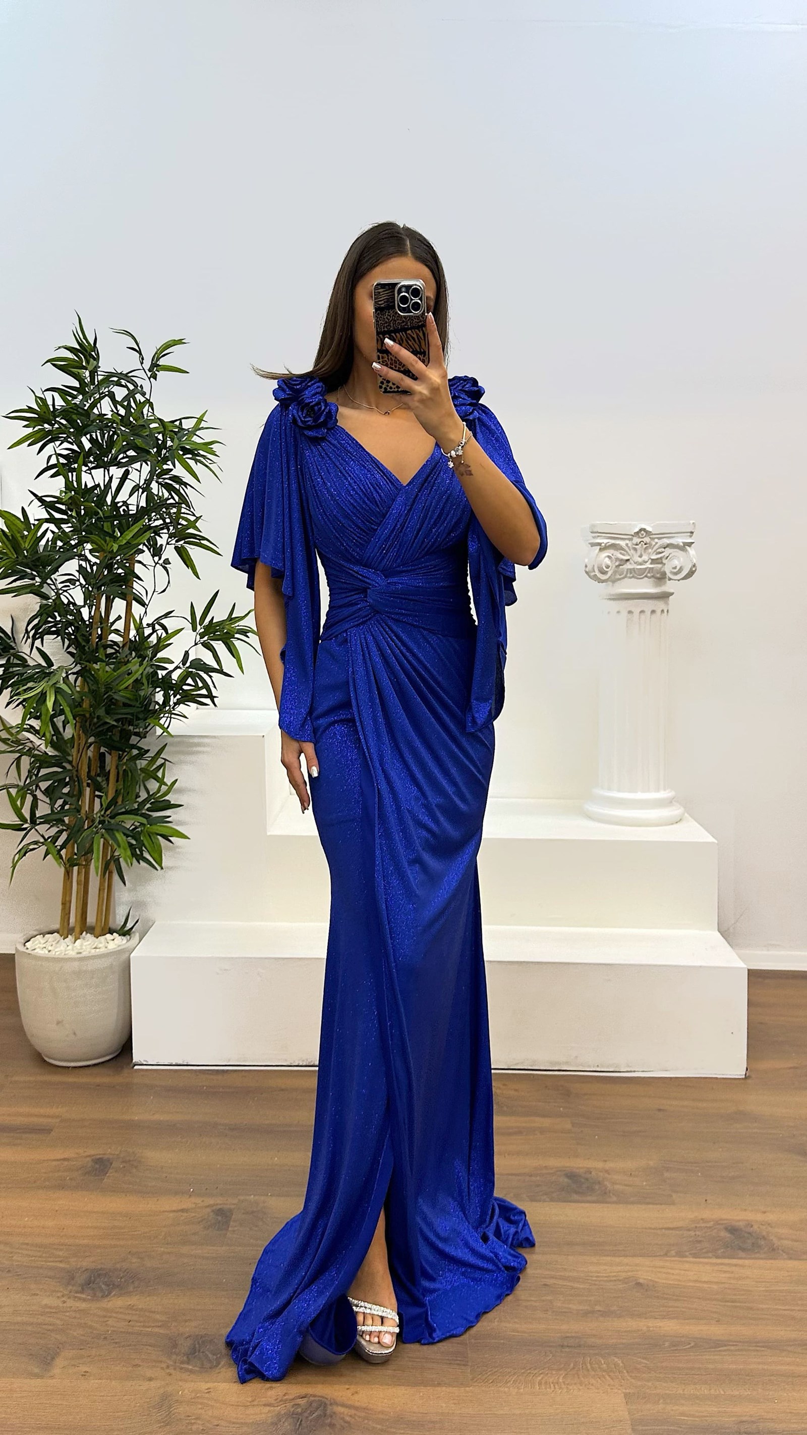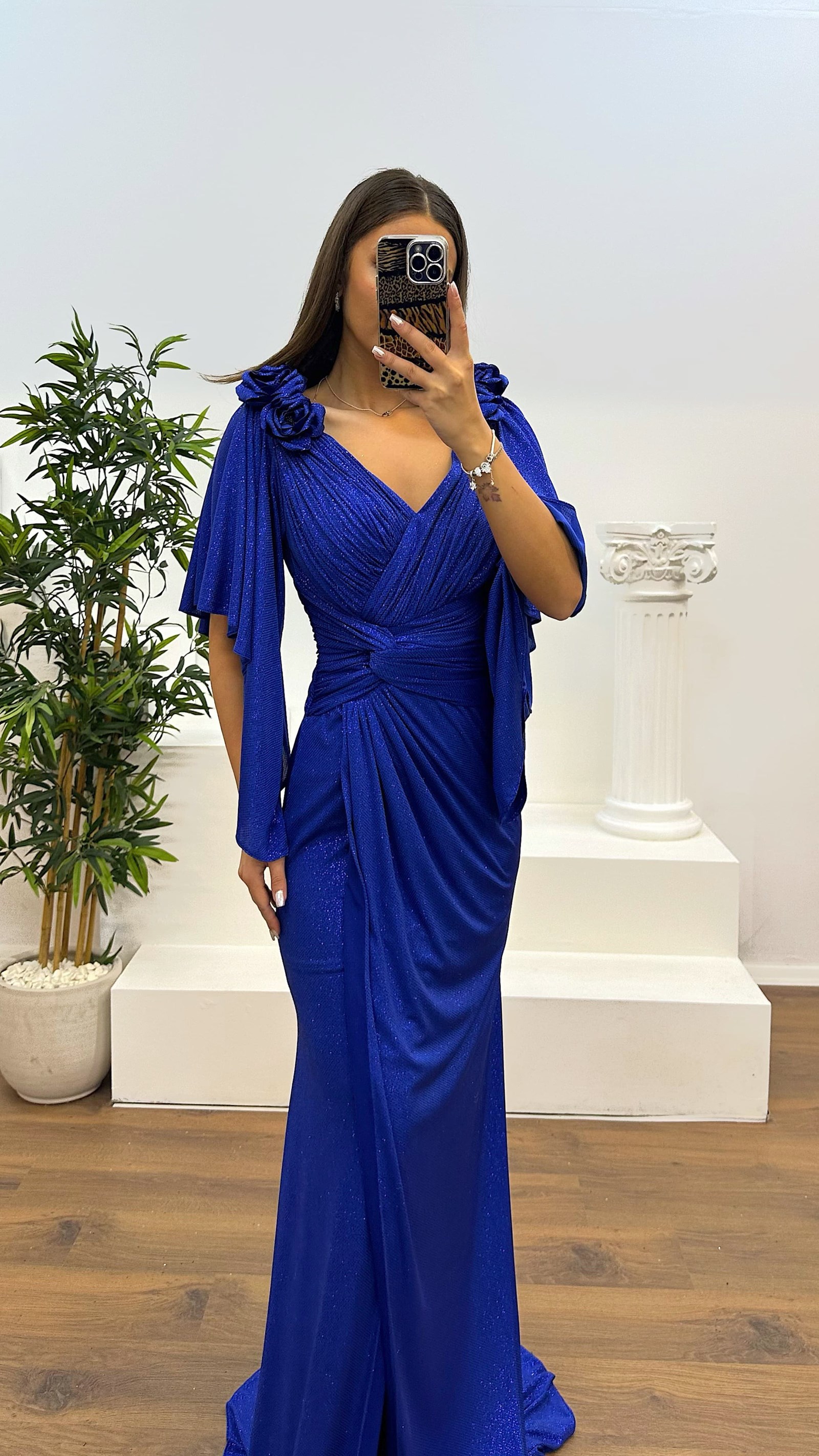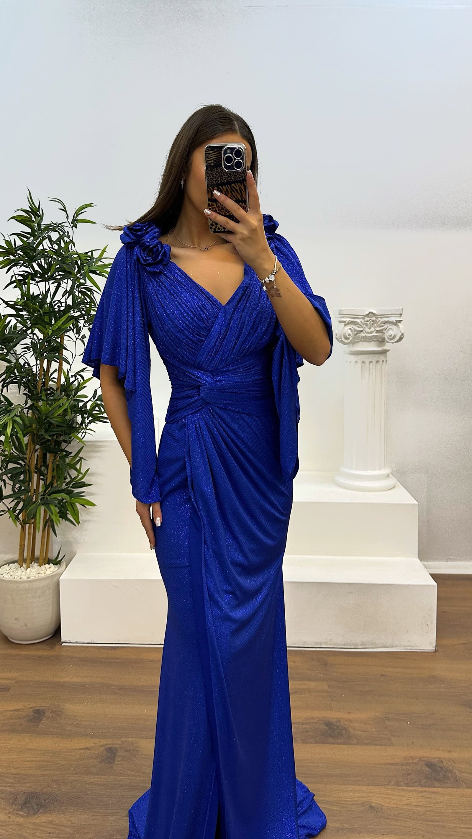 Saks V Yaka Çiçek Detay Simli Abiye Elbise