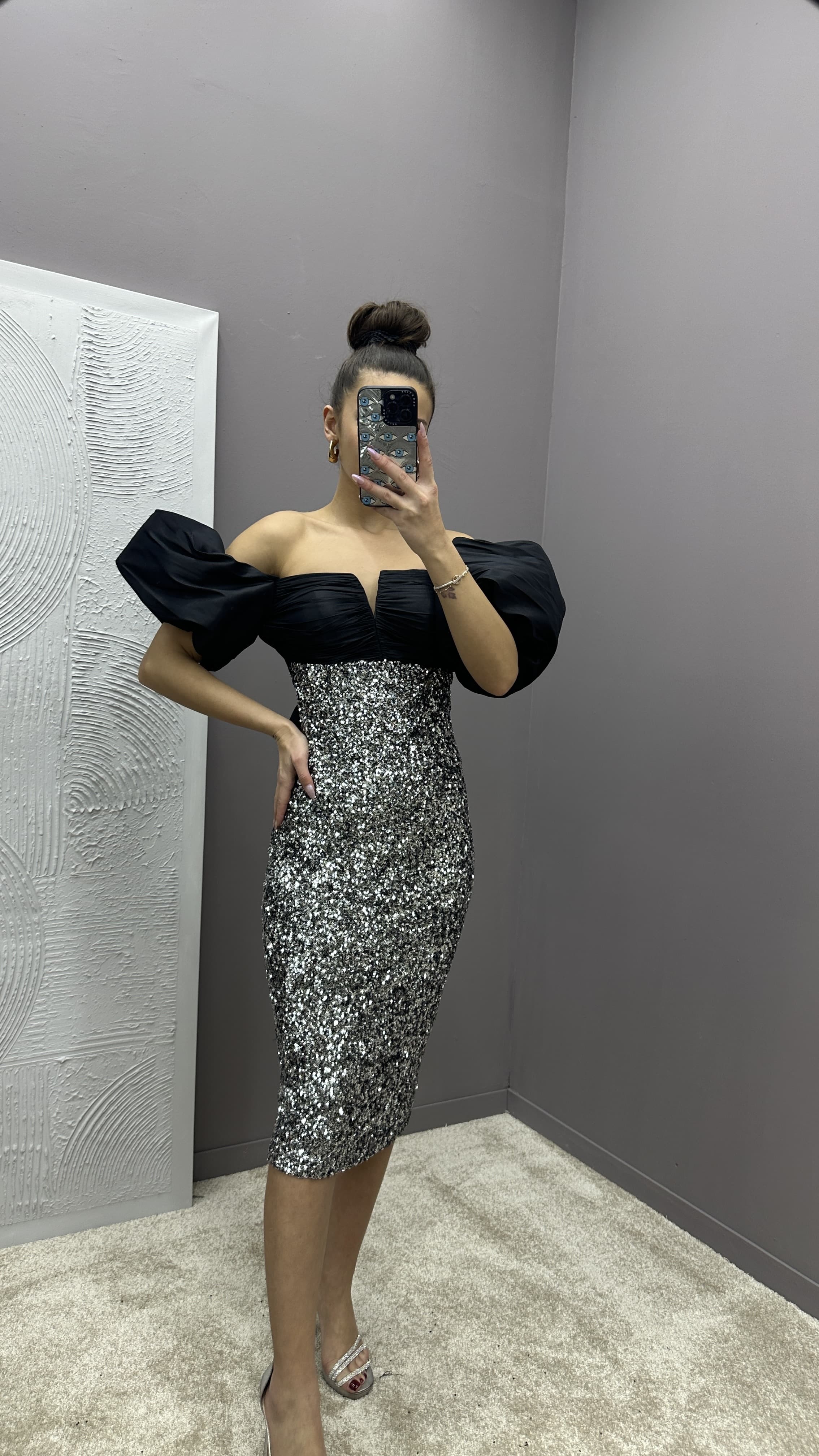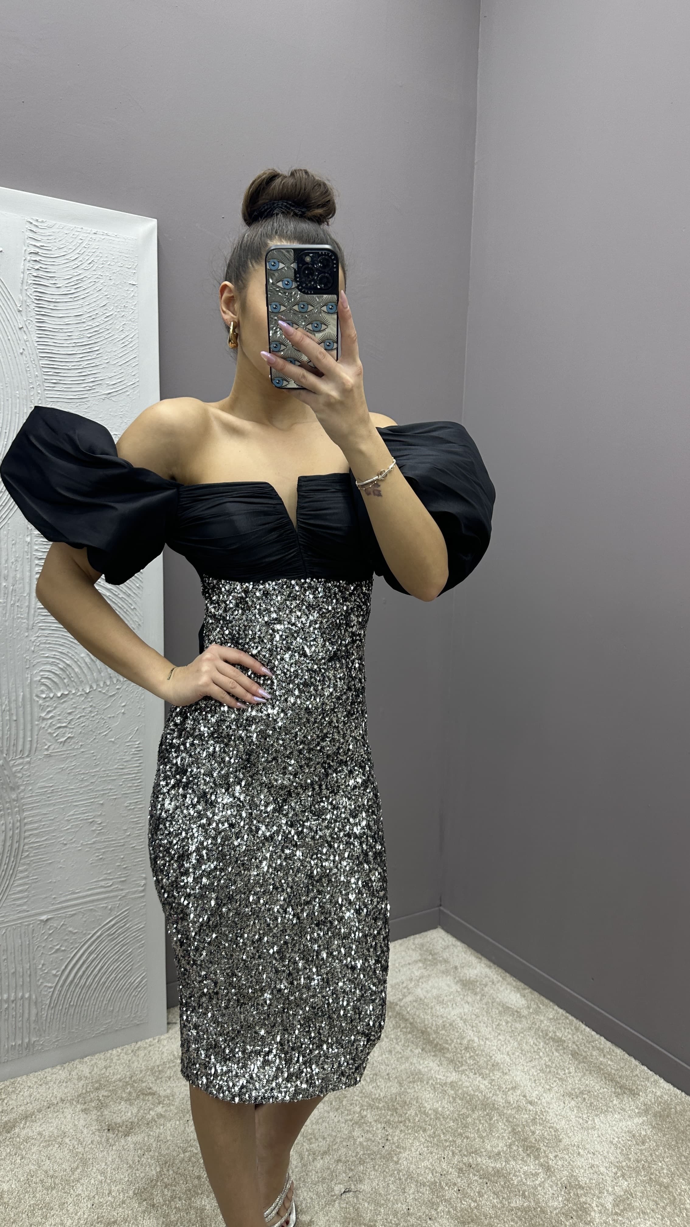 • Siyah Balon Kol Pul Payet Tasarım Elbise