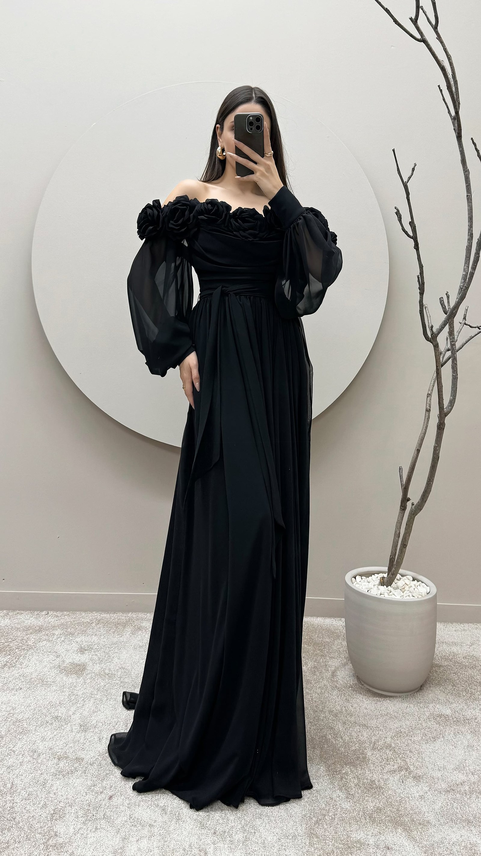 Siyah İp Askılı Yakası Çiçekli Abiye Elbise