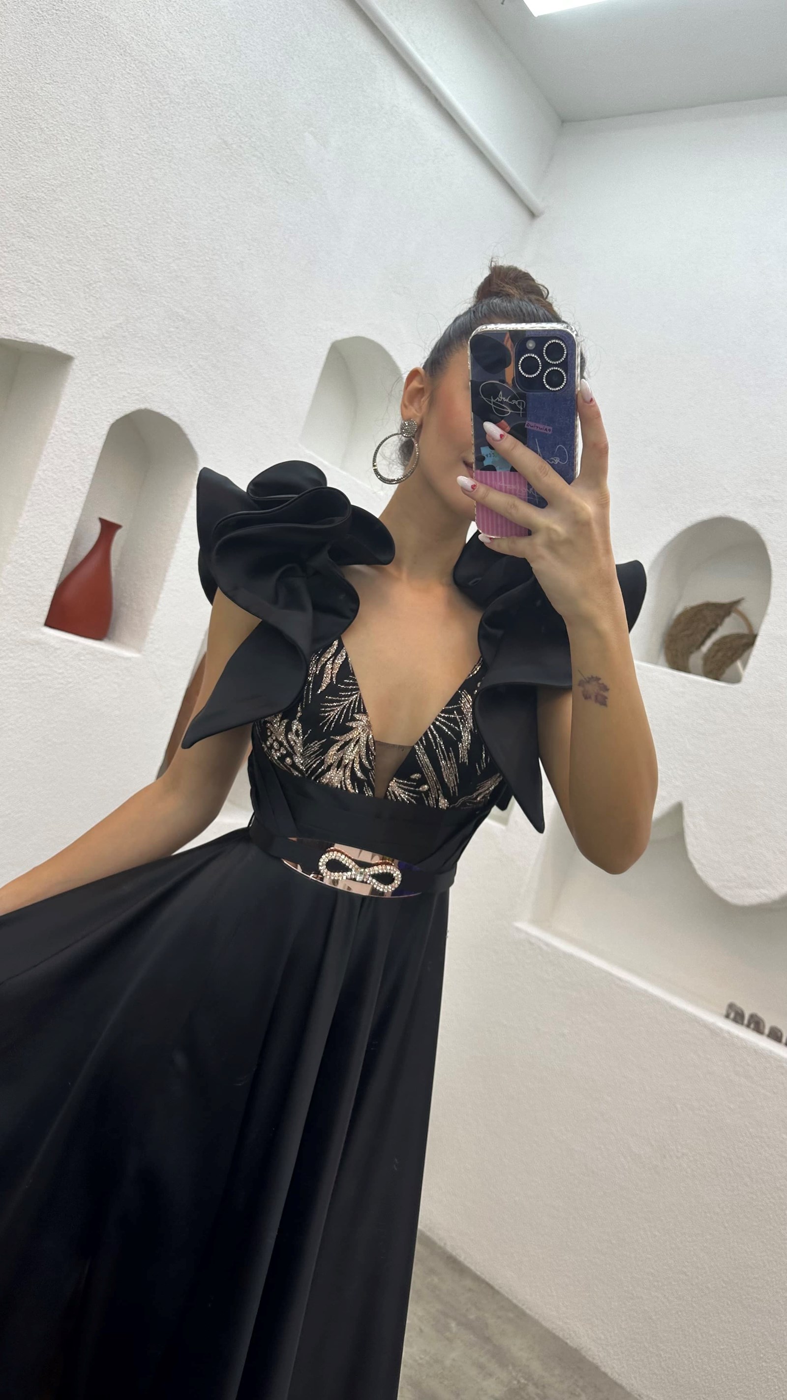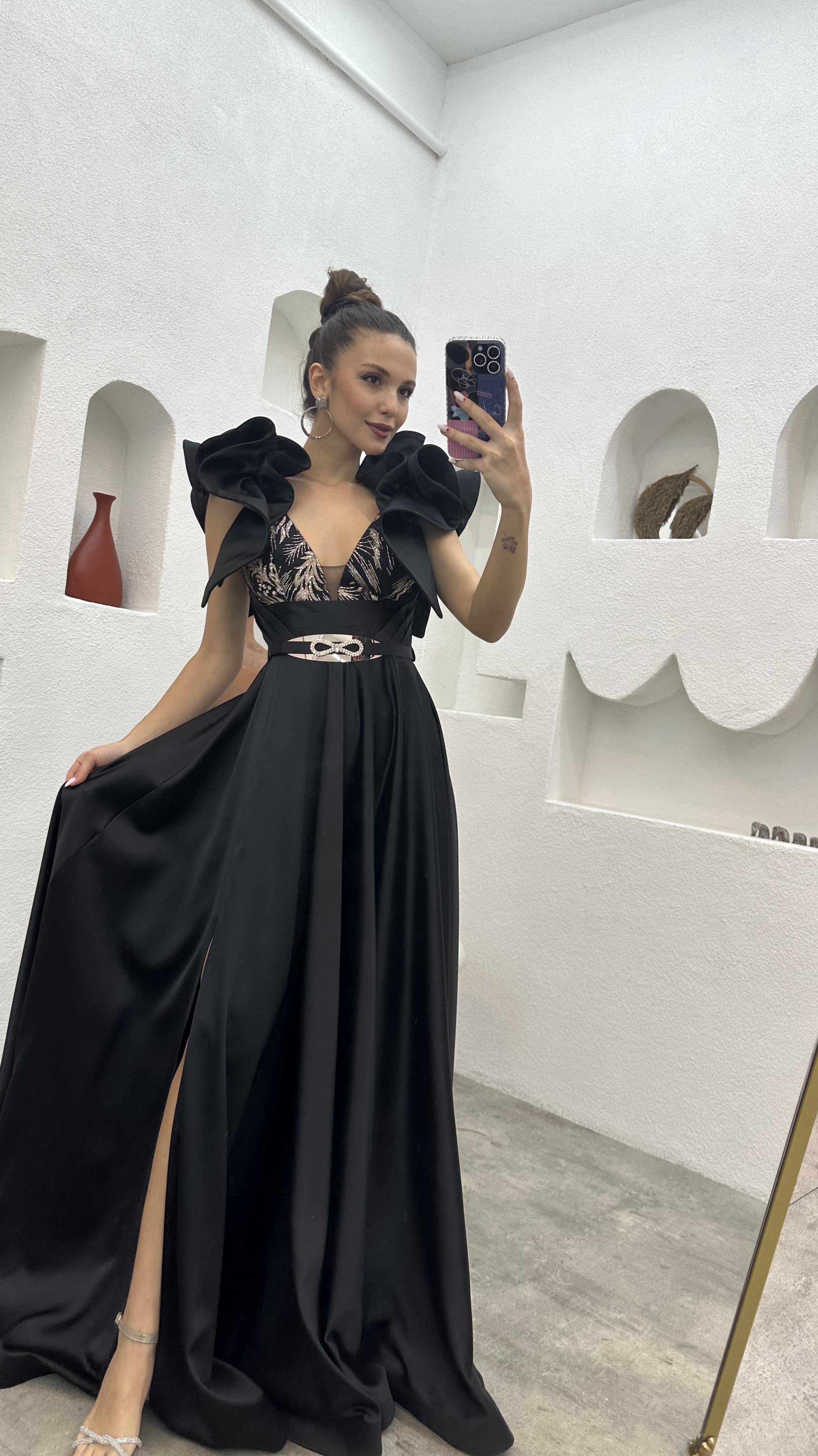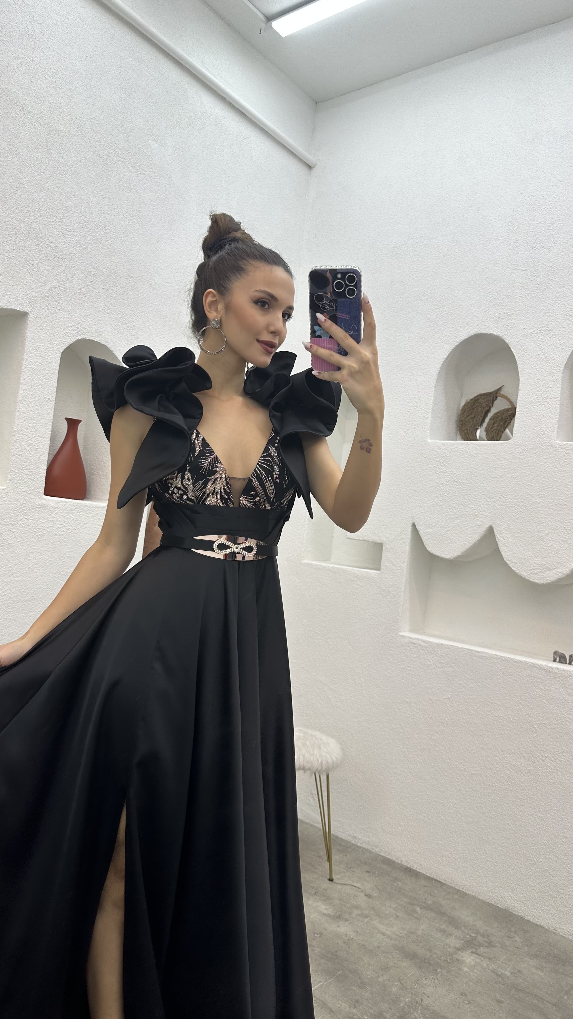 • Siyah Kolları Volanlı Saten Abiye Elbise
