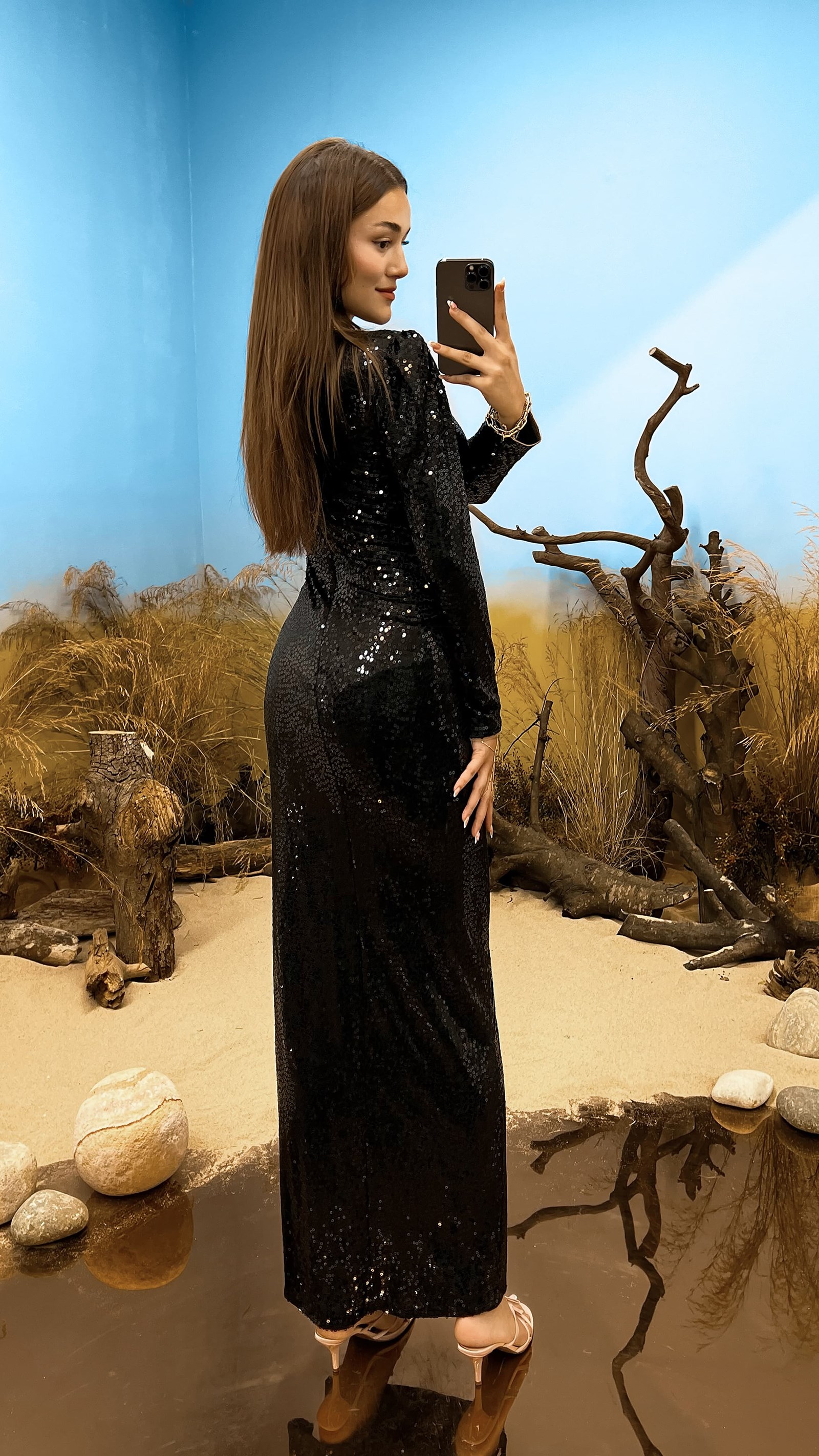 • Siyah Pul Payet Bel Detay Abiye Elbise