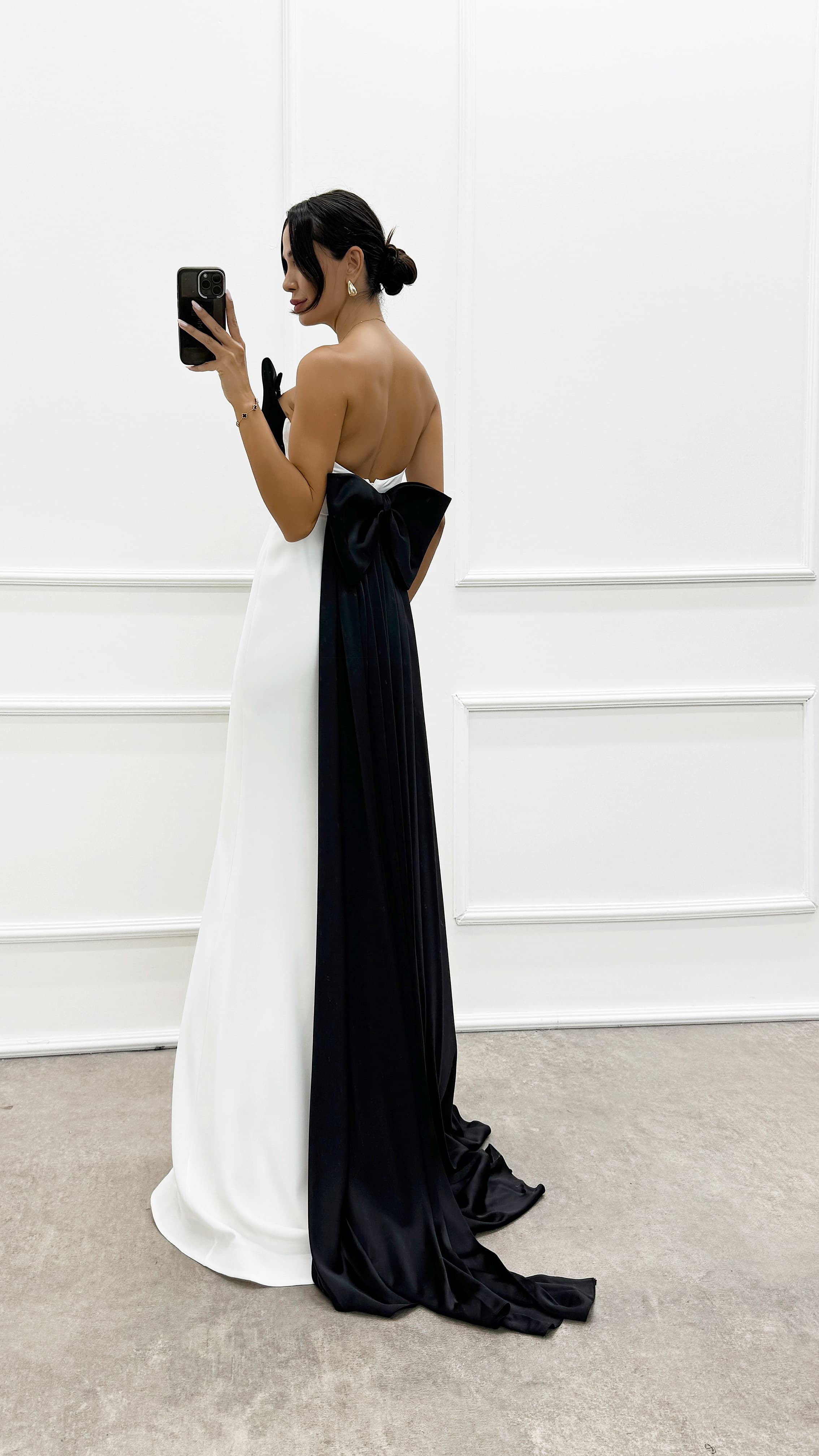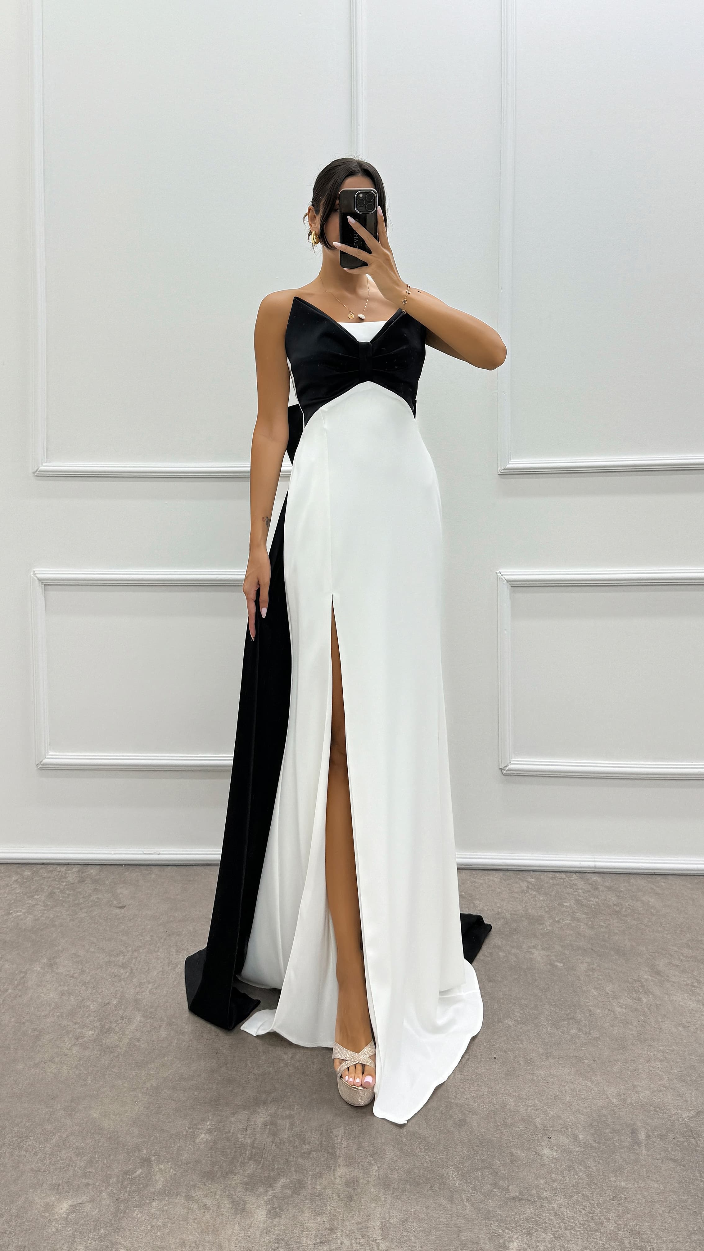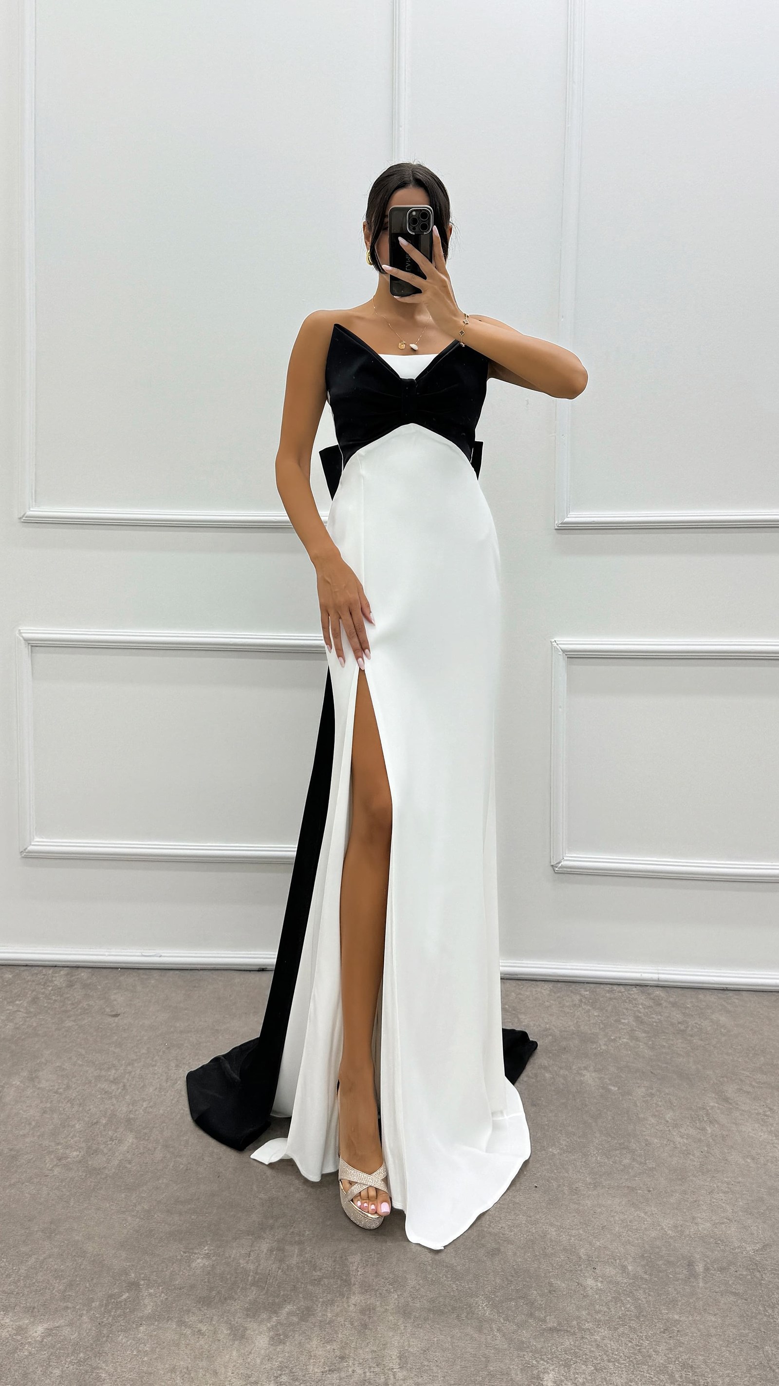 • Beyaz Straplez Göğsü Fiyonk Tasarım Elbise
