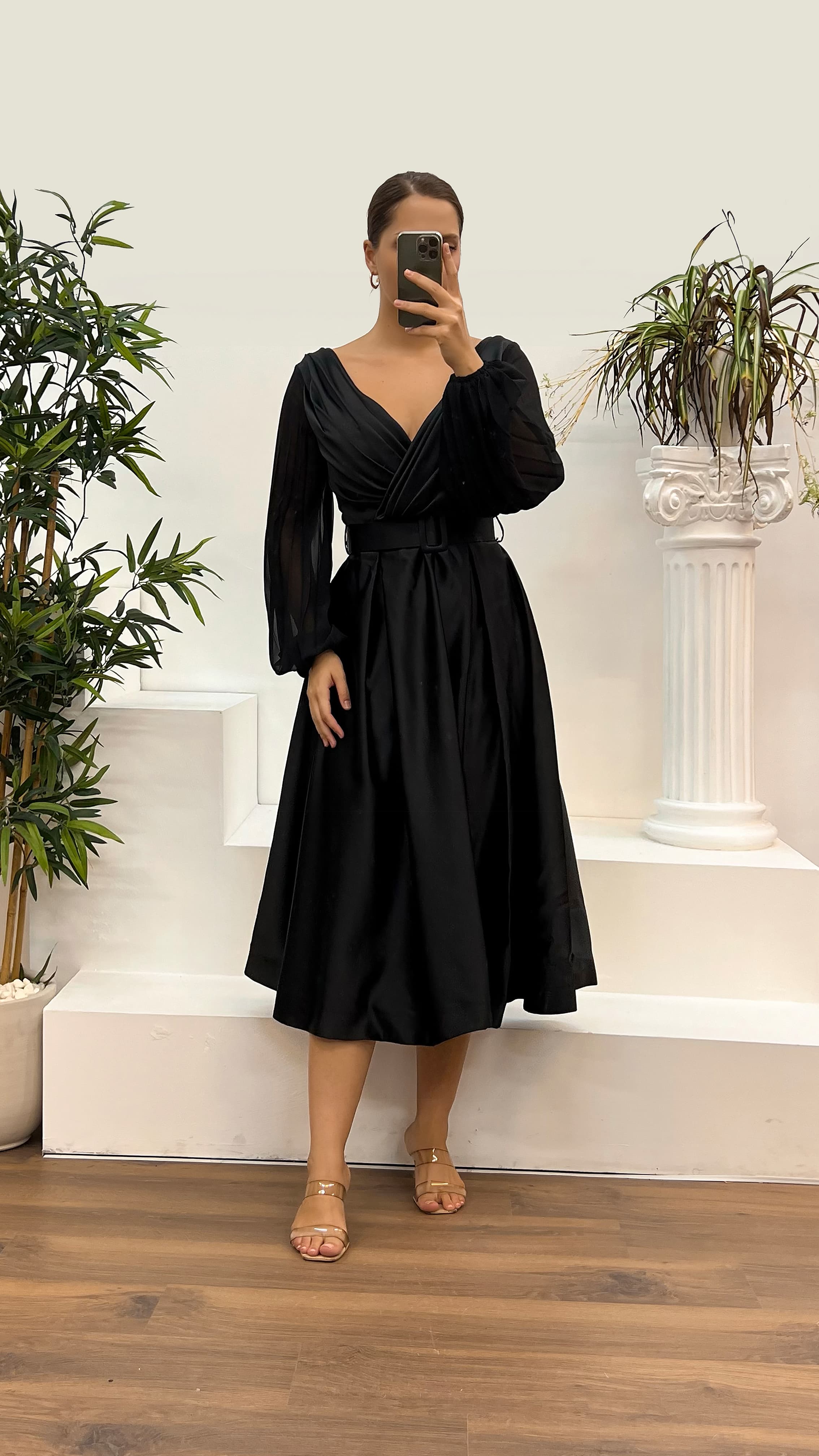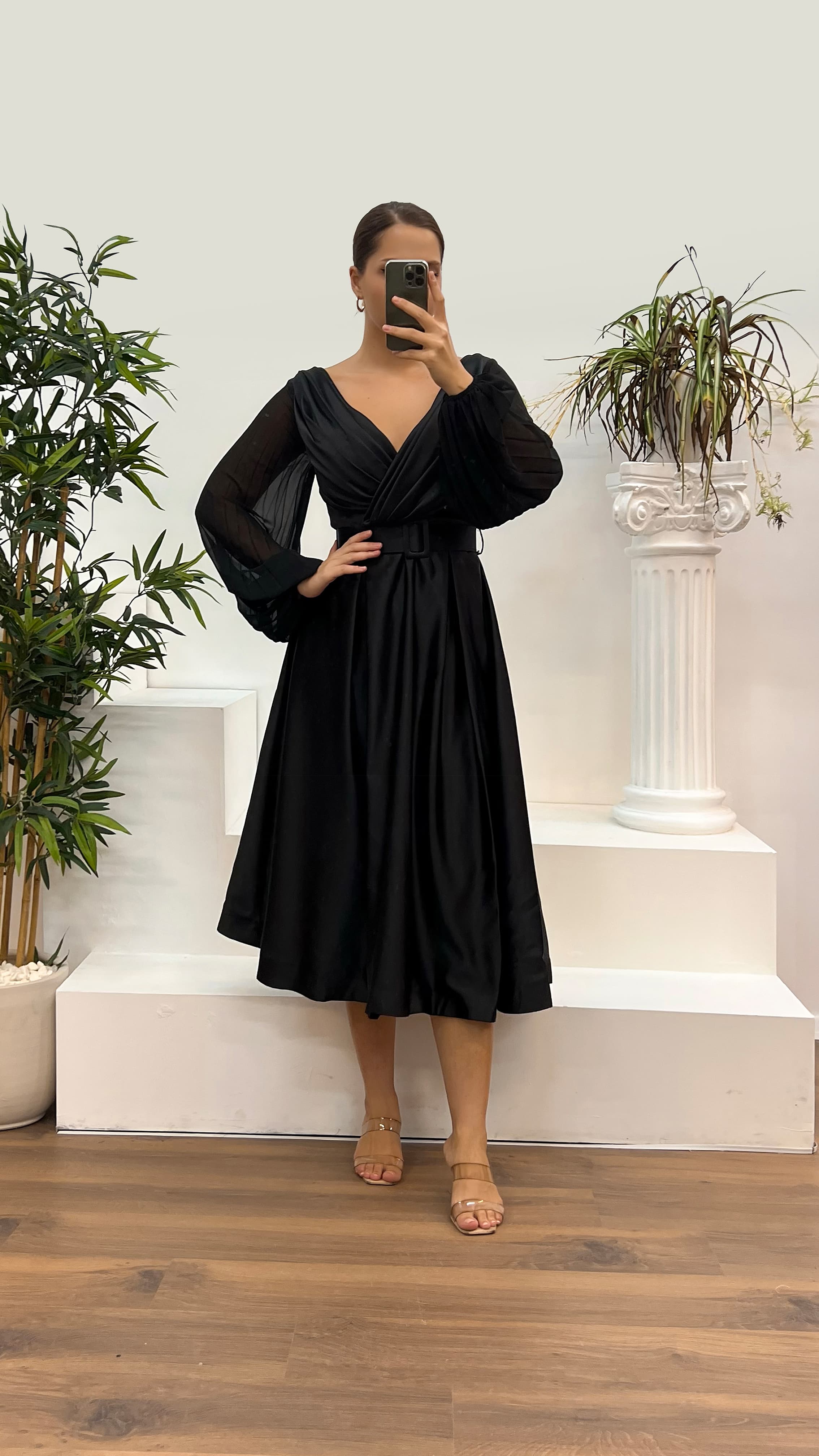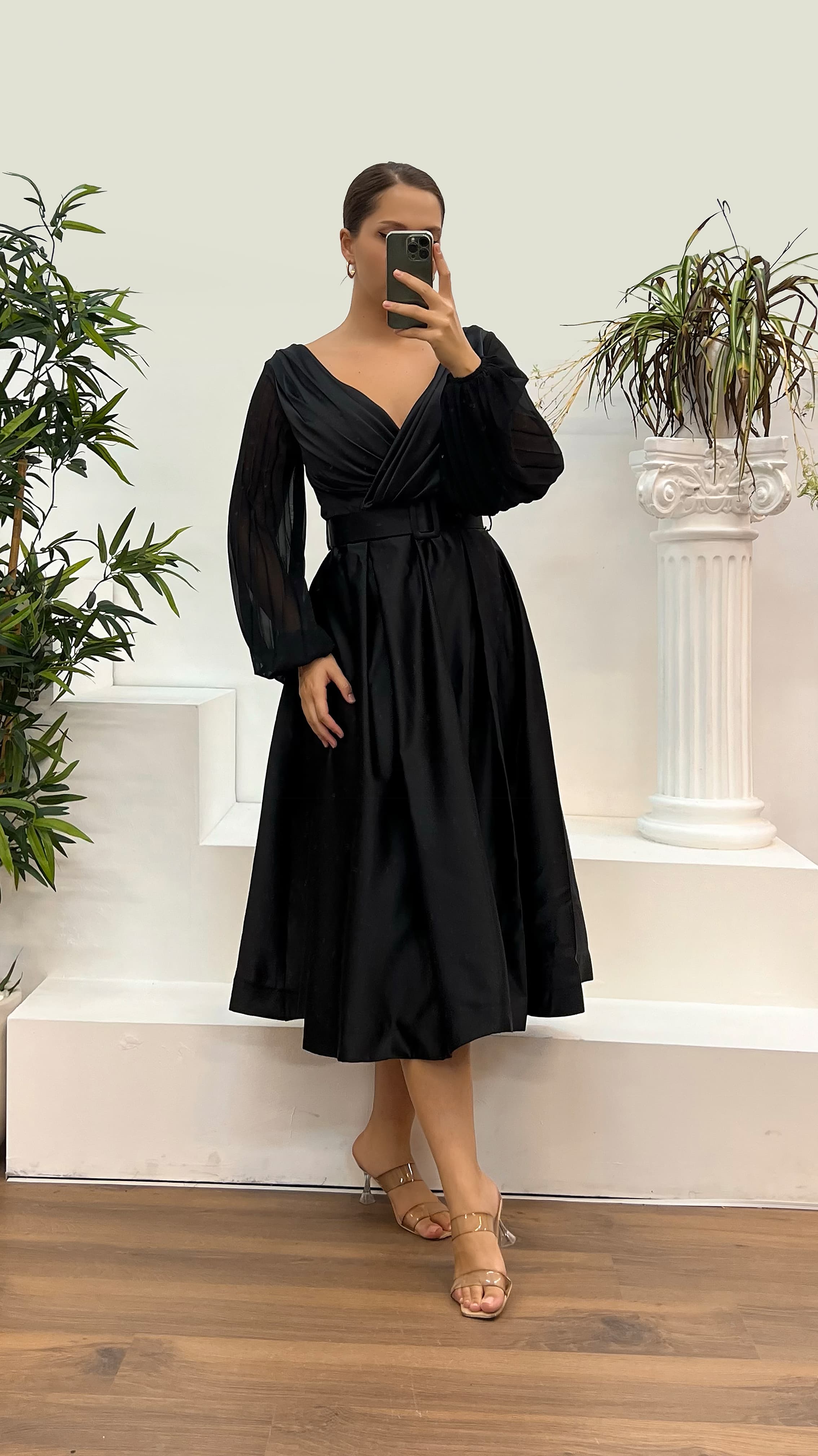 • Siyah V Yaka Saten Büyük Beden Abiye Elbise