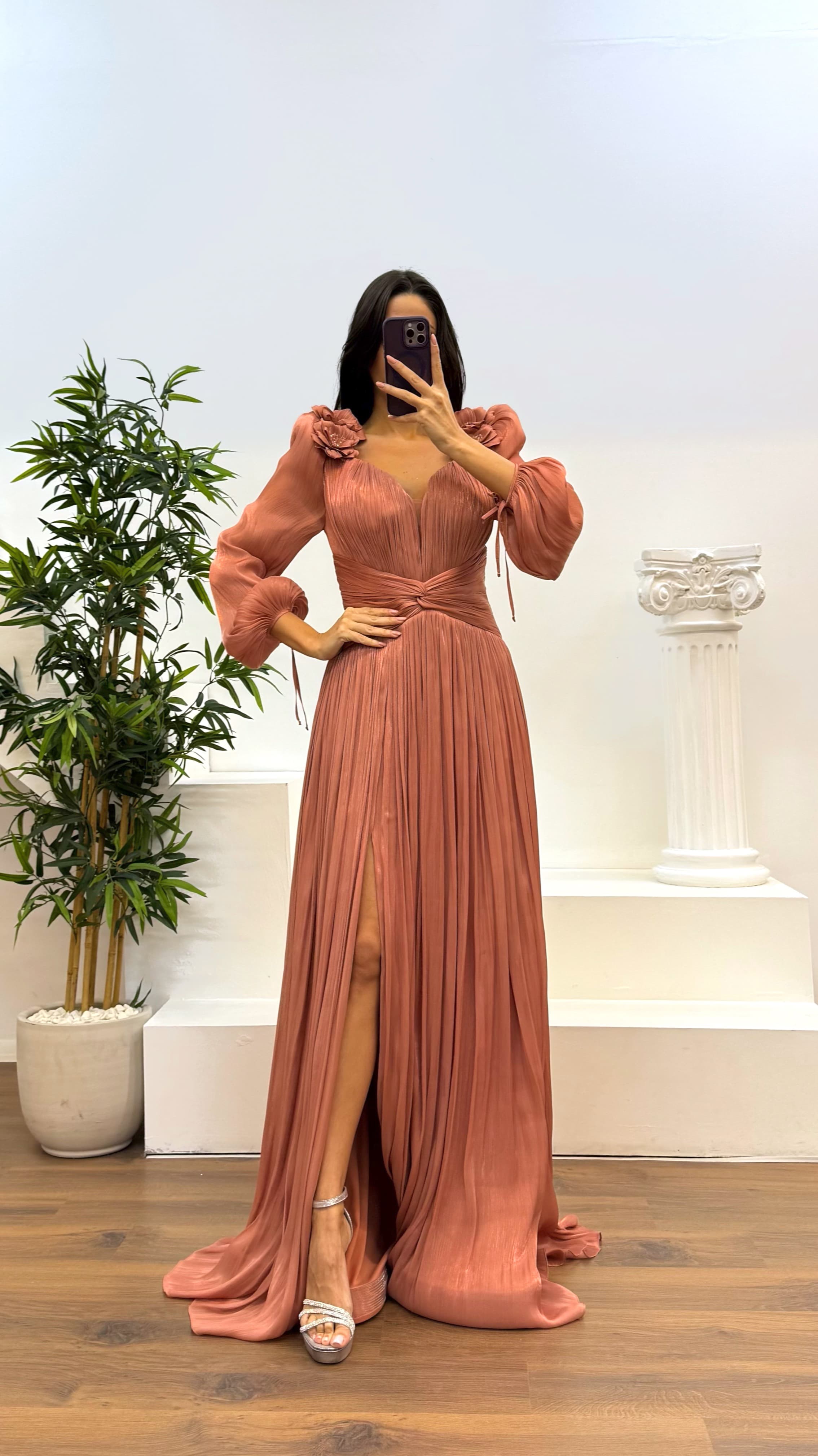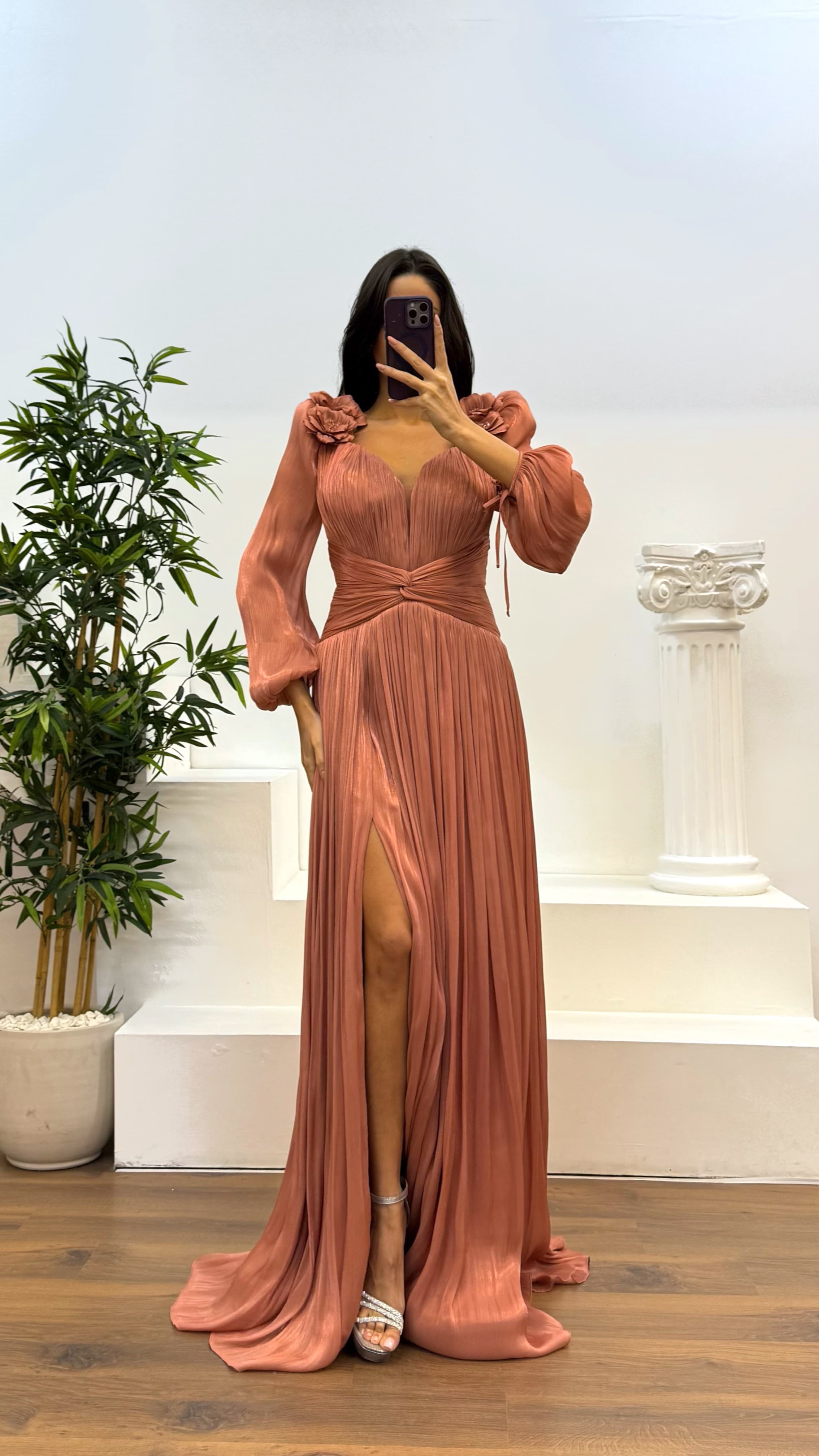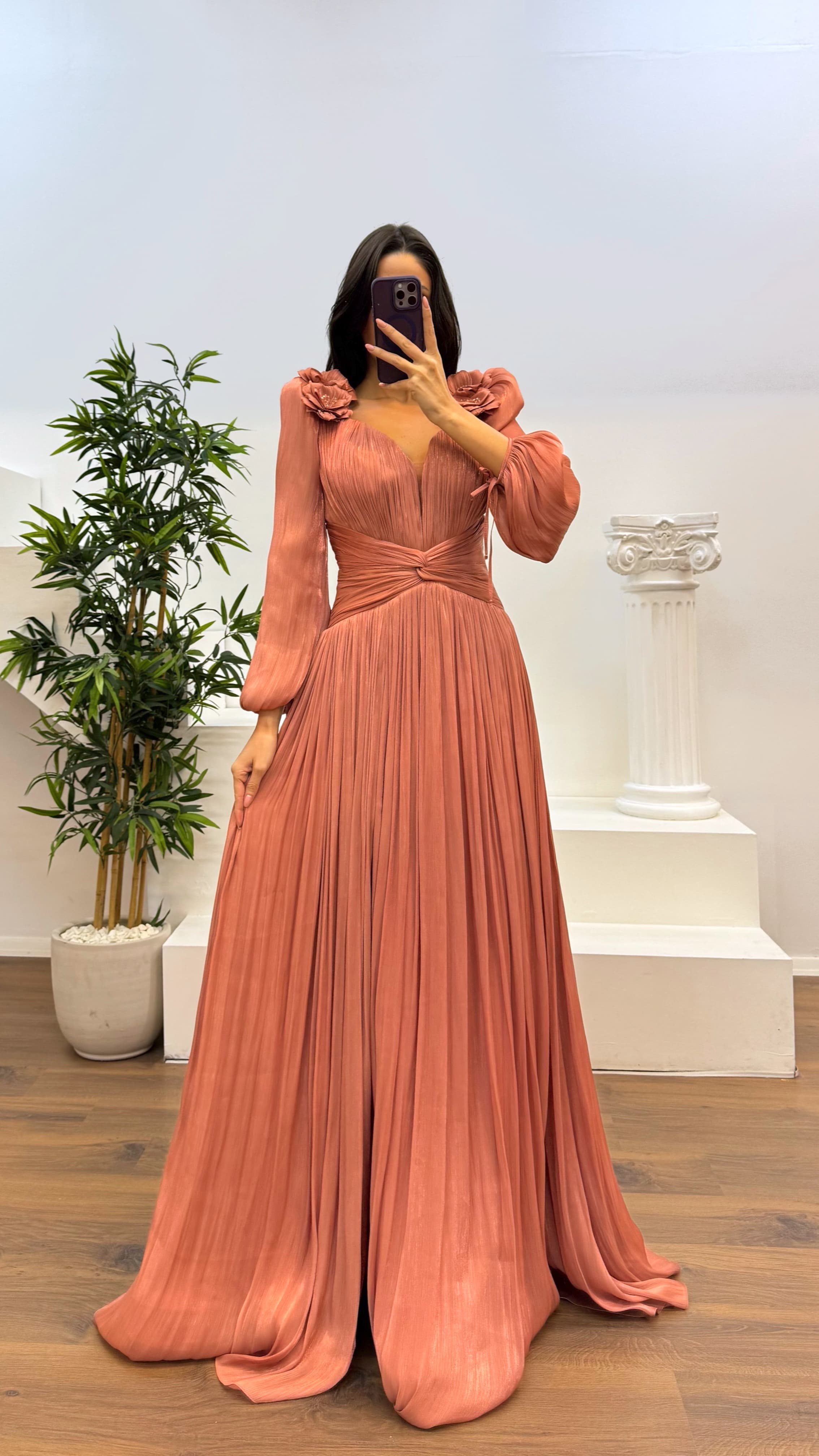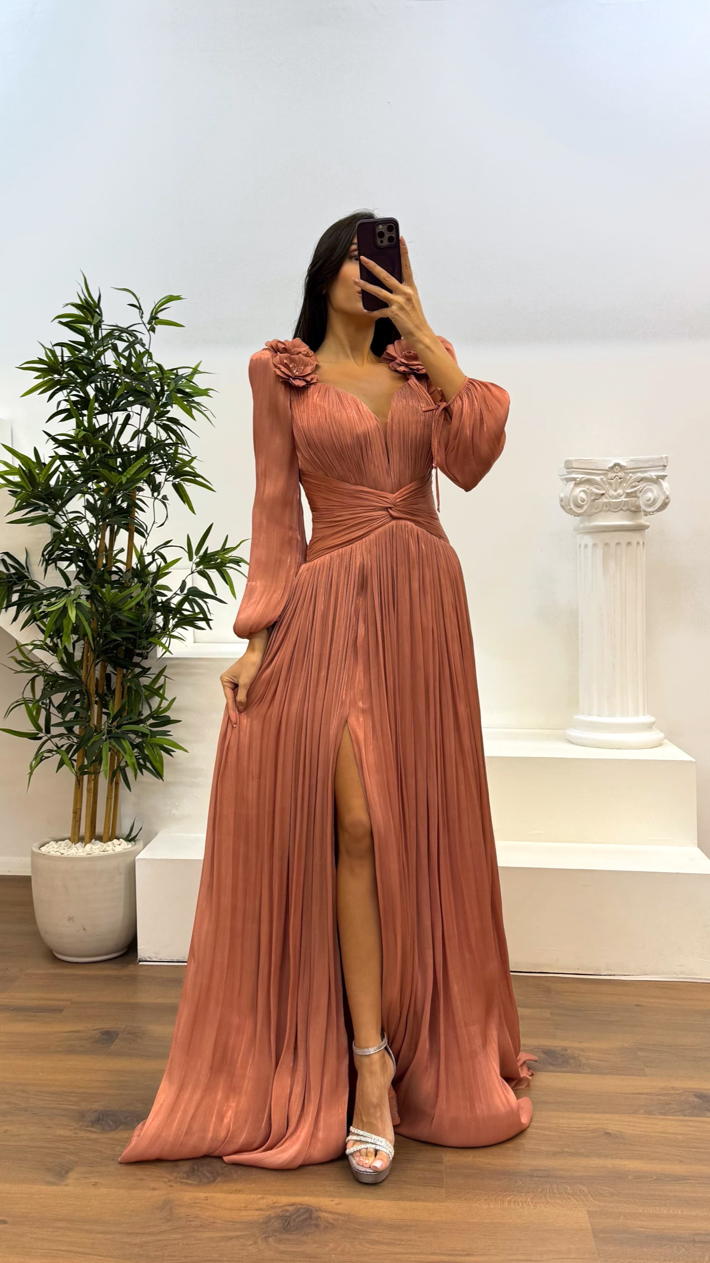 Vestido de noche plisado con detalle floral Accesorio desmontable con almohadilla en el pecho, forrado, cierre con cremallera en la espalda, abertura, adecuado para tallas 36-42. Longitud del producto: Puede variar entre 165-170 cm. Longitud del brazo del producto: 60 cm. Tipo de tejido: gasa 66% viscosa 34% poliéster
