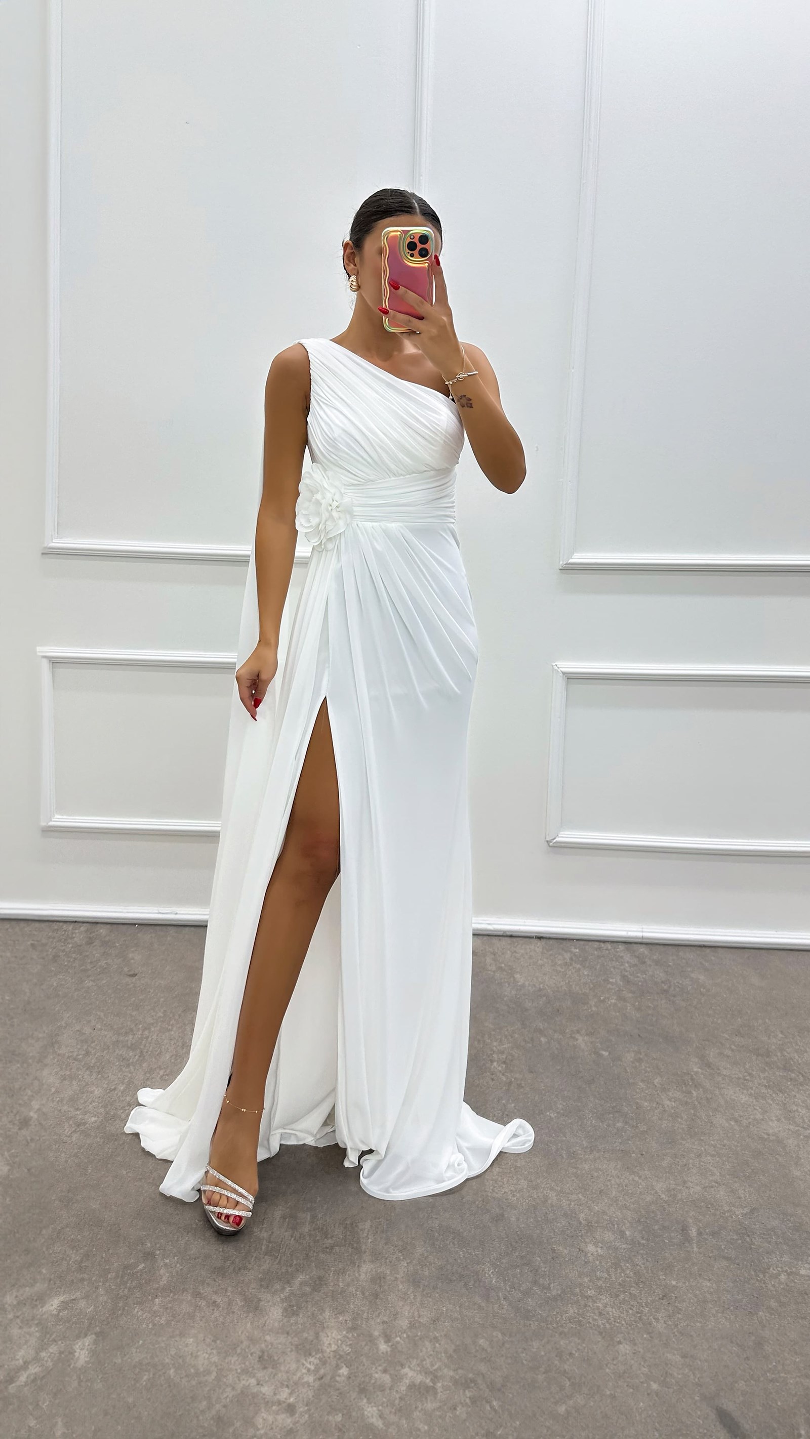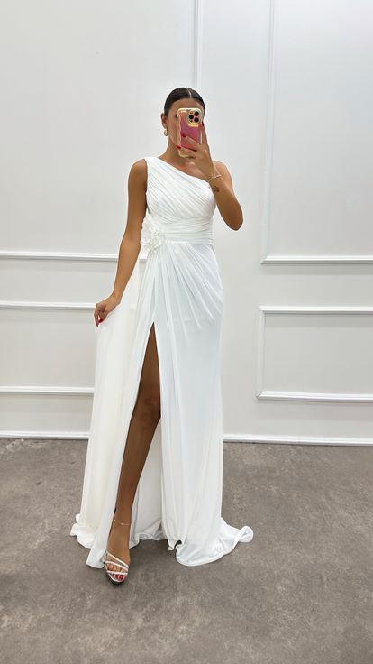 • Zümrüt Yeşili Tek Omuz Kol Detay Abiye Elbise