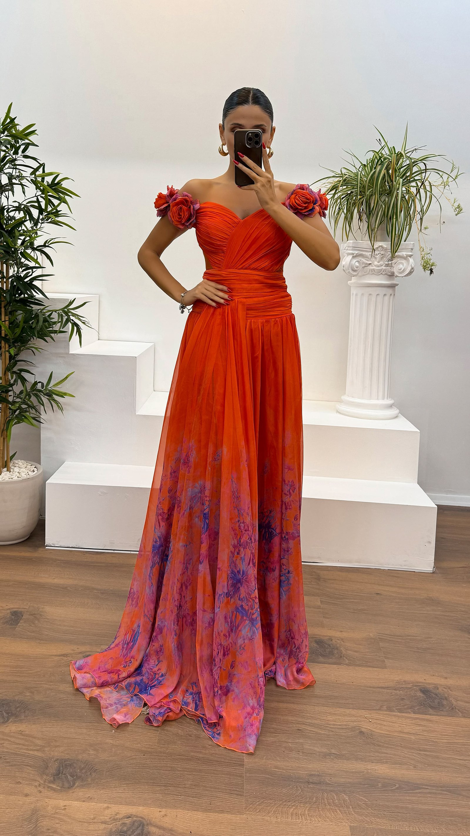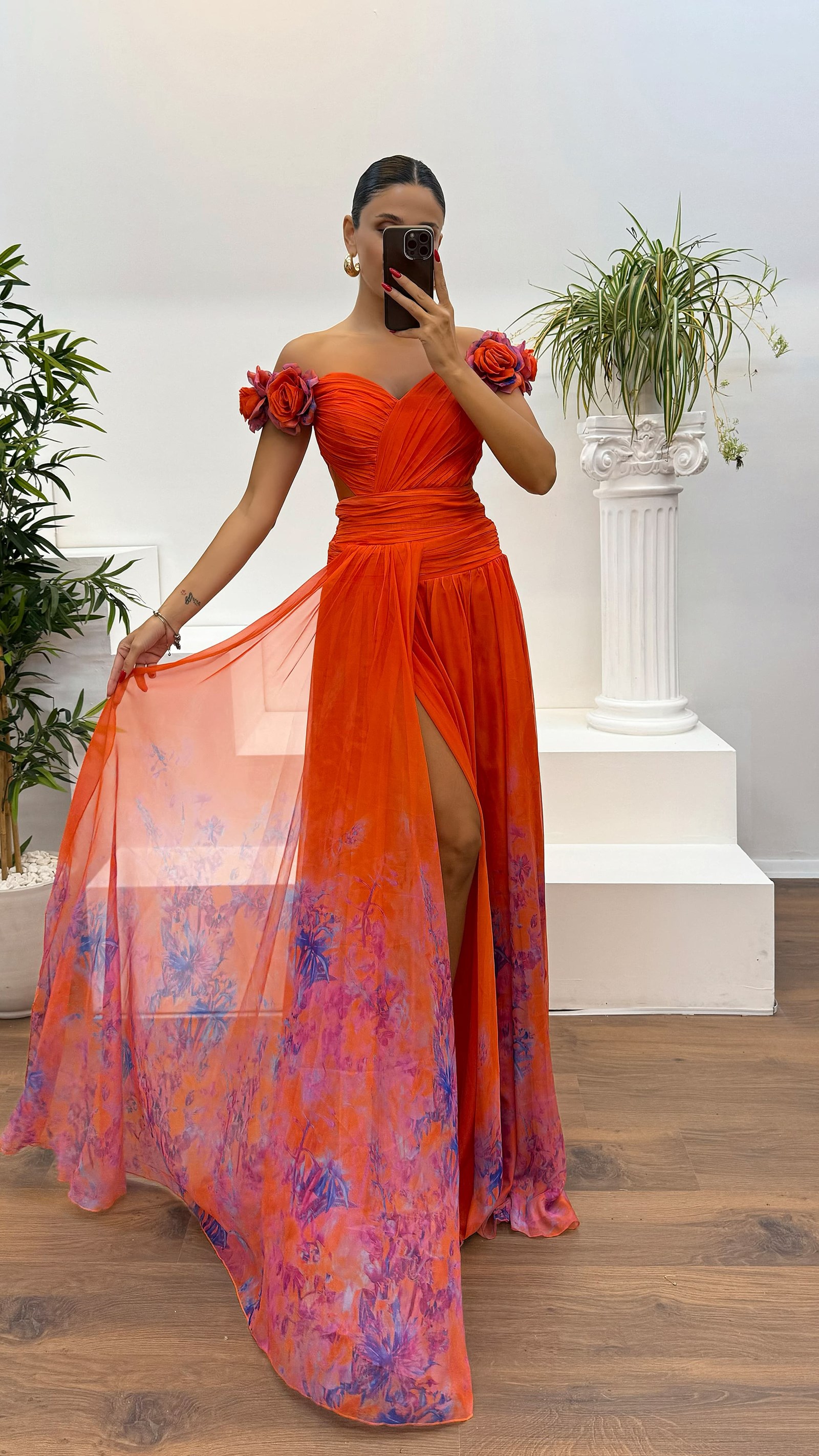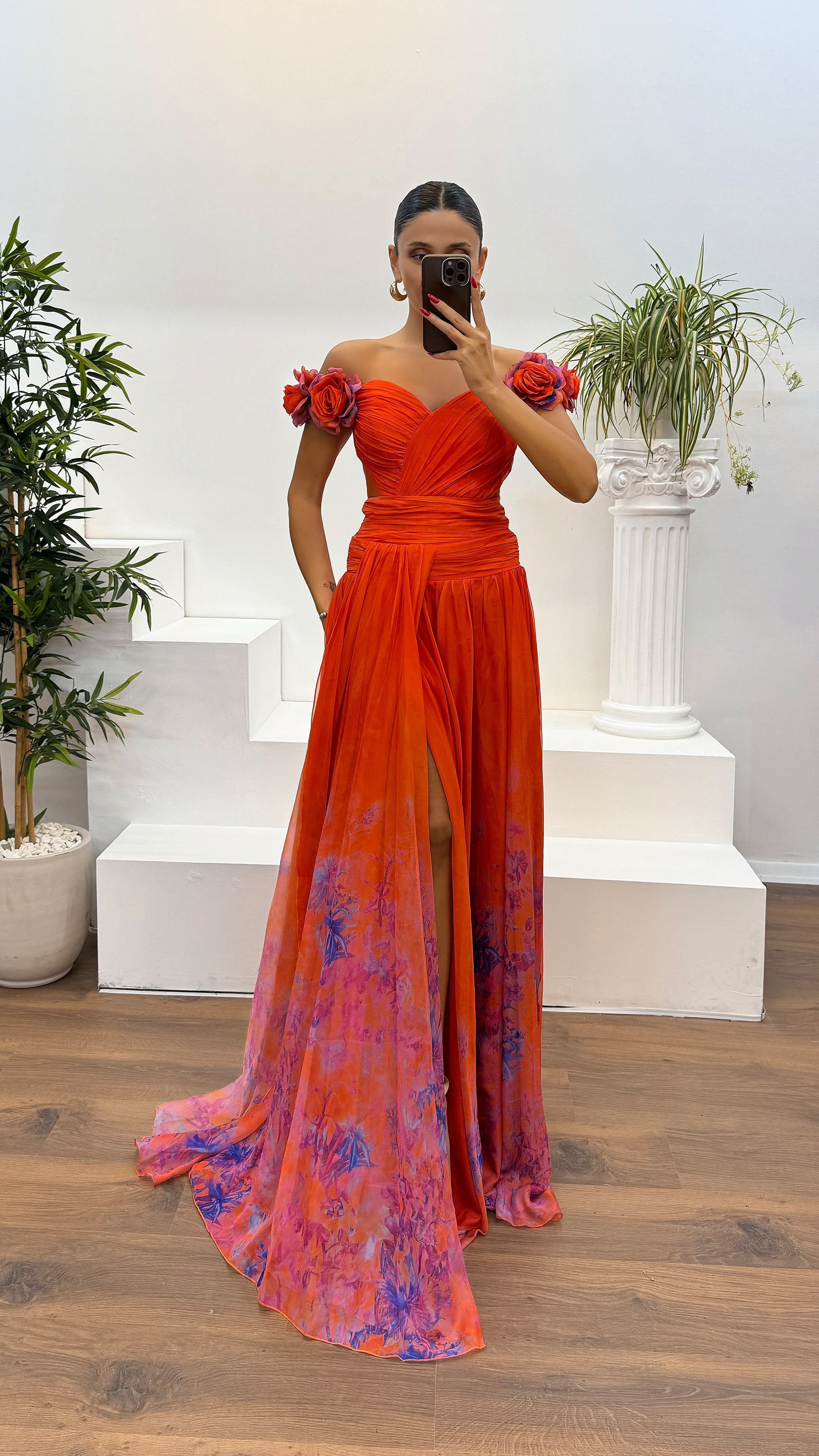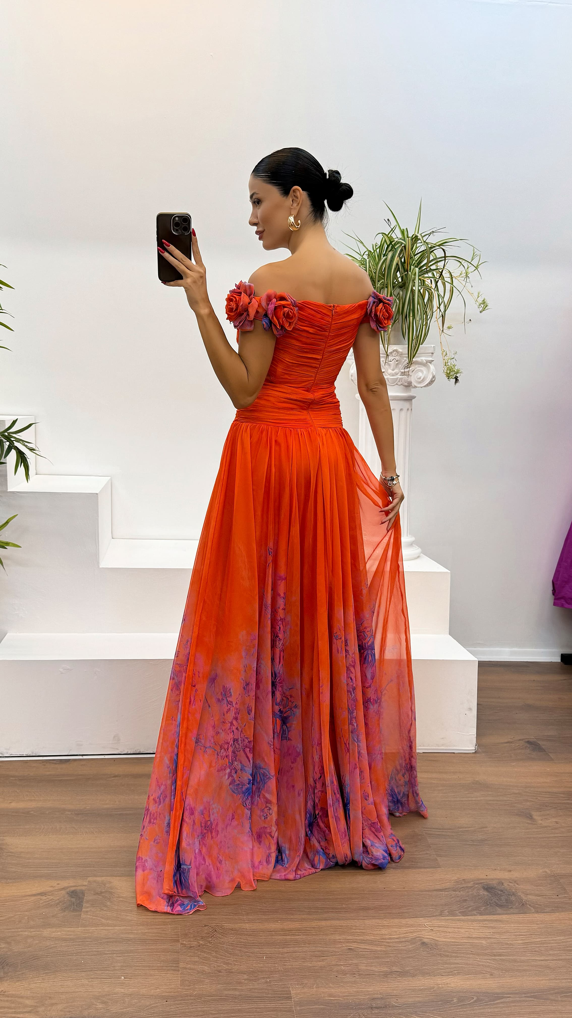 Turuncu Bel Detay Desenli Şifon Abiye Elbise