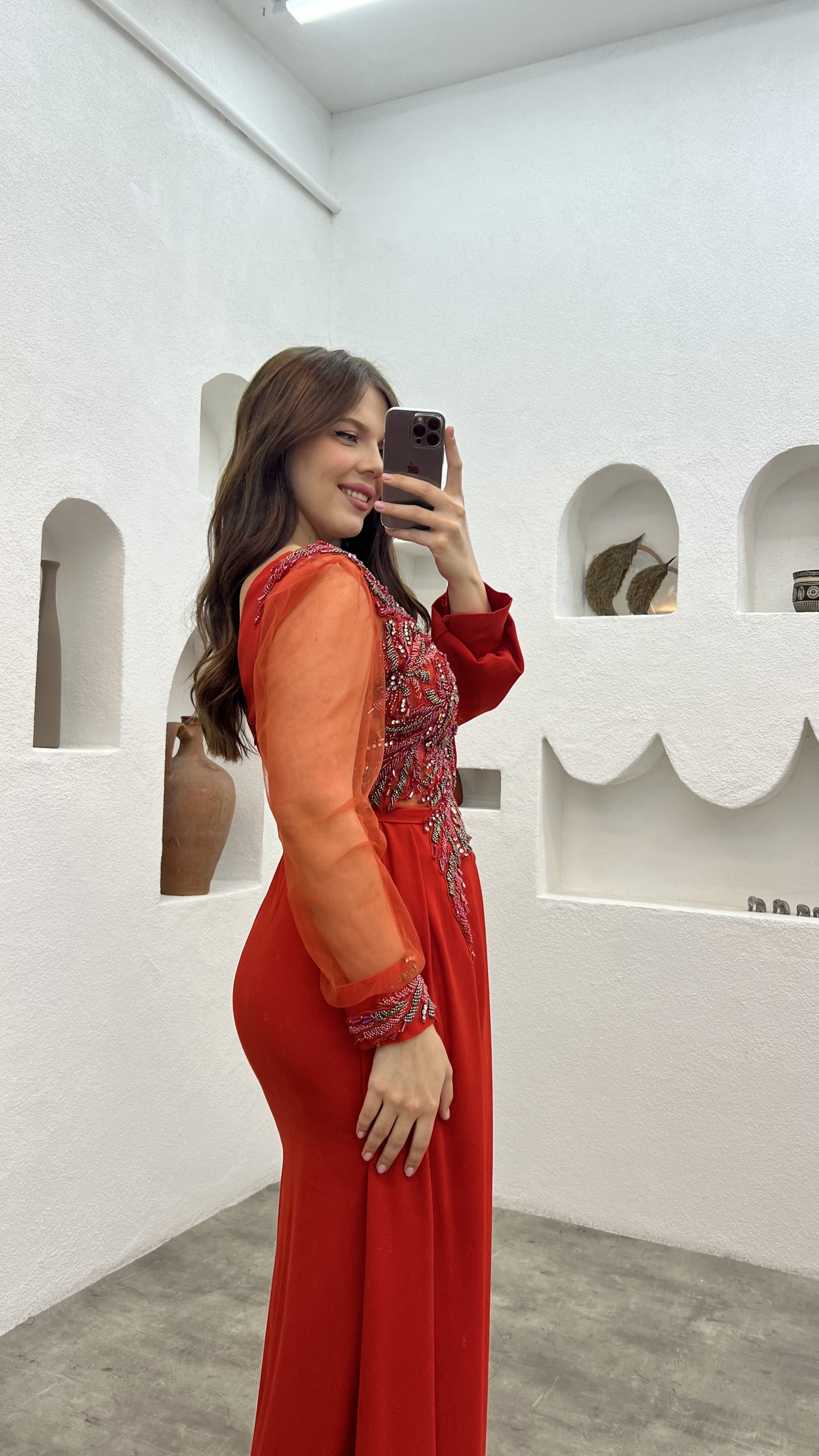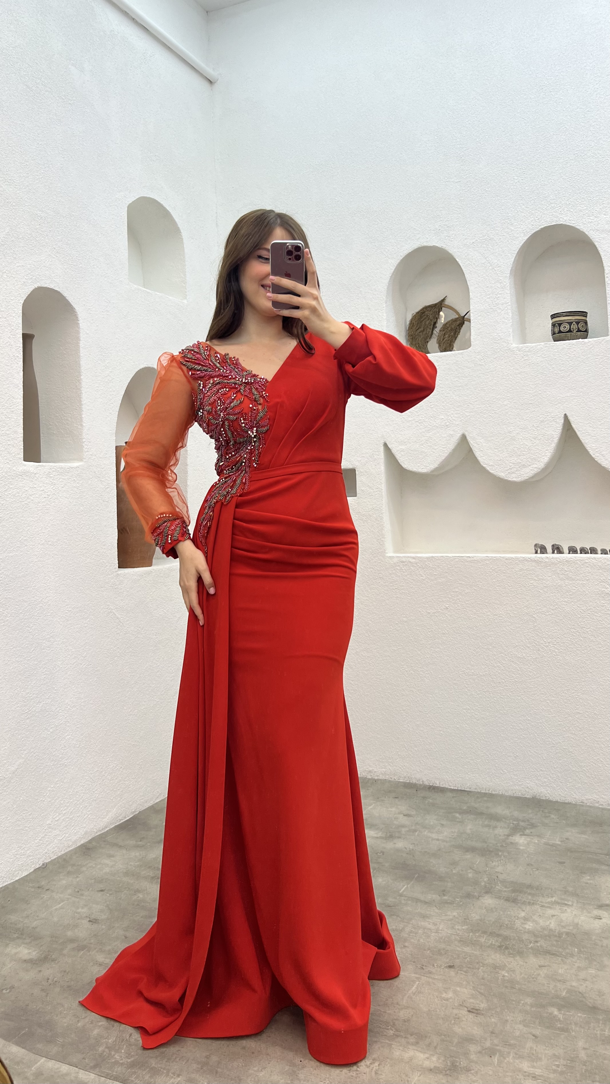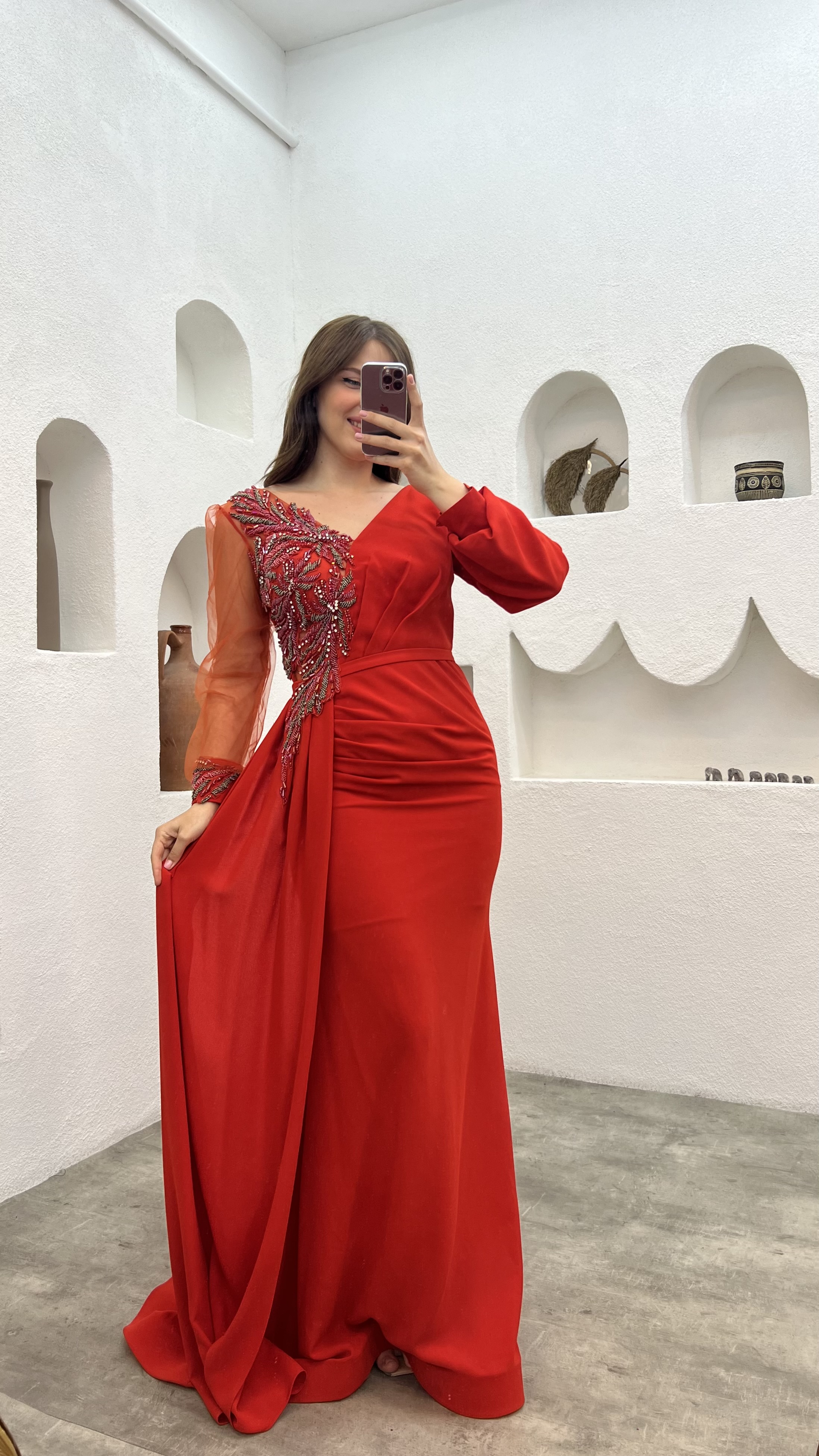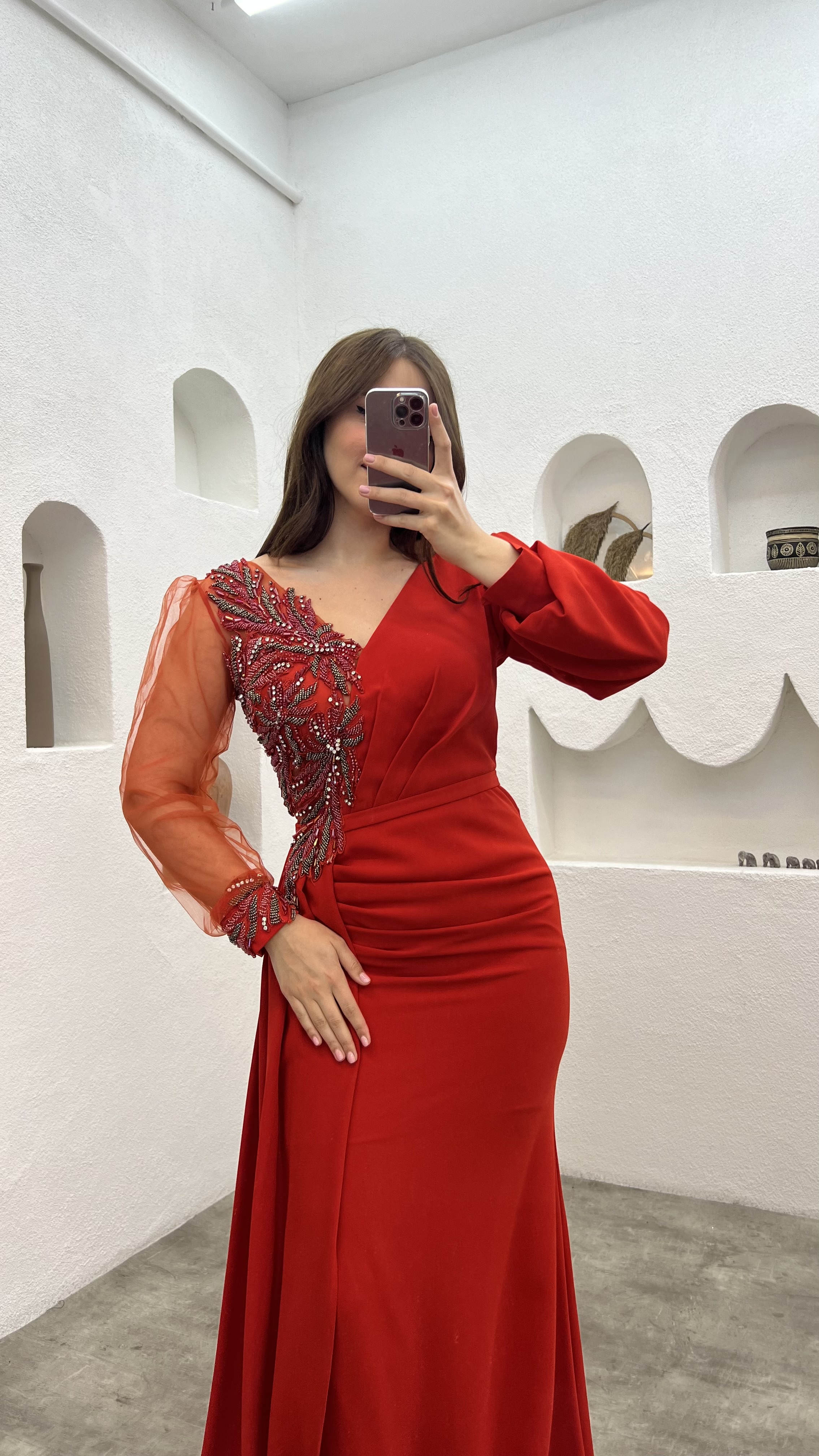 • Turuncu Tek Kolu Tül Yırtmaçlı Büyük Beden Abiye Elbise