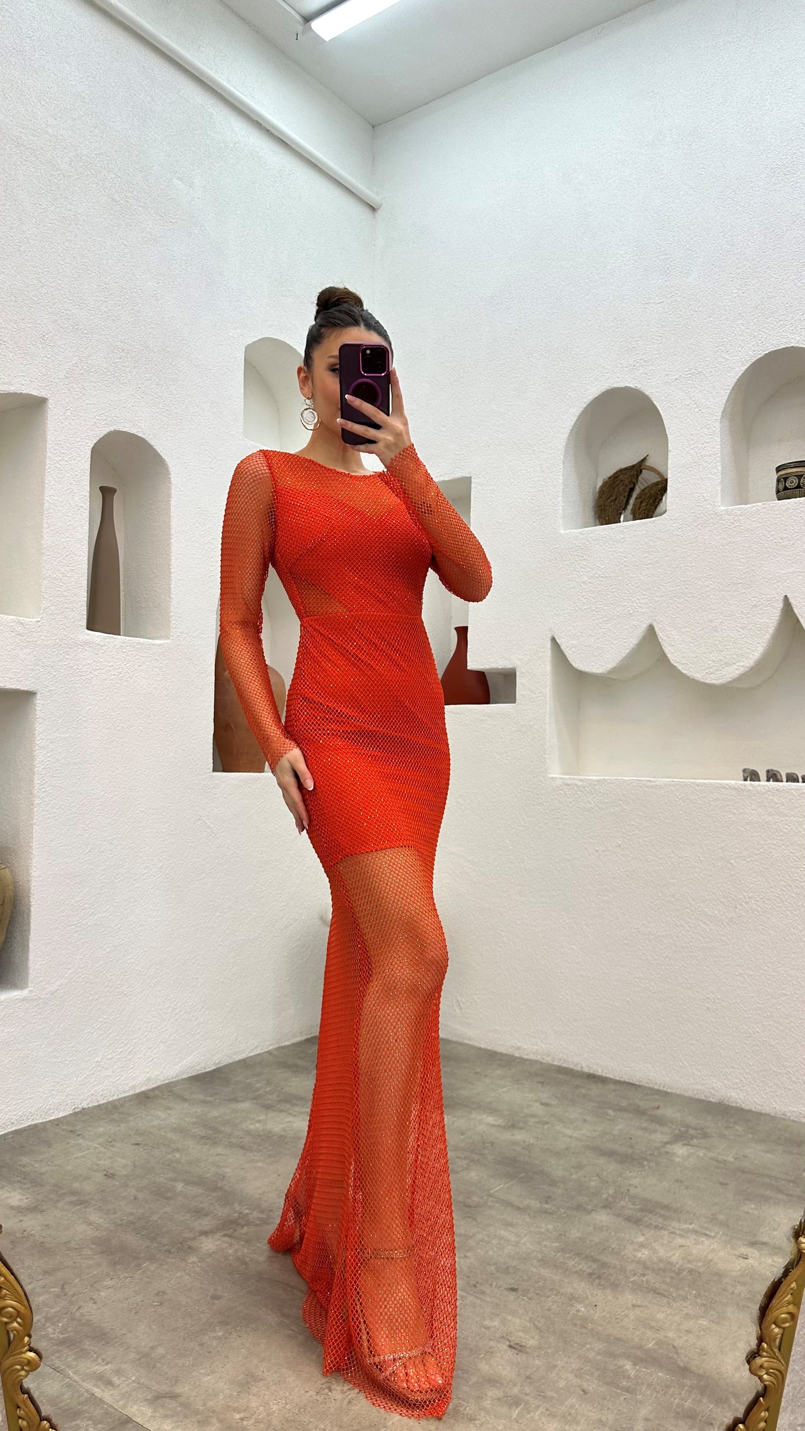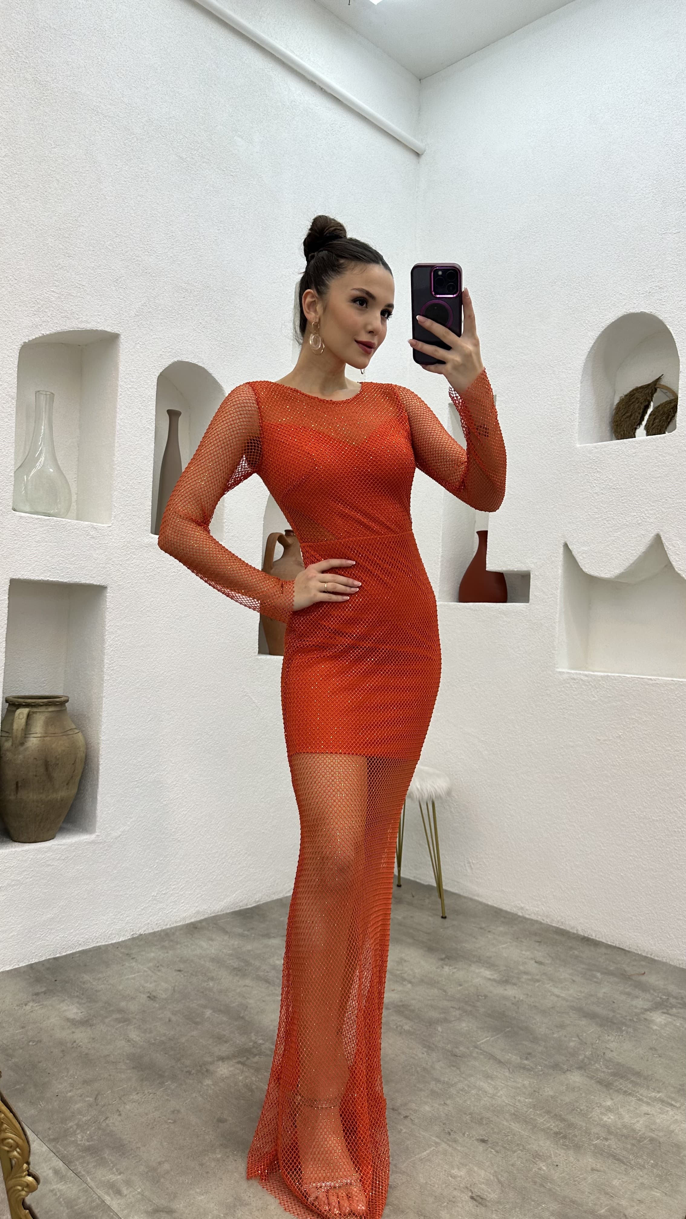 • Turuncu Uzun Kol Fileli Abiye Elbise