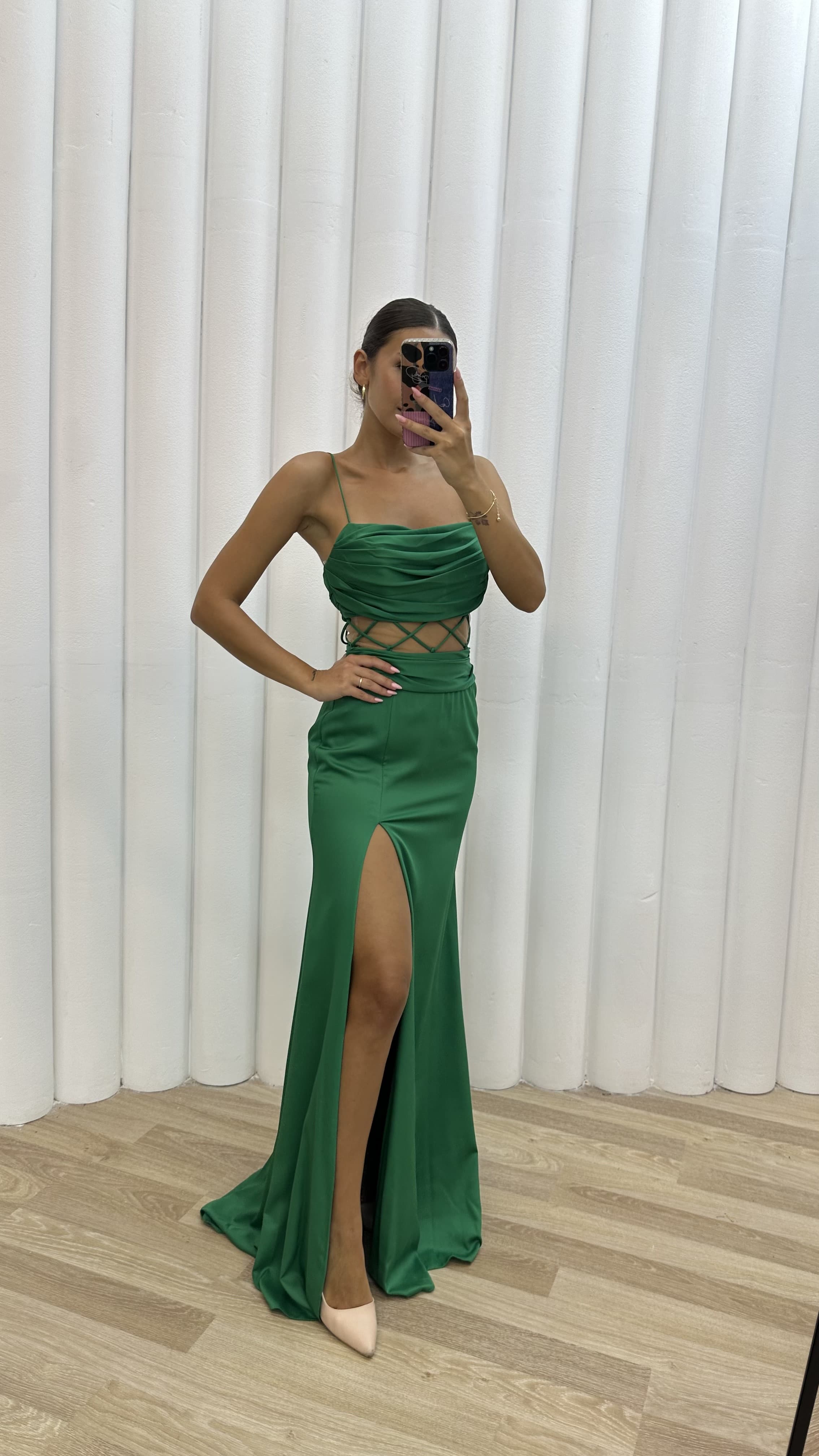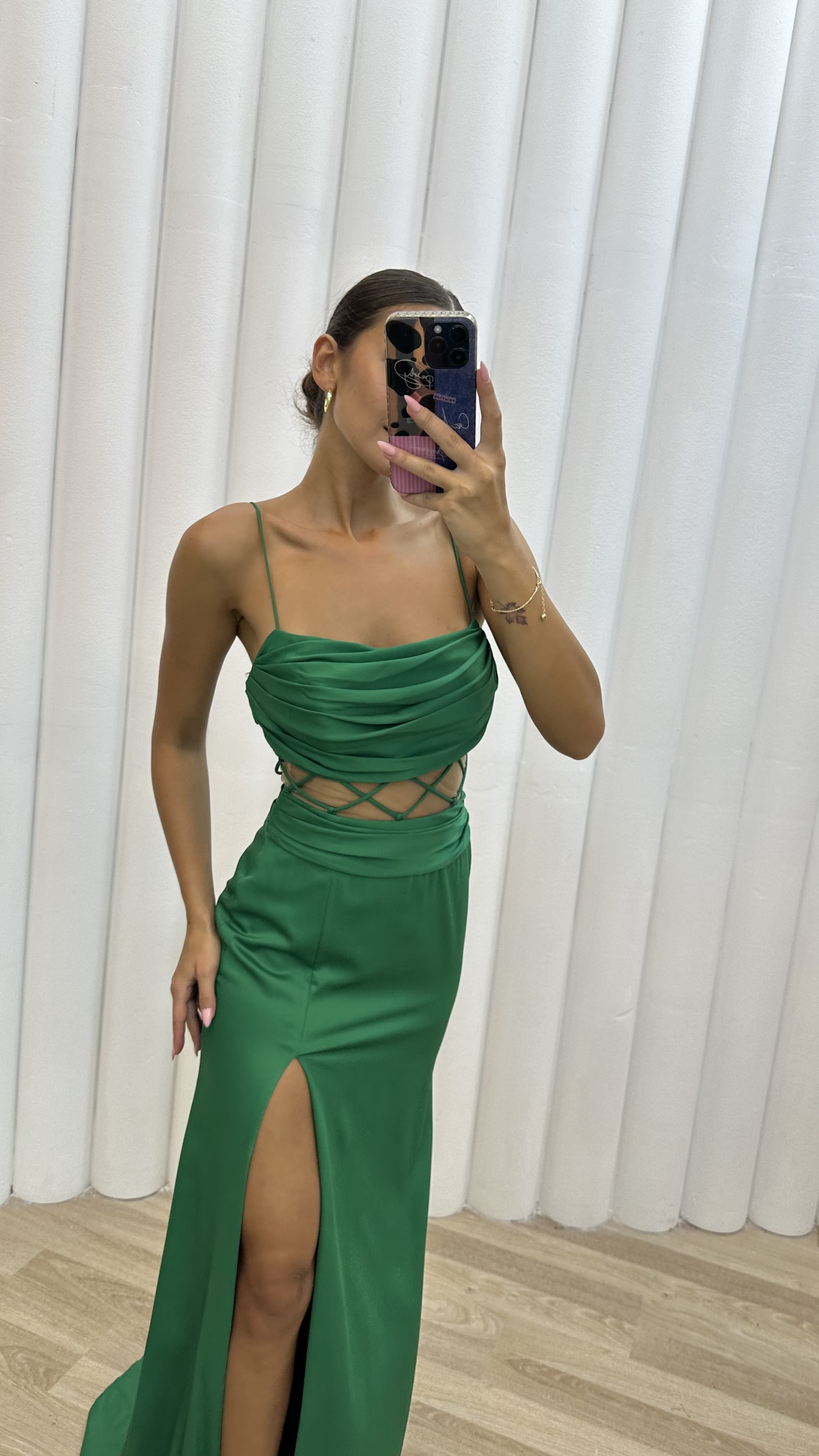 • Yeşil İp Askılı Beli Çapraz Detay Büzgülü Abiye Elbise