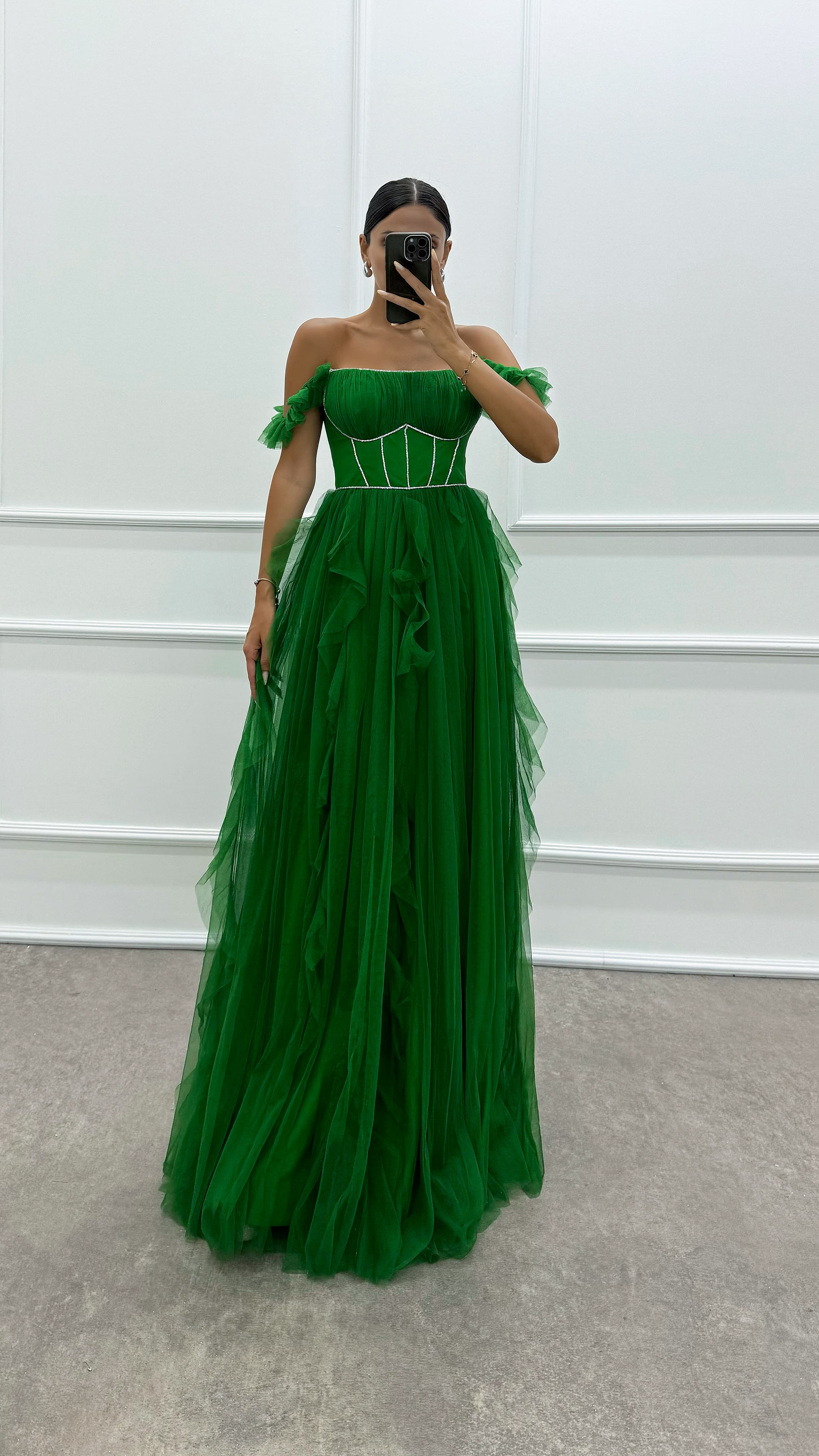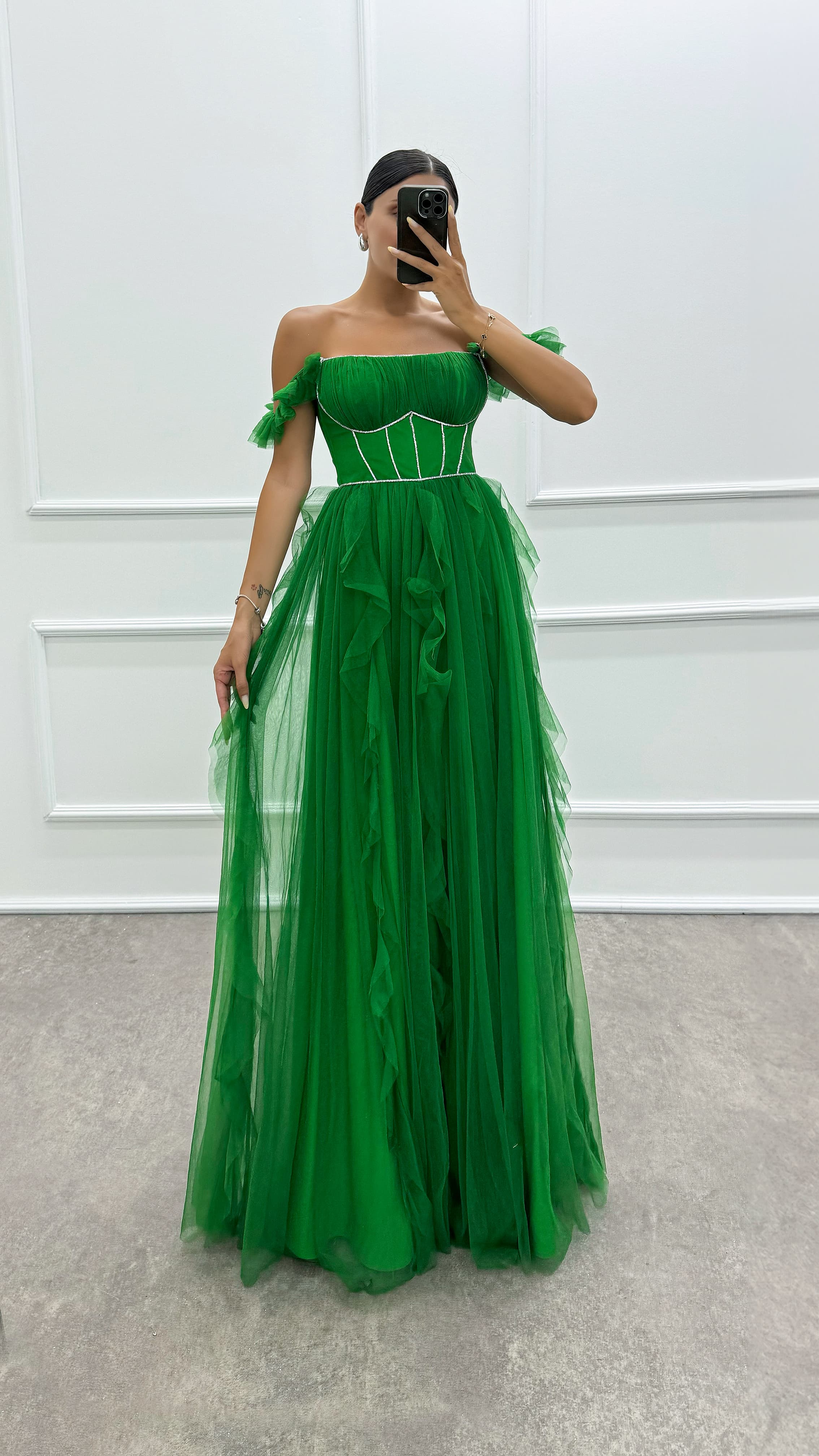 • Yeşil Omuz Detay Tasarım Tül Elbise