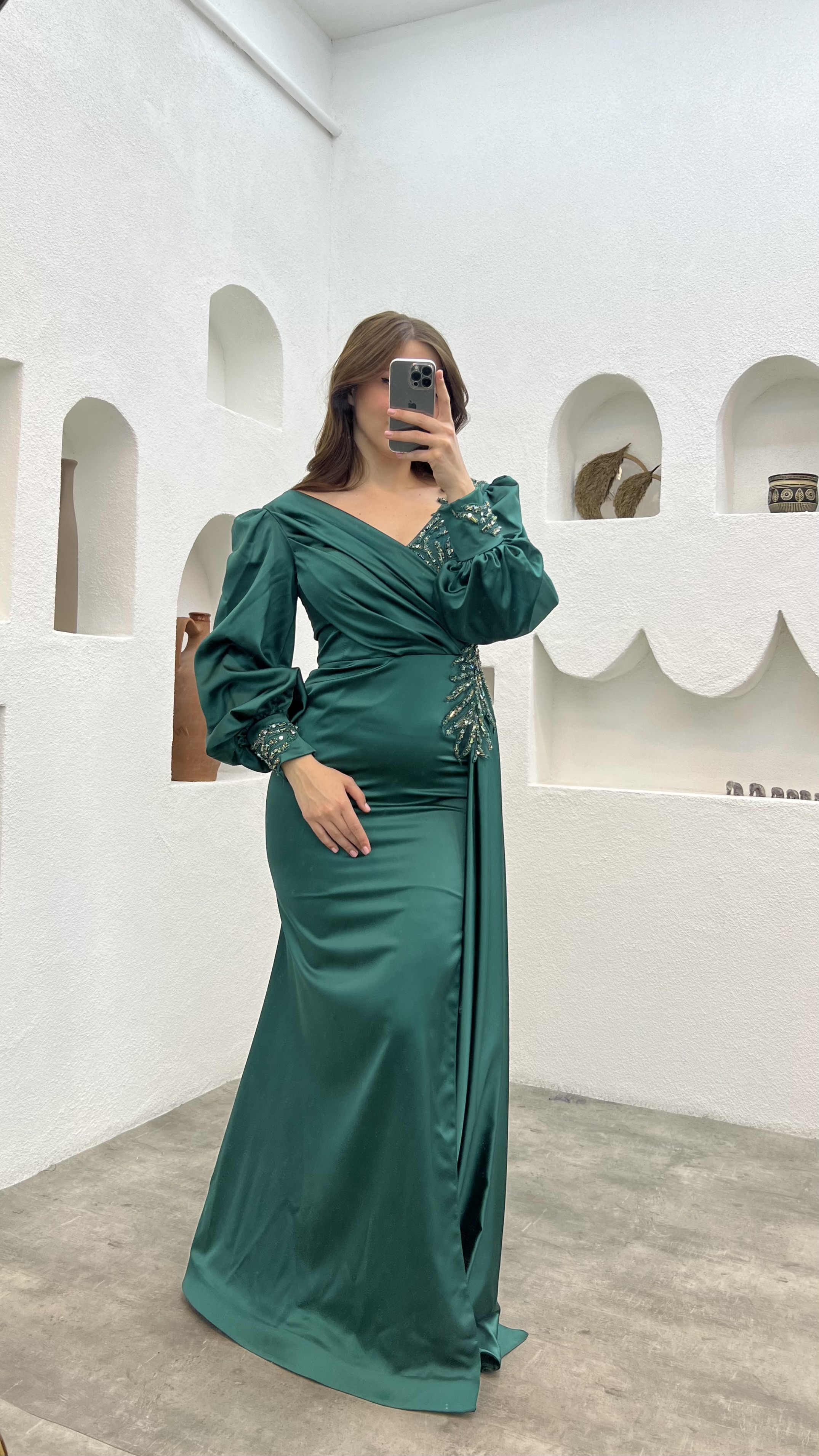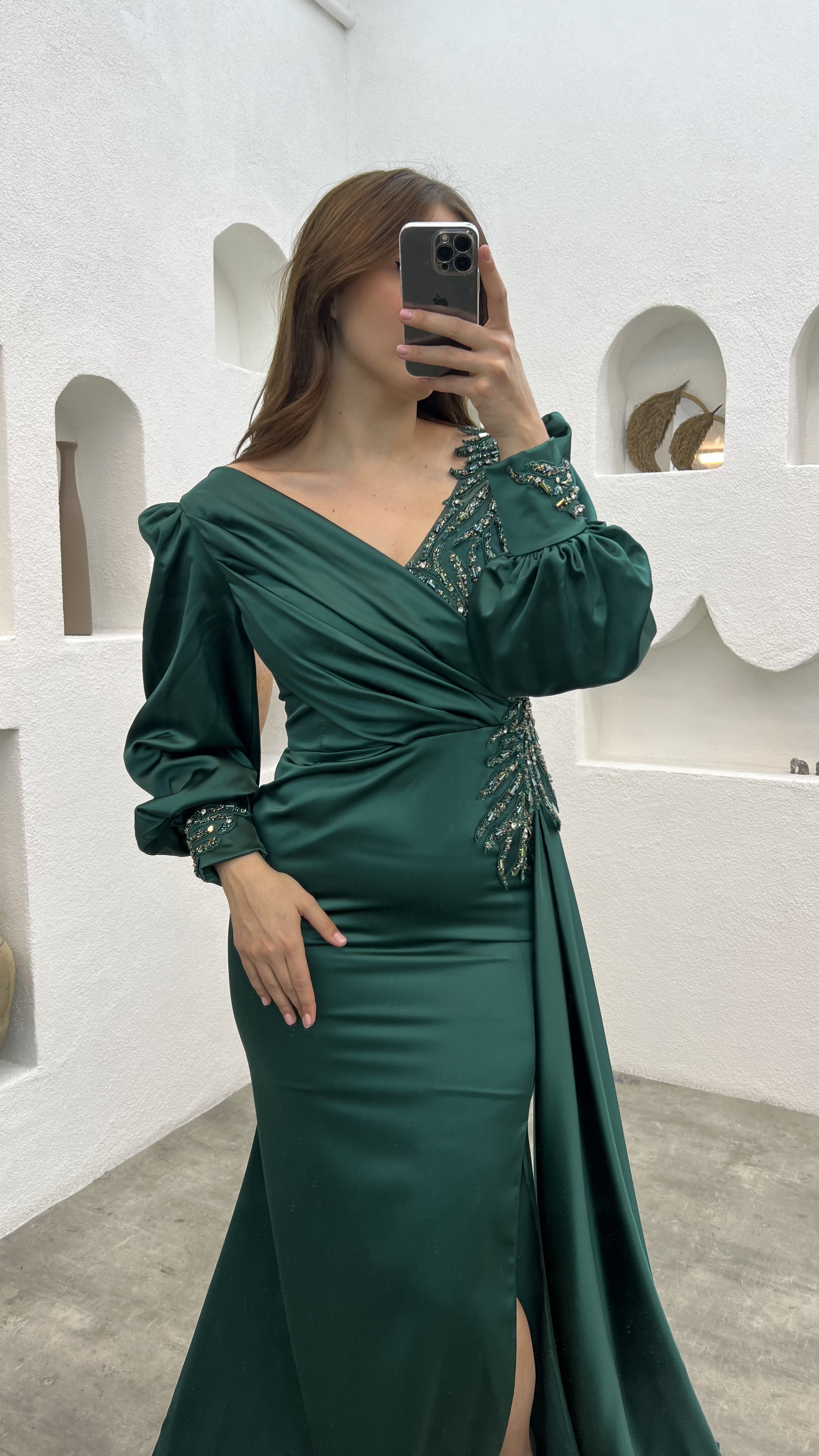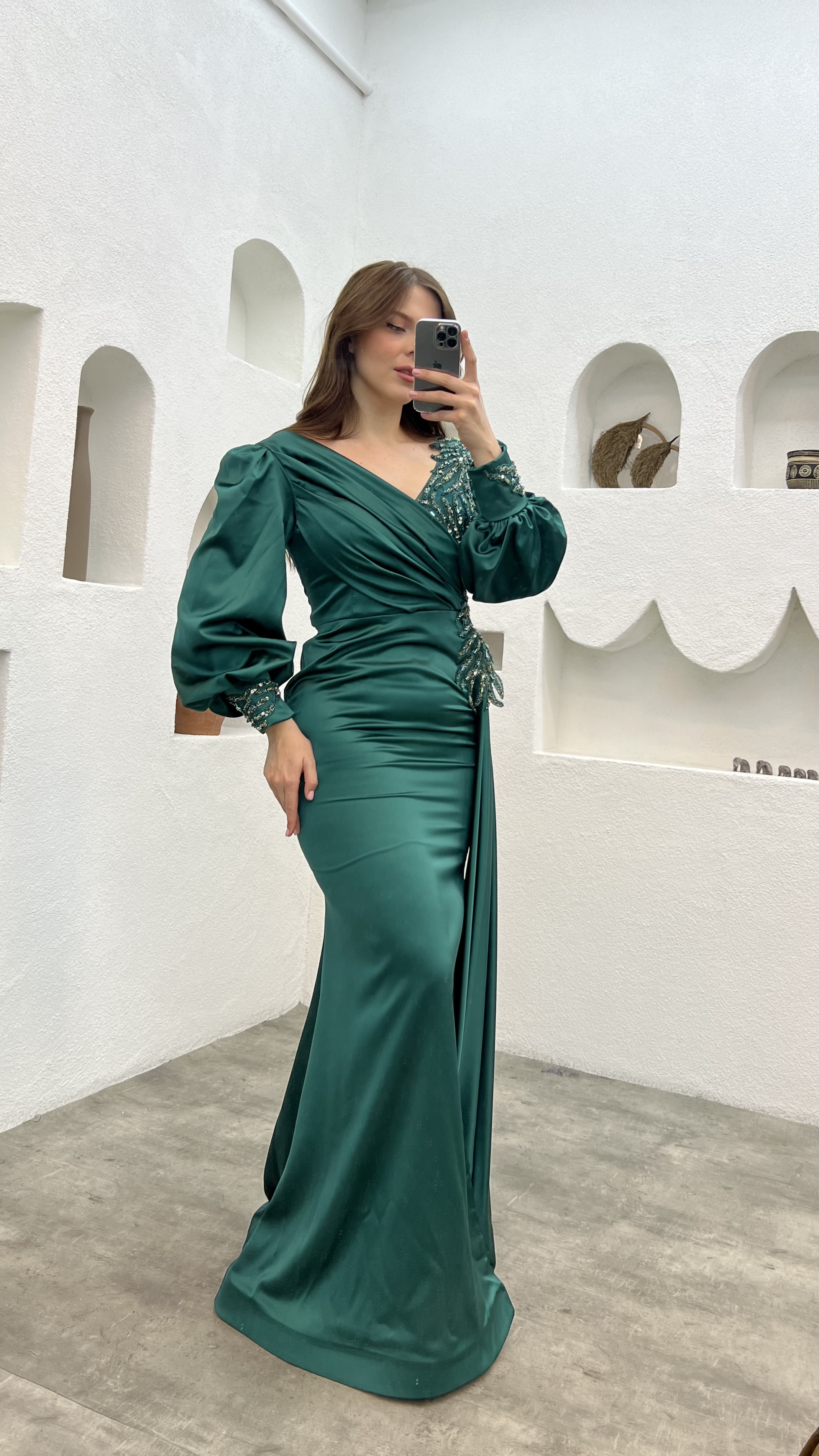 • Zümrüt Balon Kol İşlemeli Büyük Beden Abiye Elbise