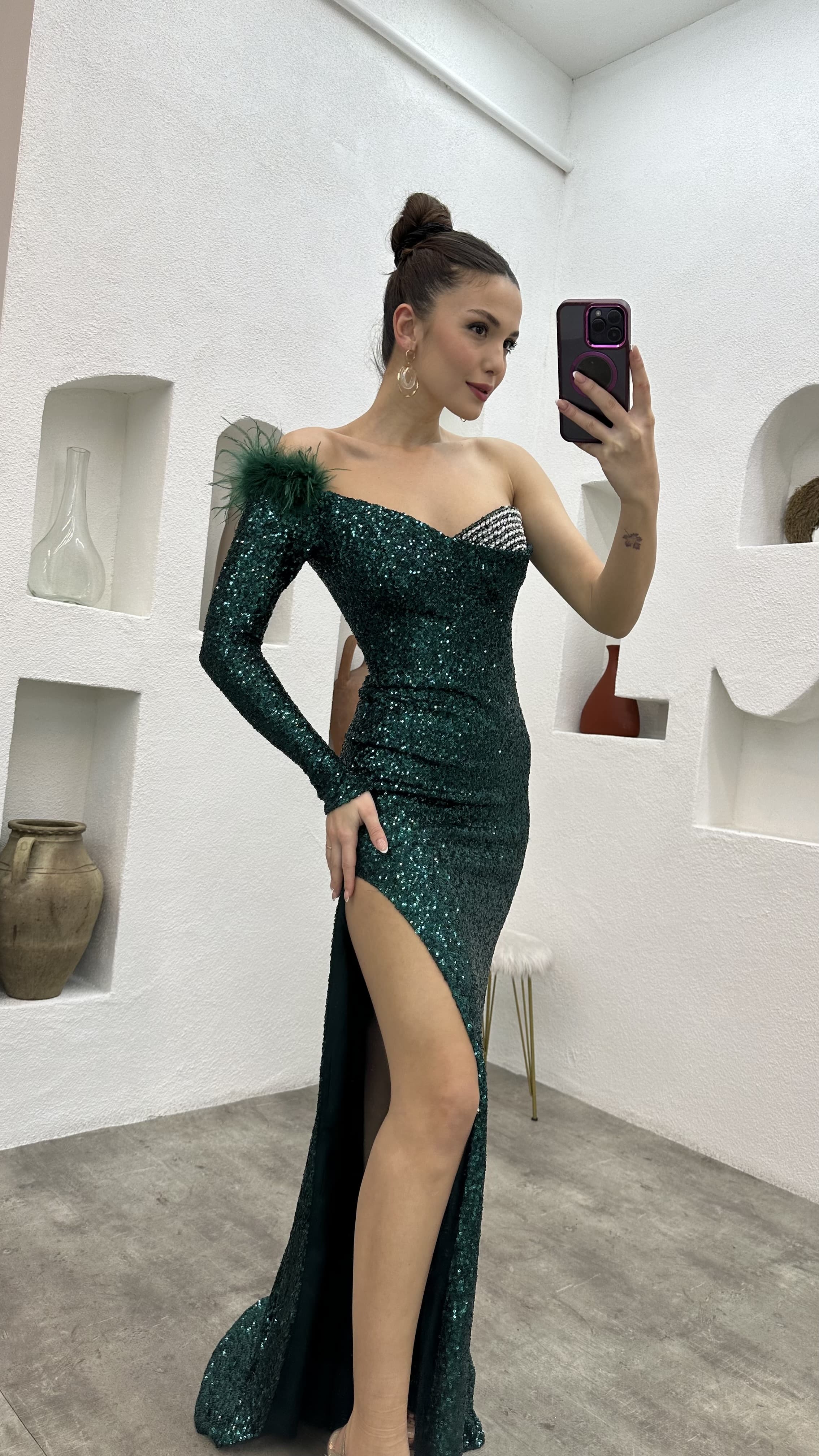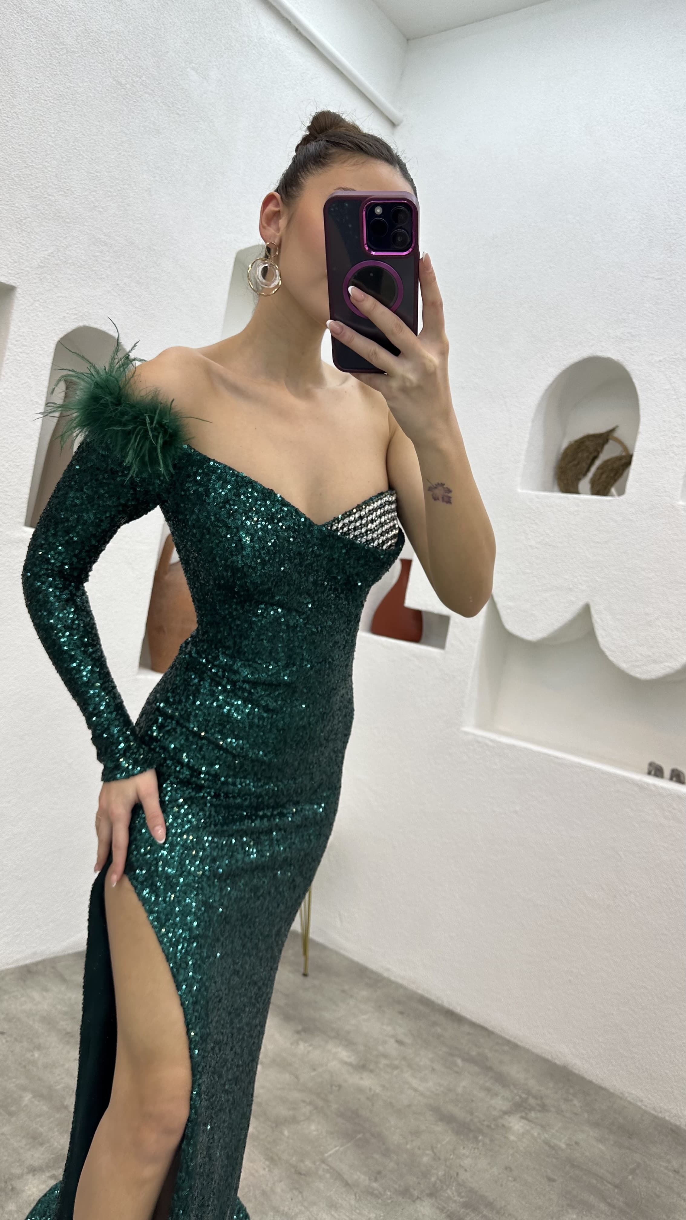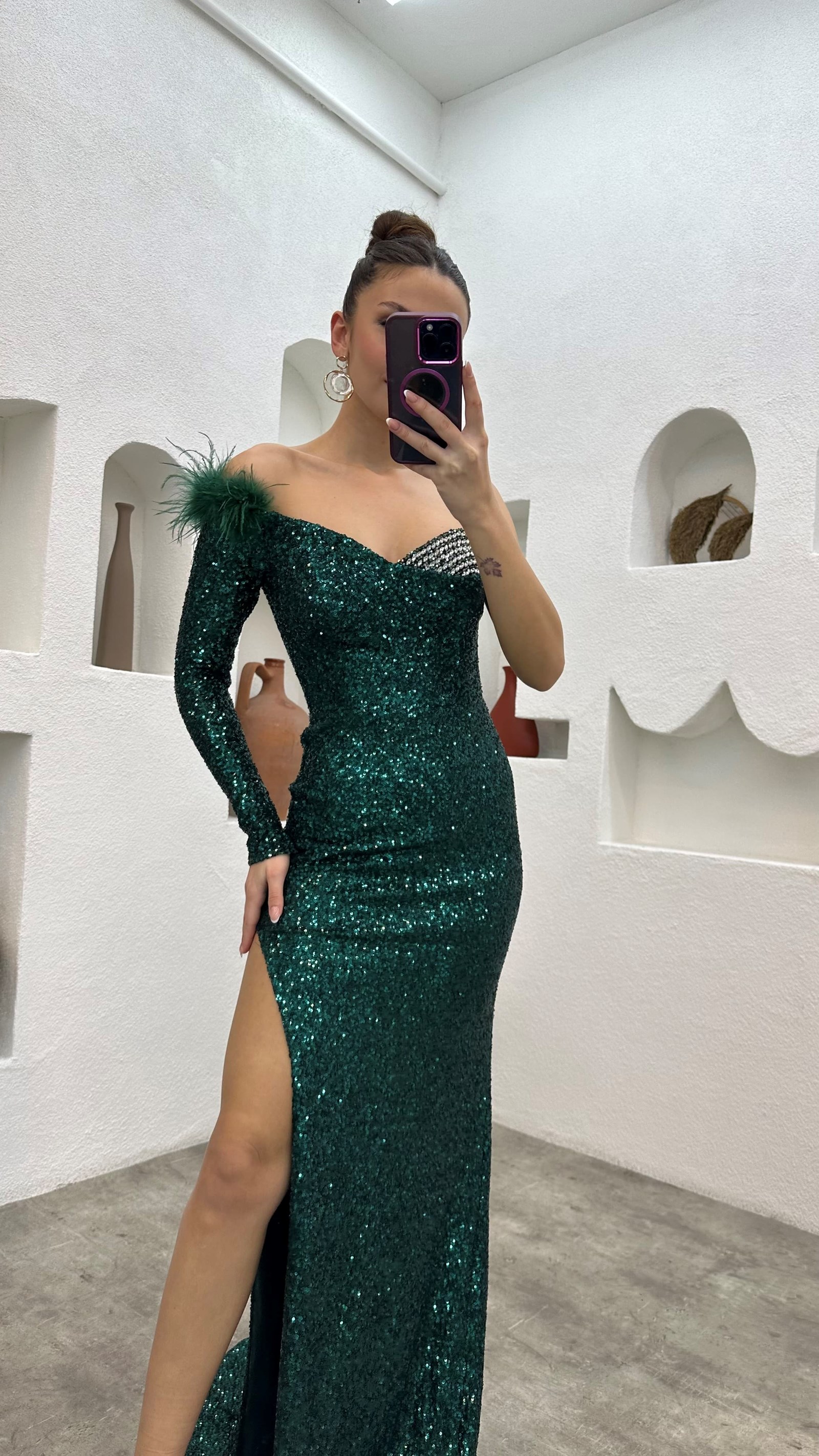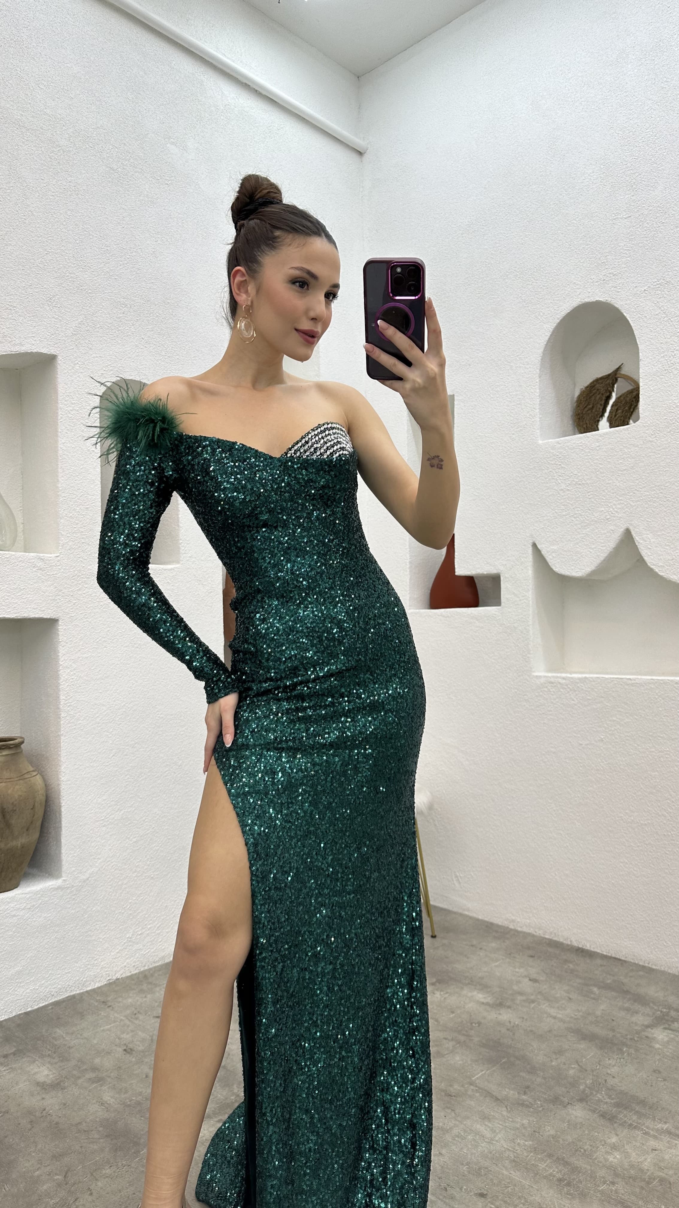 • Zümrüt Tek Kol Tüy Detay İşlemeli Pul Payet Abiye Elbise
