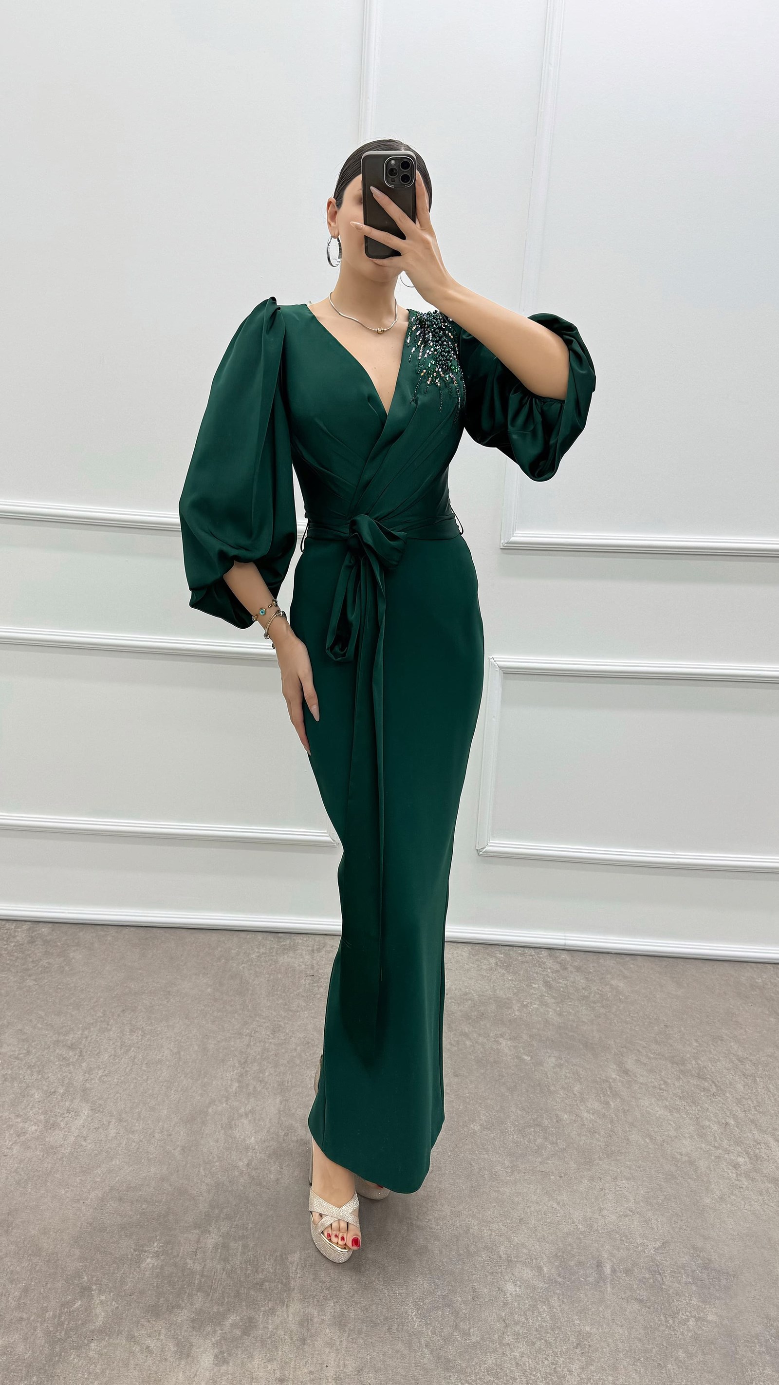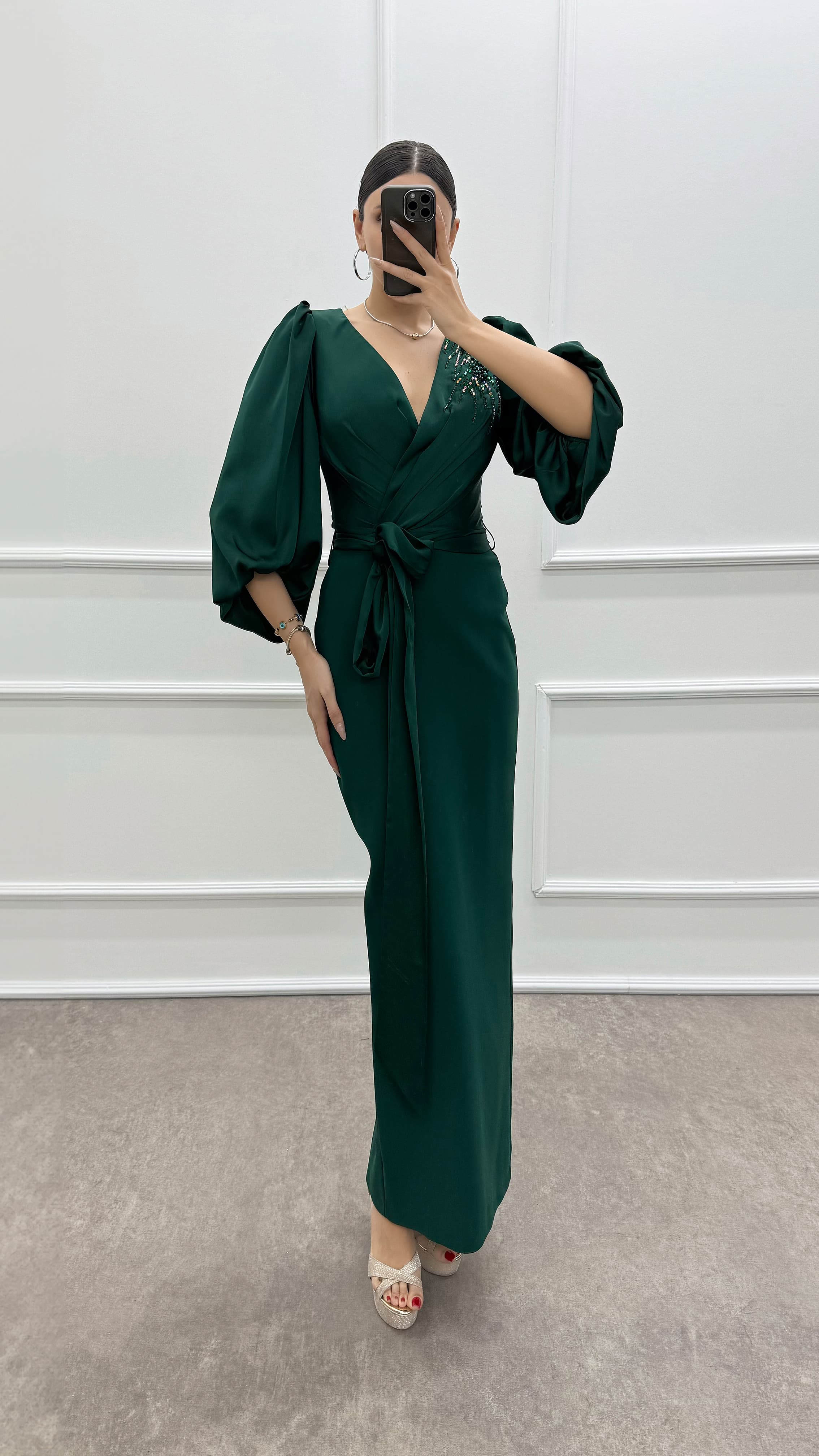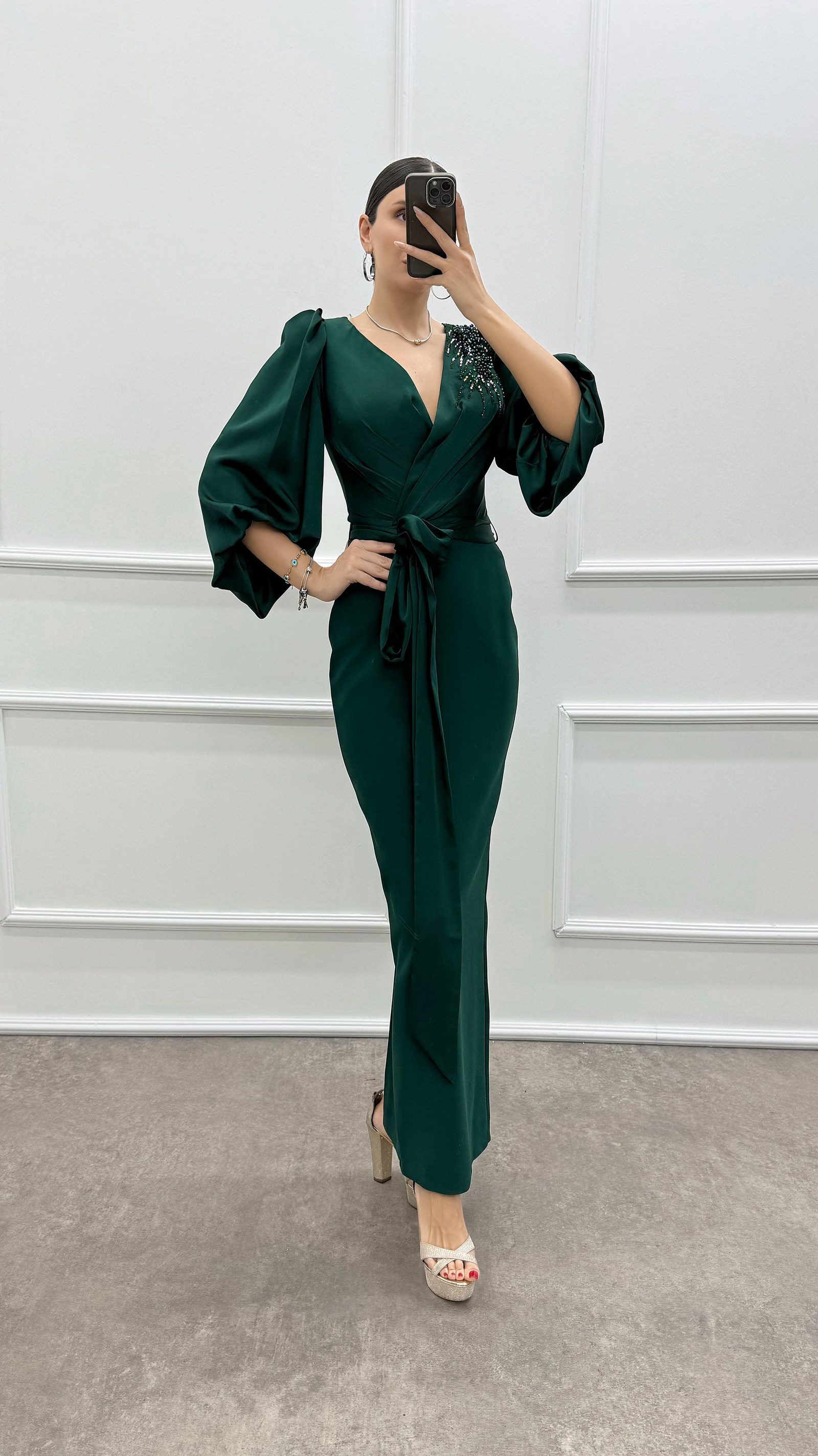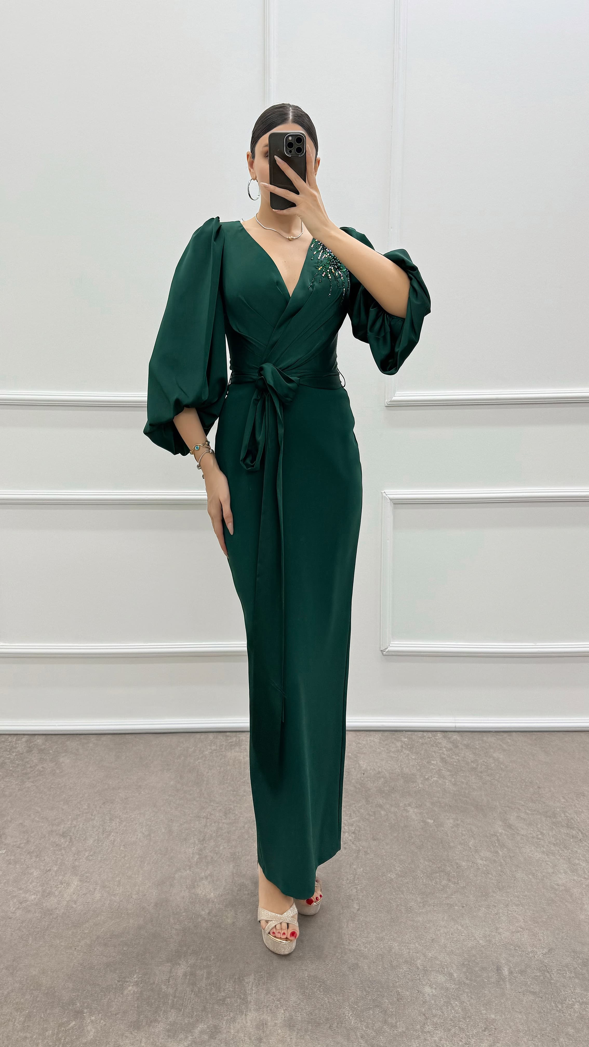 • Vestido verde esmeralda con manga globo y cuello cruzado con detalle de abalorios en los hombros