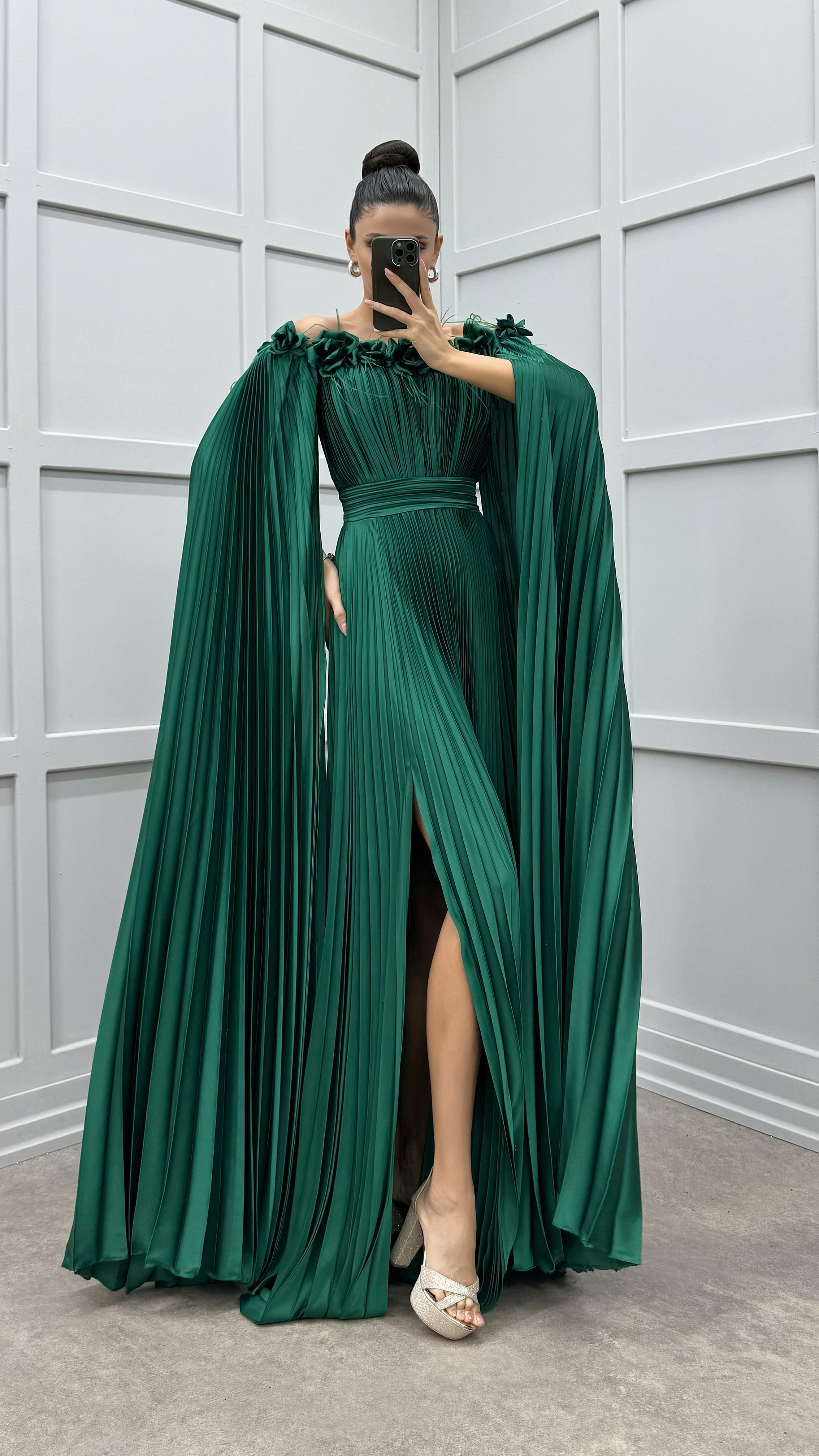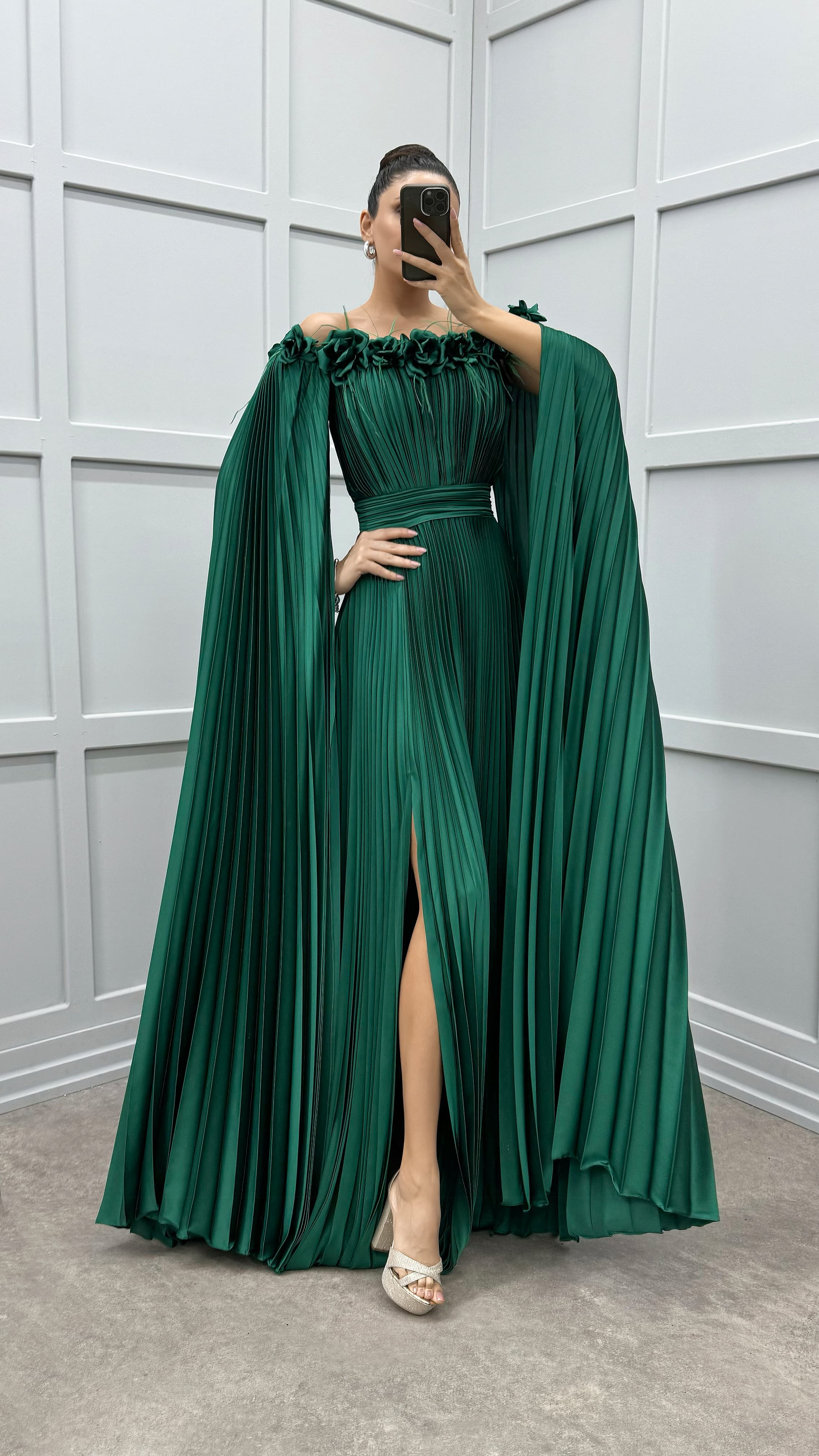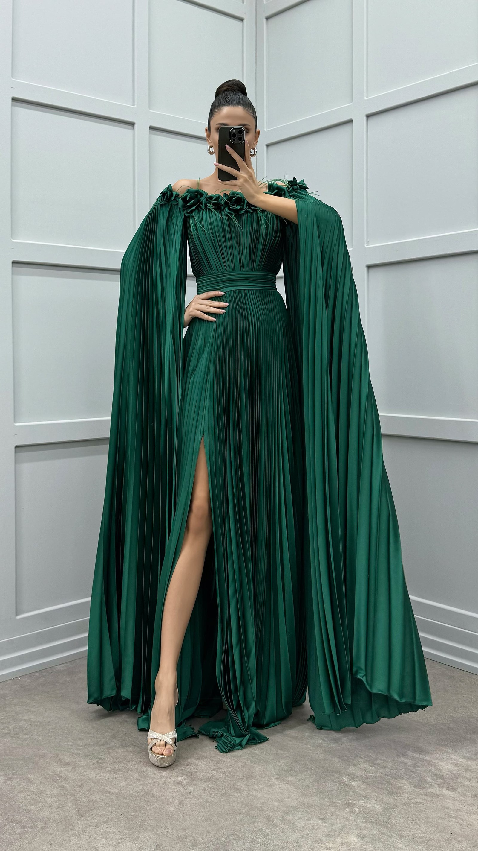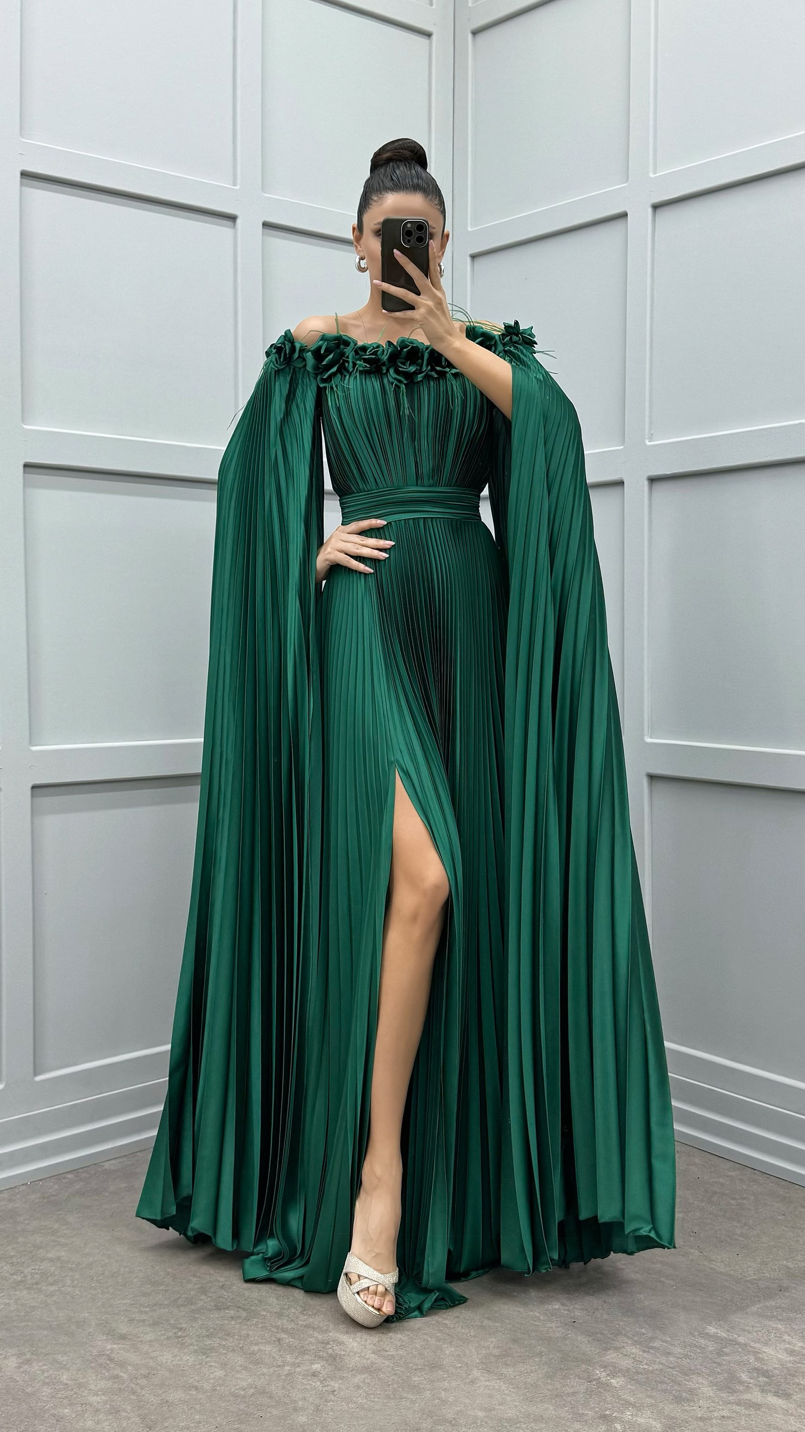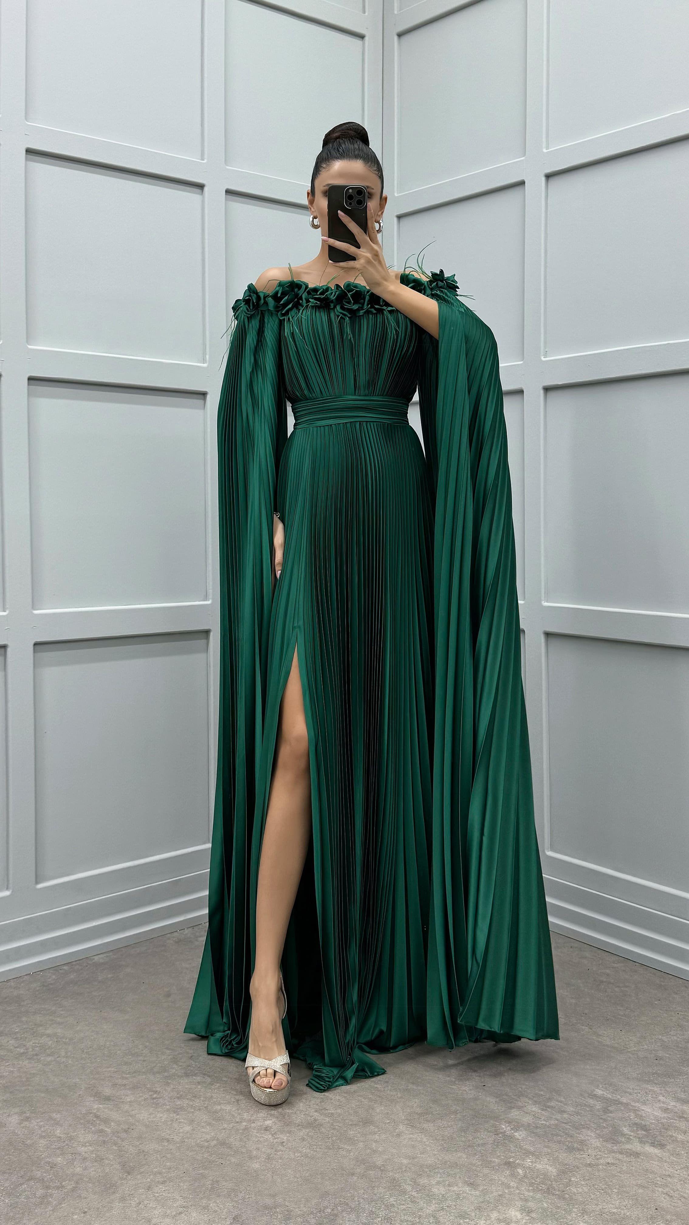Vestido plisado de plumas con detalle de rosas en el pecho y los hombros de color verde esmeralda