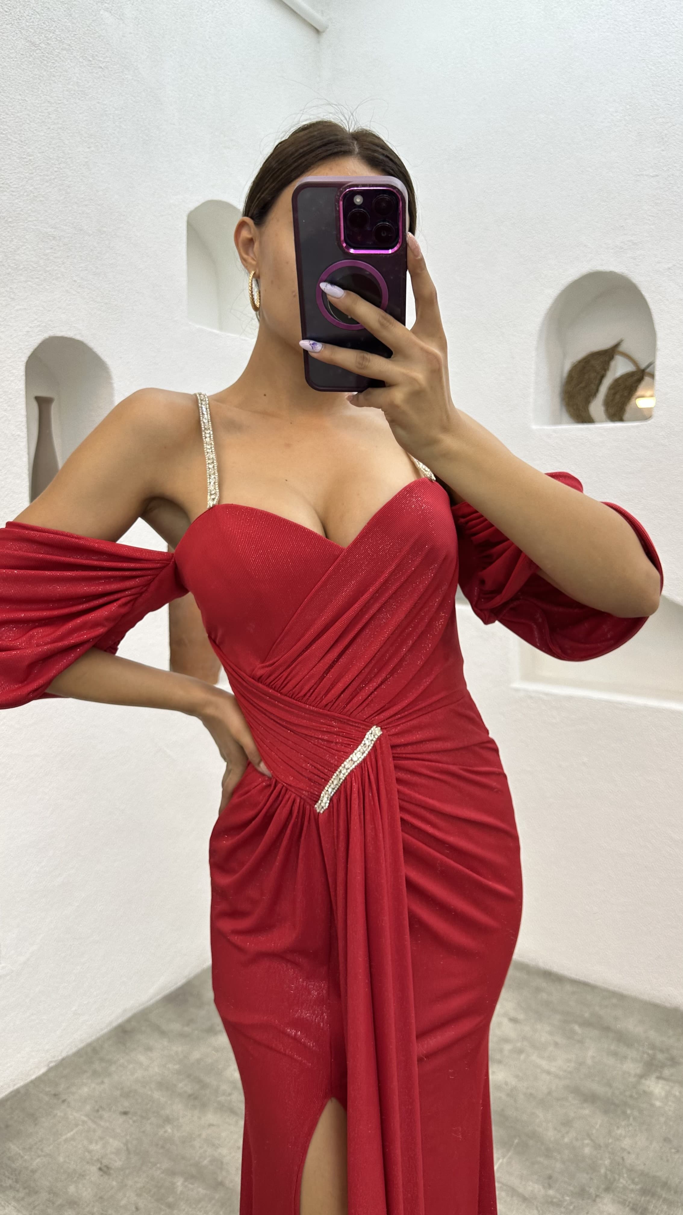 • Kırmızı İp Askılı Balon Kol Bel Detay Abiye Elbise