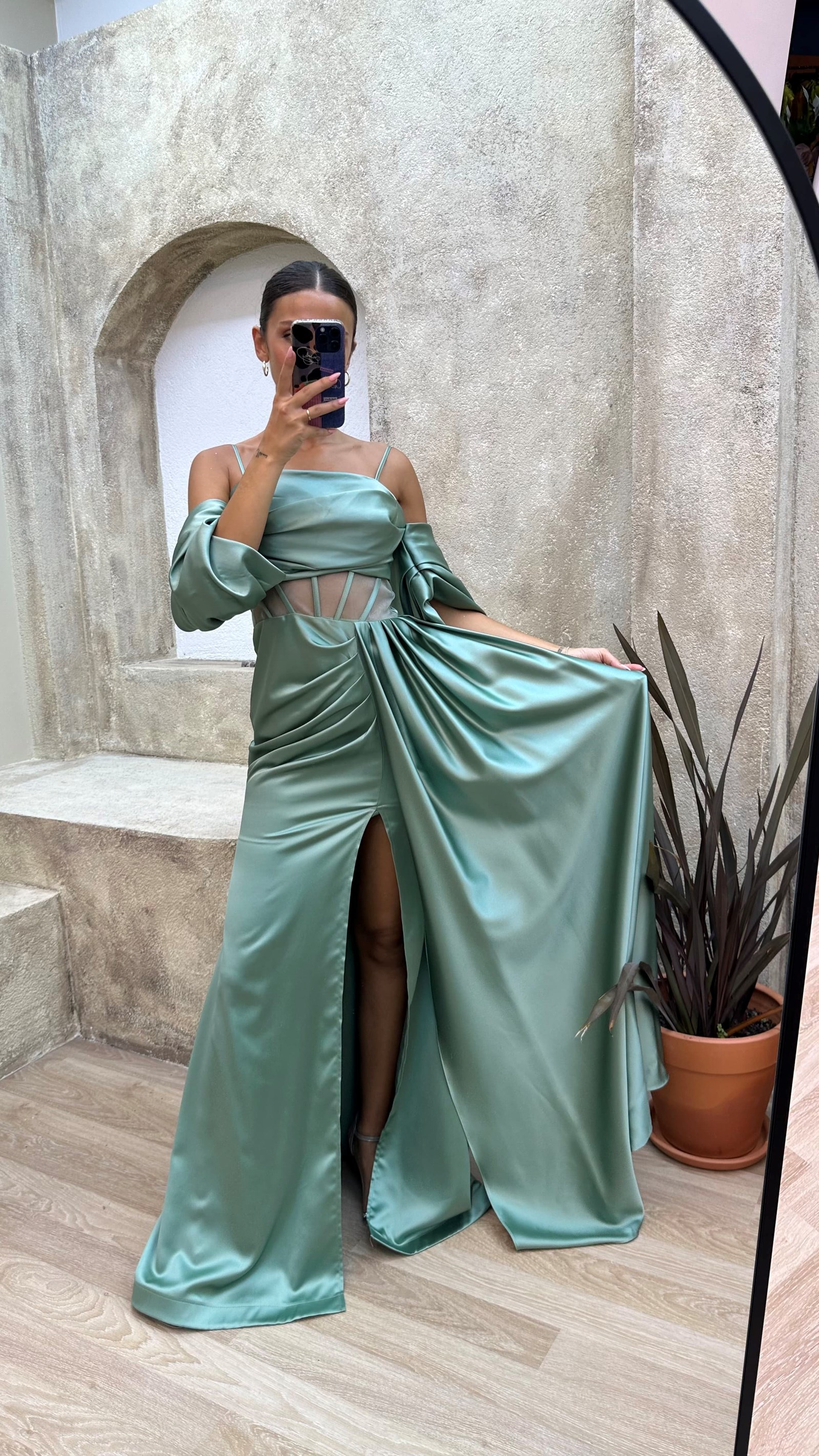 • Mint Yeşili İp Askılı Transparan Detay Saten Abiye Elbise