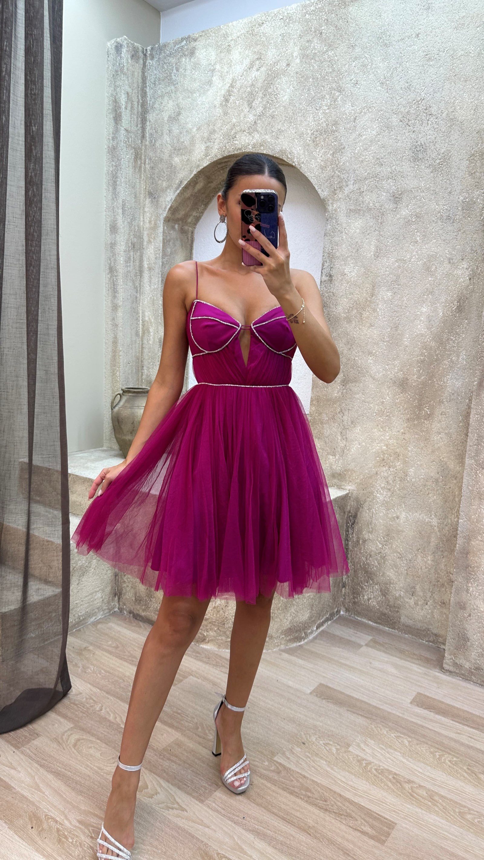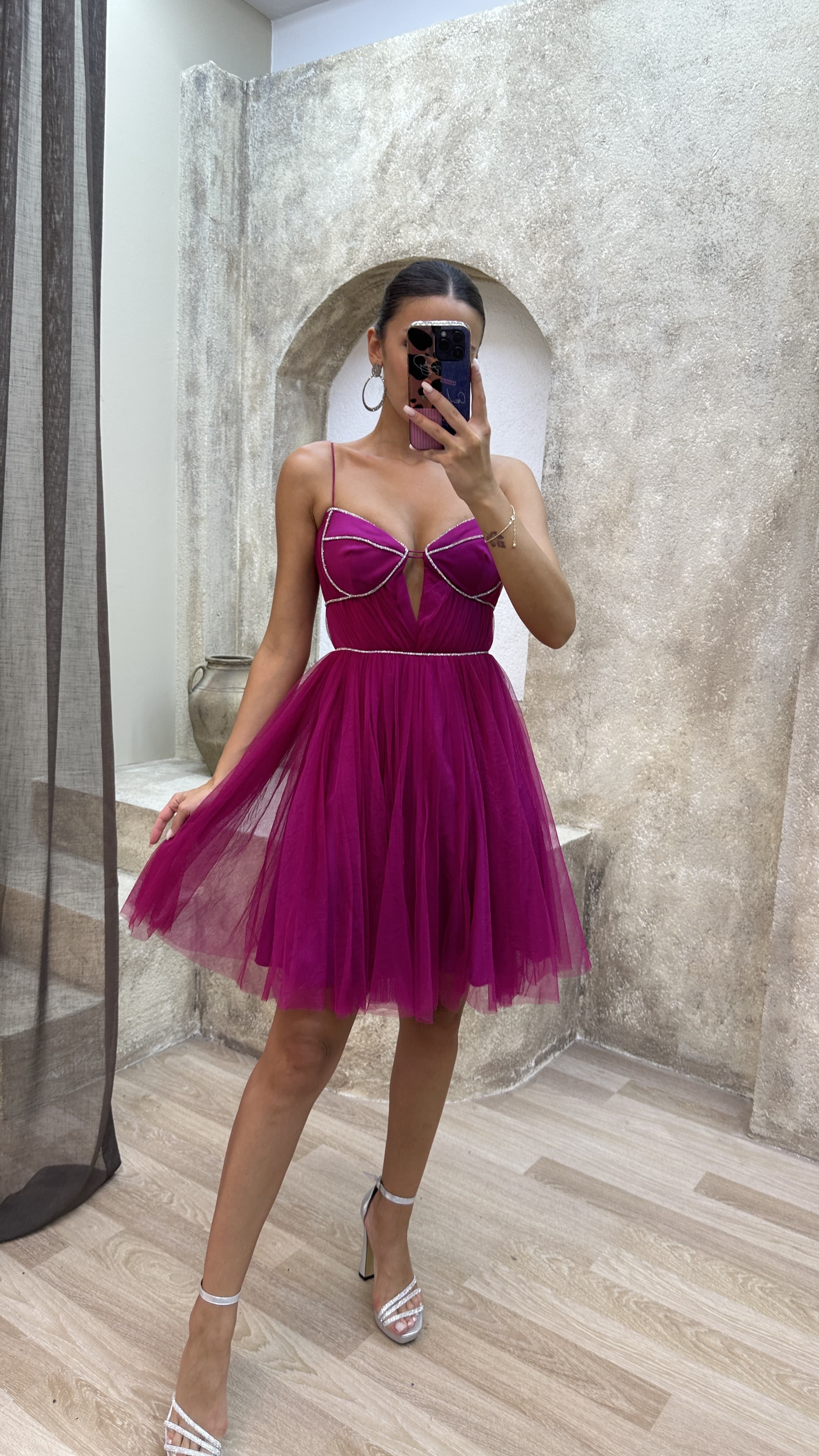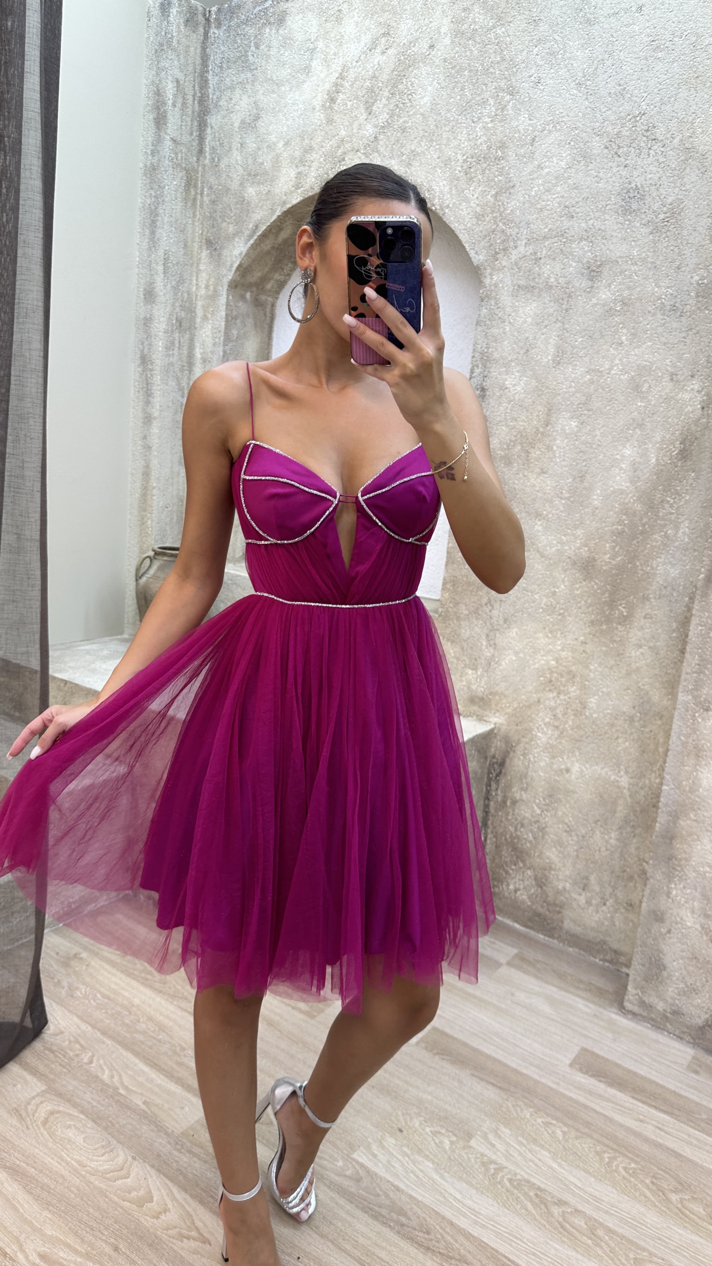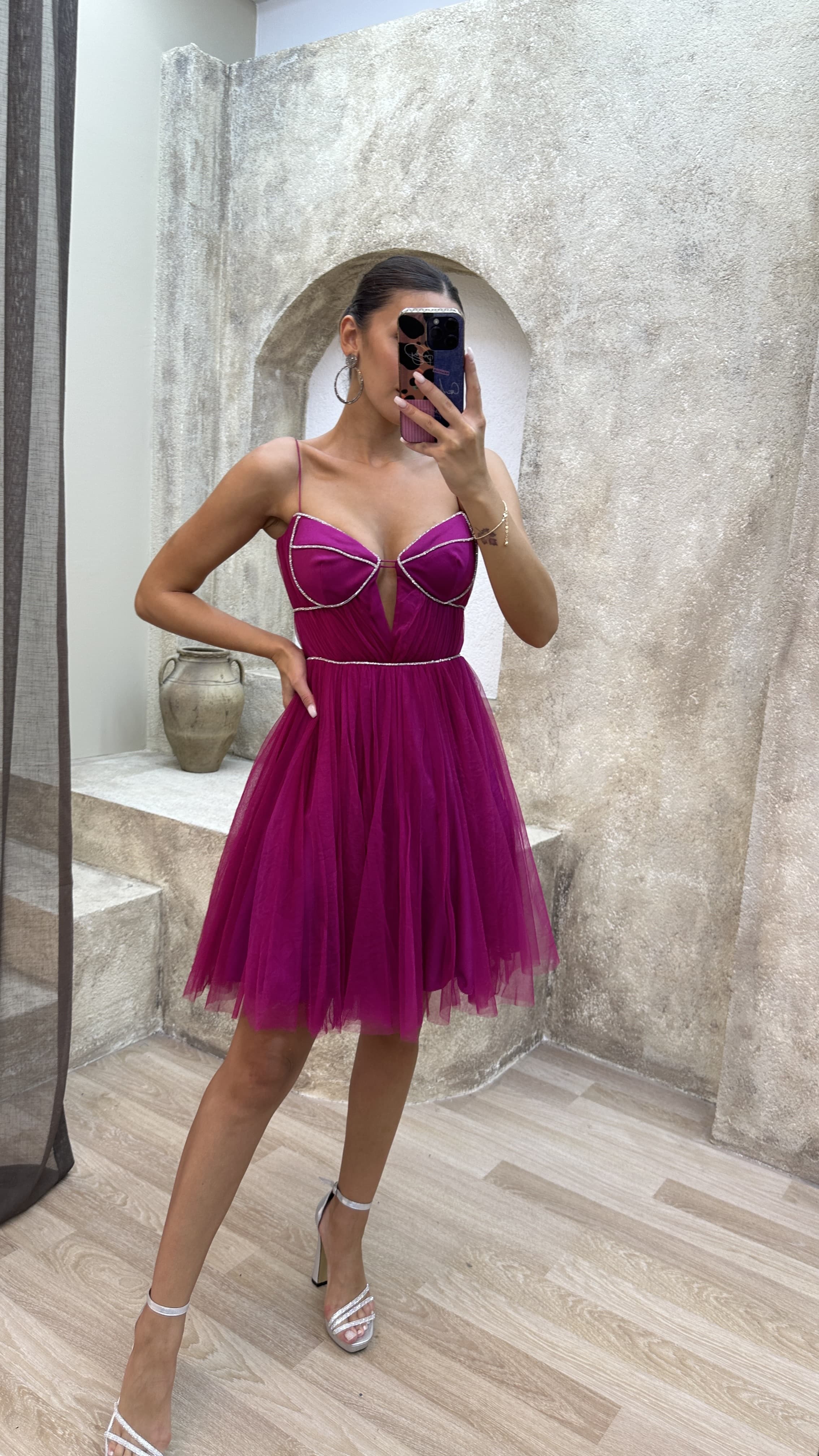 • Fuşya İp Askılı İşlemeli Tül Elbise