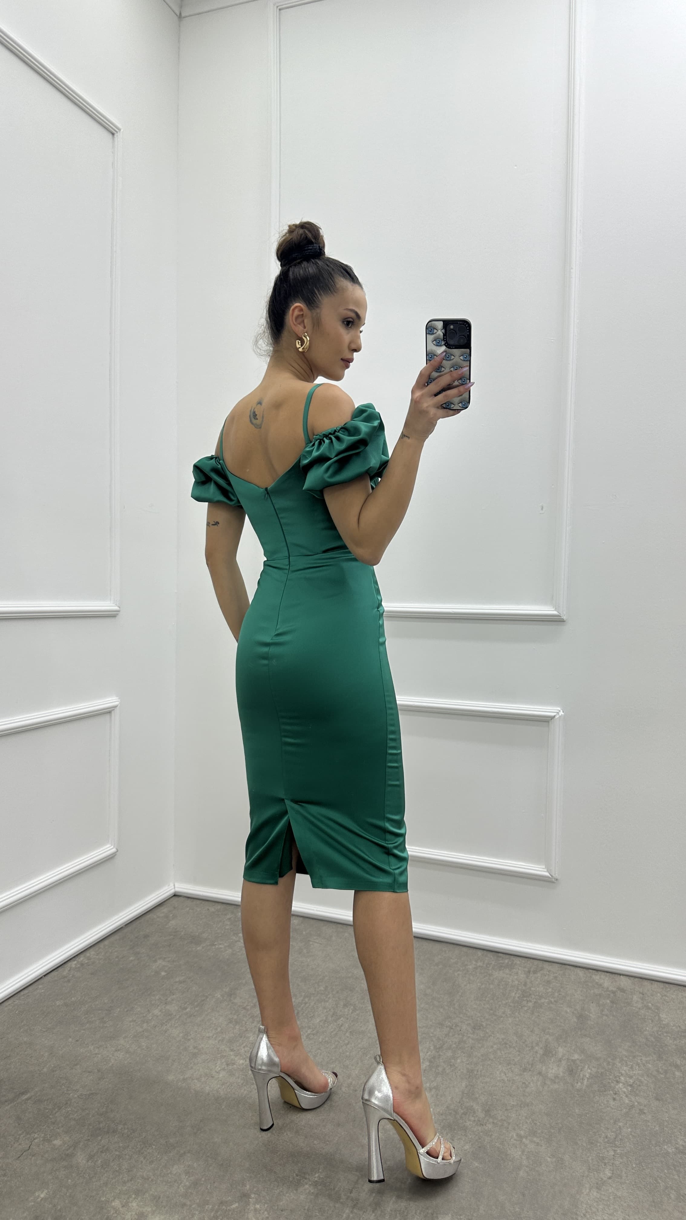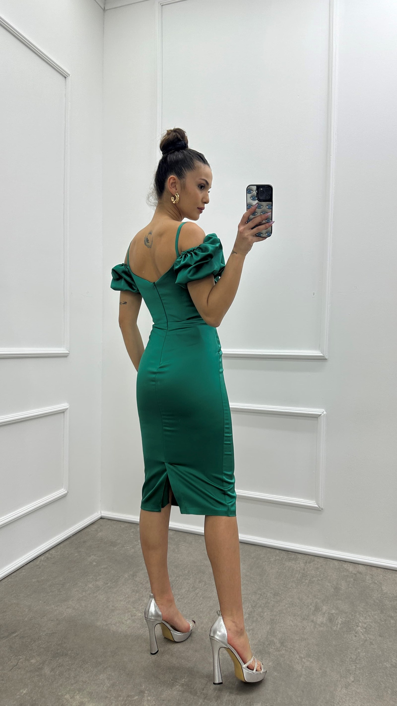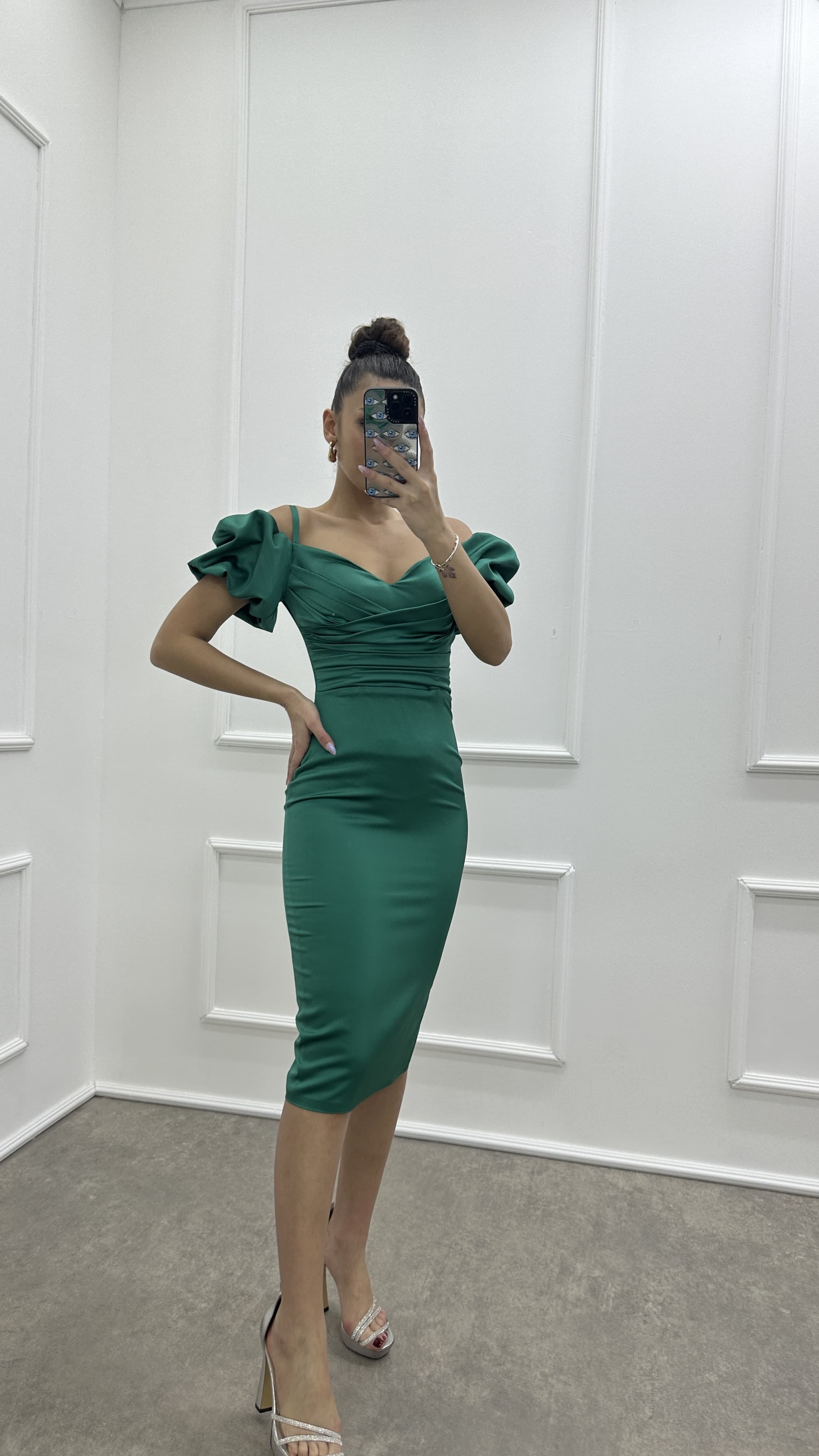 Vestido lápiz con diseño de detalle de manga drapeada verde esmeralda