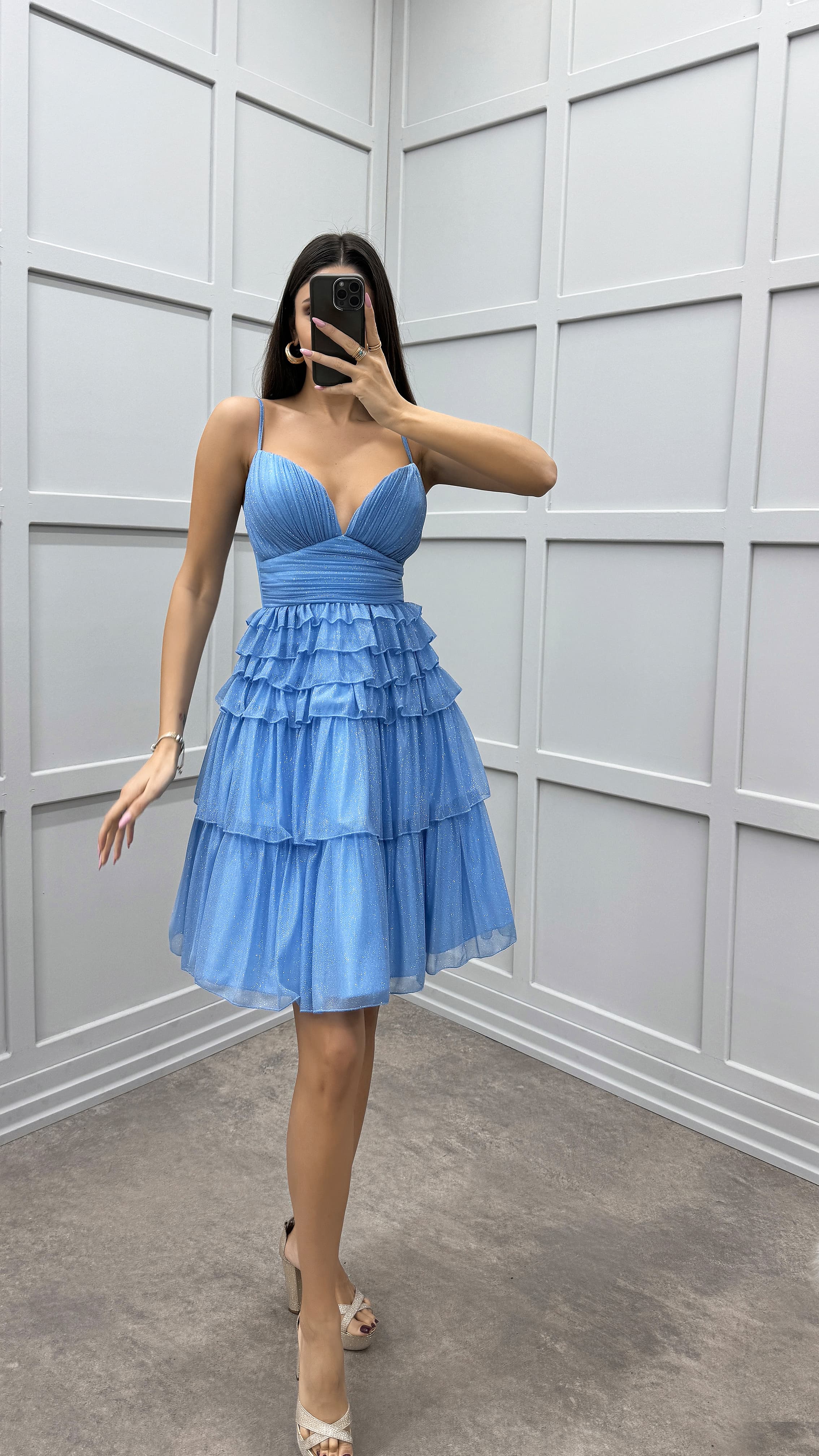 • Mavi İp Askılı Kat Kat Tasarım Mini Elbise
