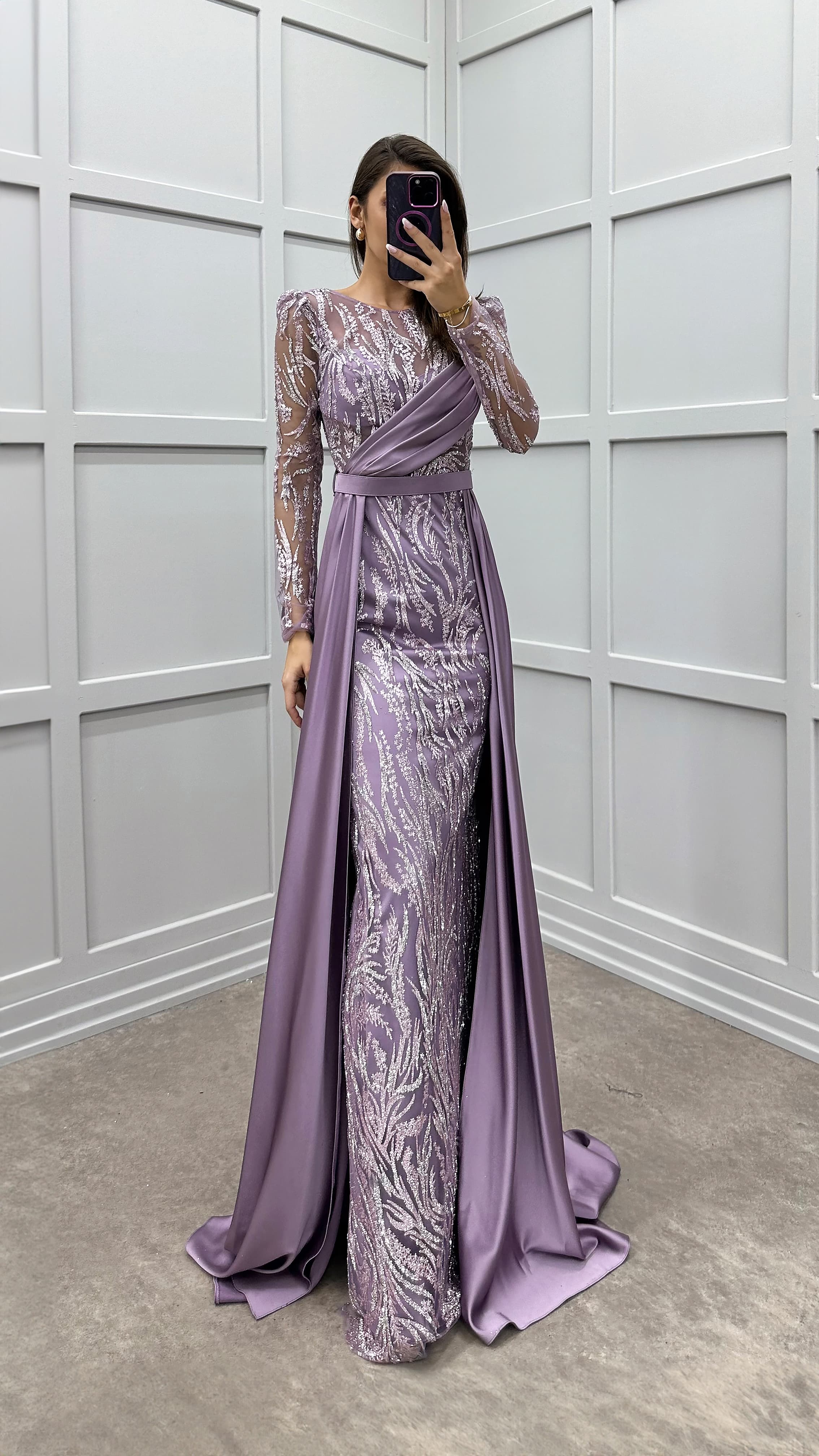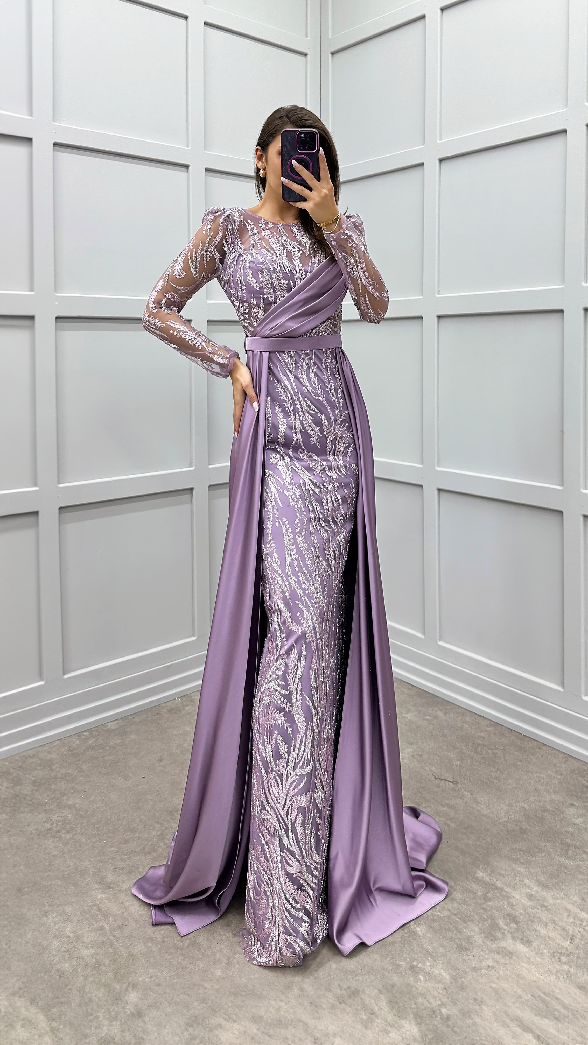 Vestido de noche con diseño bordado y detalle en el pecho color lila