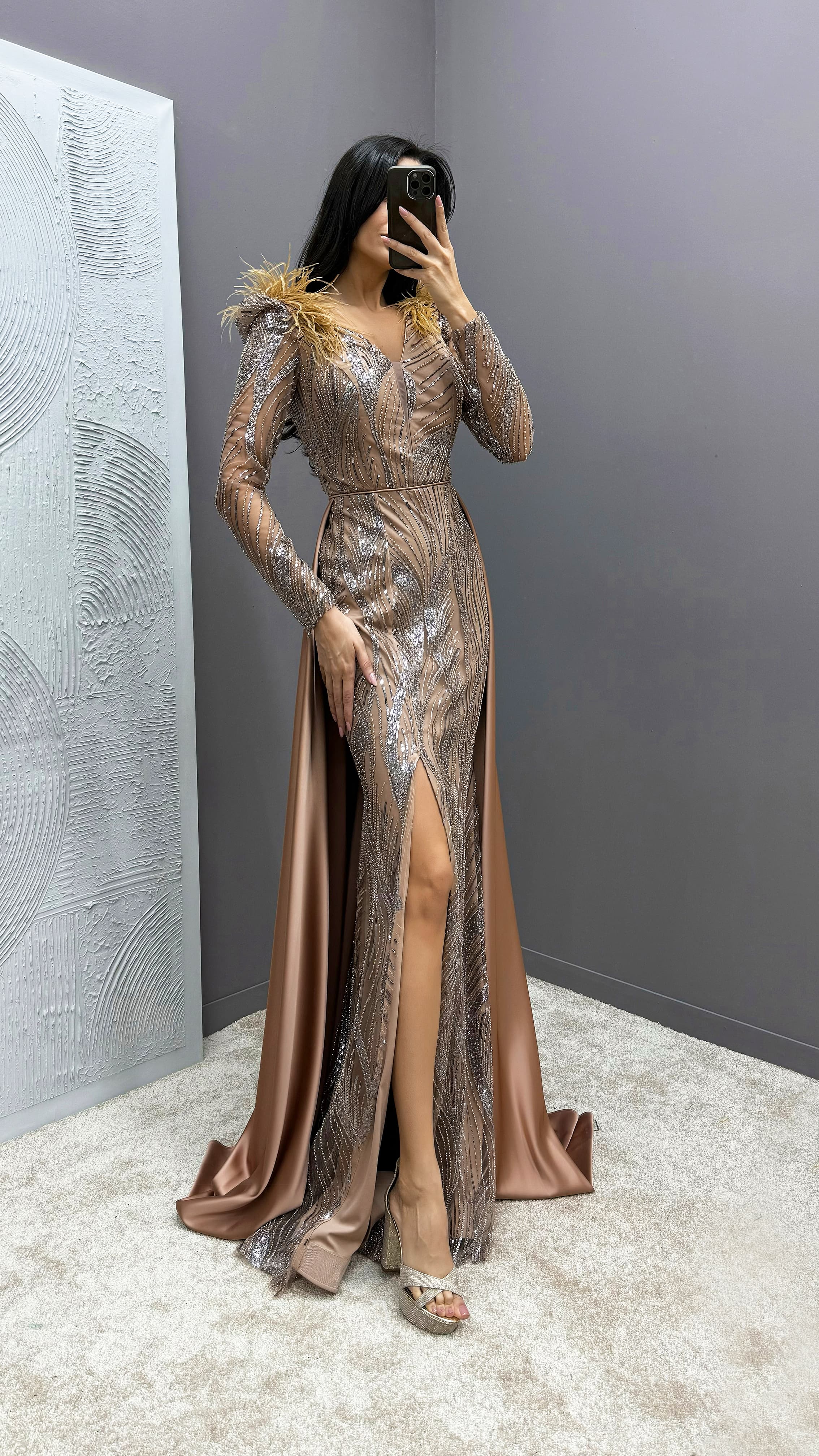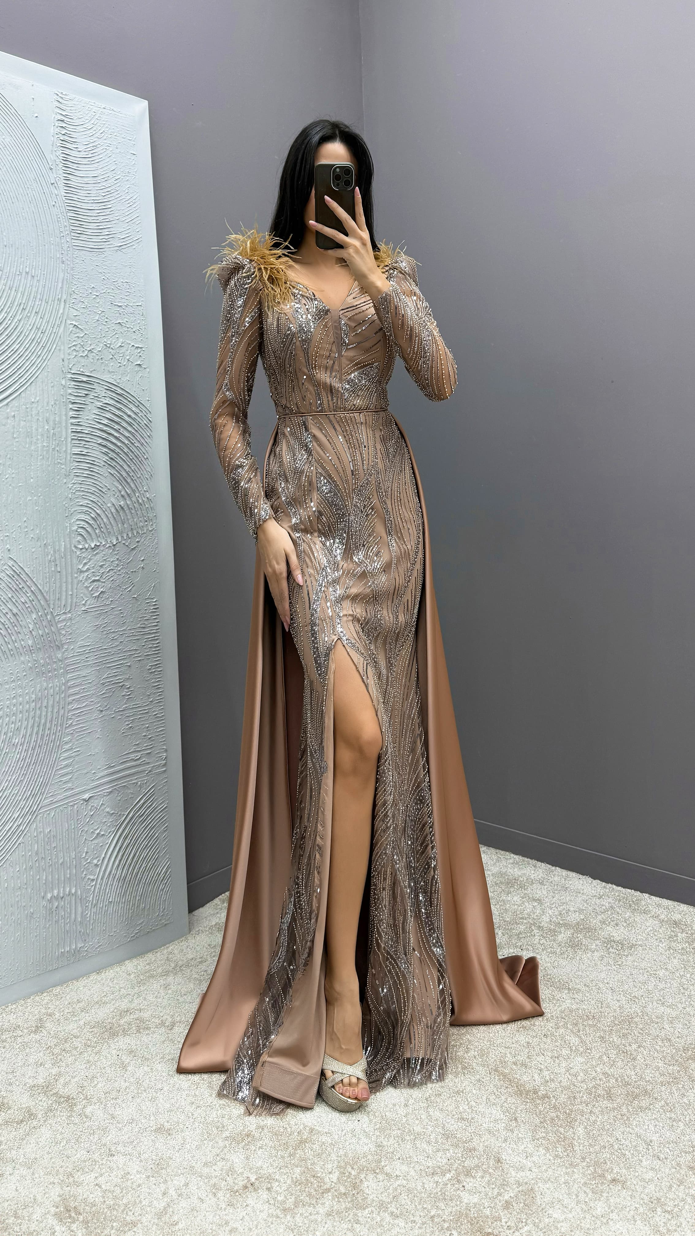 Pudra Omuzları Tüylü İşleme Detay Yırtmaçlı Abiye